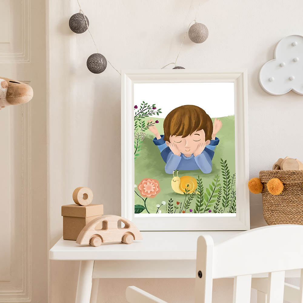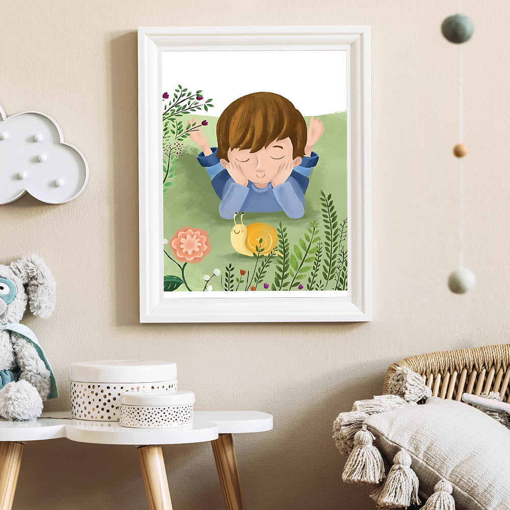 Calm Boys Room Wall Art – Child Relaxing with Snail and Flowers