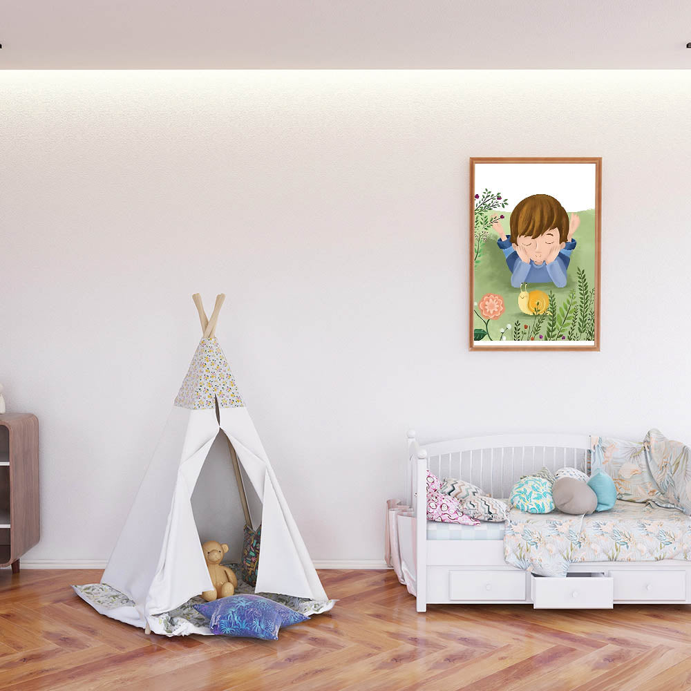 Add a touch of serenity to your child’s room with this calming boys room wall art, featuring a peaceful child lying among soft green grass, surrounded by blooming flowers and a curious snail. This gentle and tranquil scene is perfect for creating a soothing atmosphere in any nursery, bedroom, or playroom, ideal for young ones who love nature and relaxation.