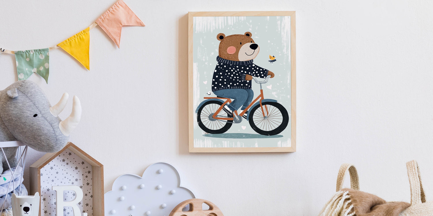 Bring warmth and adventure to your child’s space with this charming children’s room decor featuring a friendly bear riding a bicycle. The soft pastel background, detailed textures, and whimsical style make this kids wall art print a perfect addition to nurseries, playrooms, and boys’ bedrooms. The playful expression and cozy sweater add a touch of comfort and joy to any child's decor.