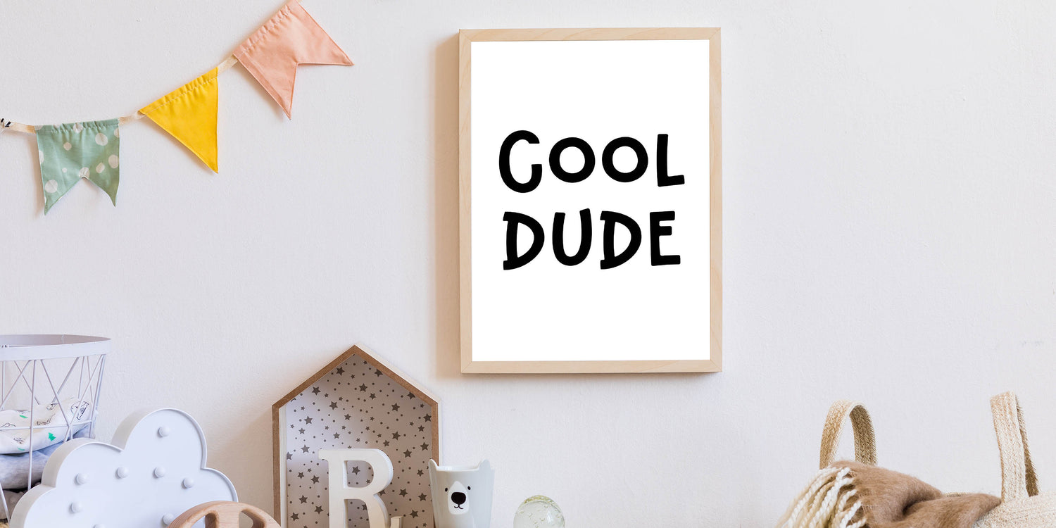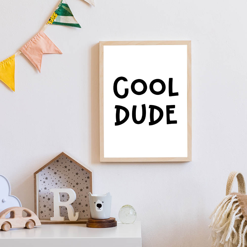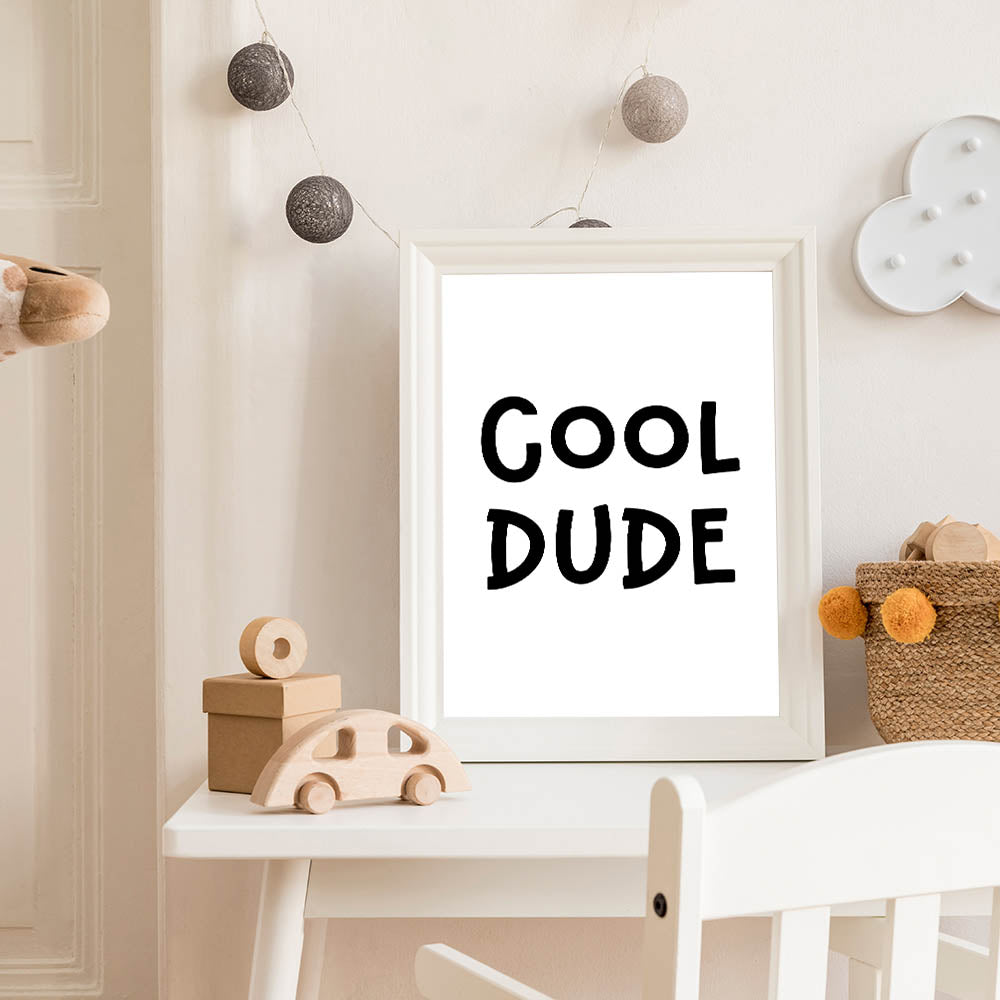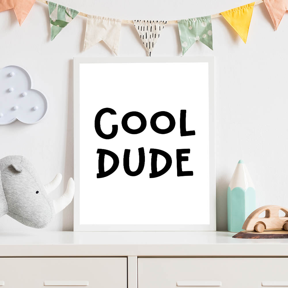 Add a bold and fun statement to your child’s space with this Cool Dude typography wall art. Designed with thick black handwritten-style lettering on a clean white background, this modern and minimalist piece brings an effortlessly cool and trendy look to any boys' bedroom, nursery, or playroom. Perfect for kids with personality, this artwork adds a touch of confidence and fun to their environment.