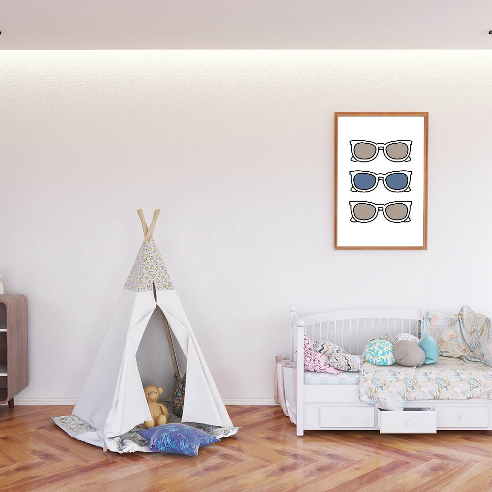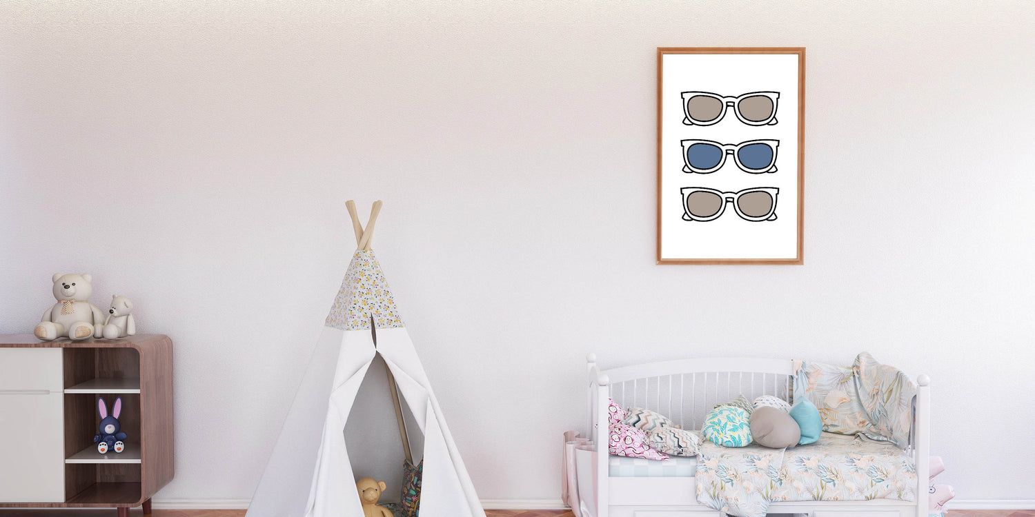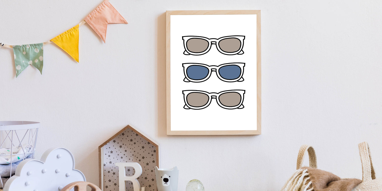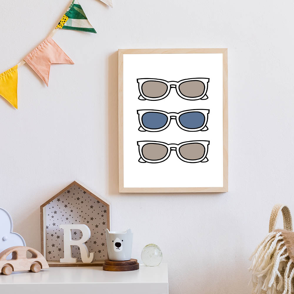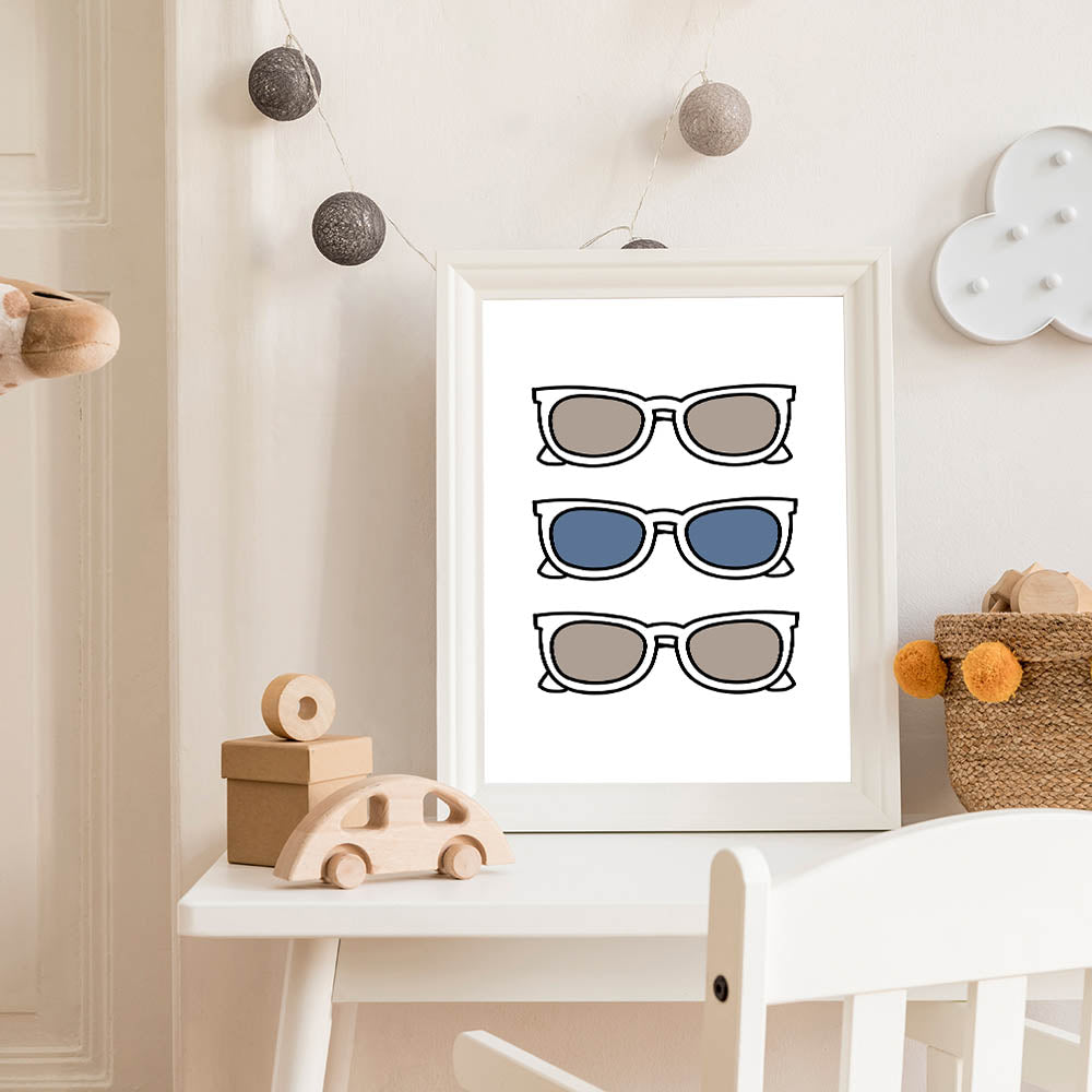 Add a playful and stylish touch to your child’s space with this Cool Sunglasses Trio Boys Wall Art. Featuring three pairs of sunglasses in neutral and blue tones, this Kids Wall Art Print brings a fun and trendy vibe to any boys' bedroom, playroom, or nursery. The simple yet bold design makes it an eye-catching piece, perfect for young trendsetters who love modern and minimalistic decor.