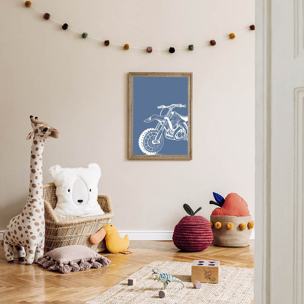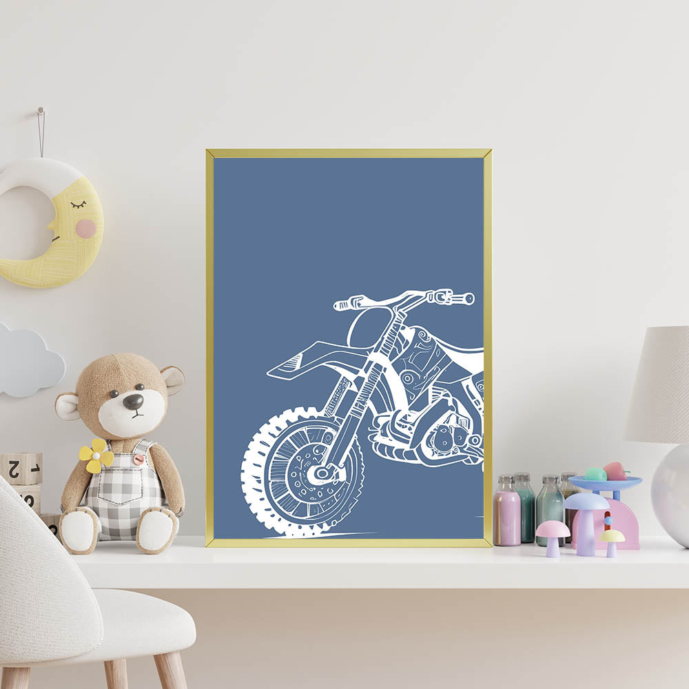 Bring the thrill of off-road adventure into your child’s space with this Dirt Bike Wall Art. Featuring a sleek, hand-drawn motocross bike illustration in white against a deep blue-gray background, this piece is perfect for young motorcycle enthusiasts. The minimalist yet bold design makes it a striking addition to boys' bedrooms, playrooms, or teen spaces.