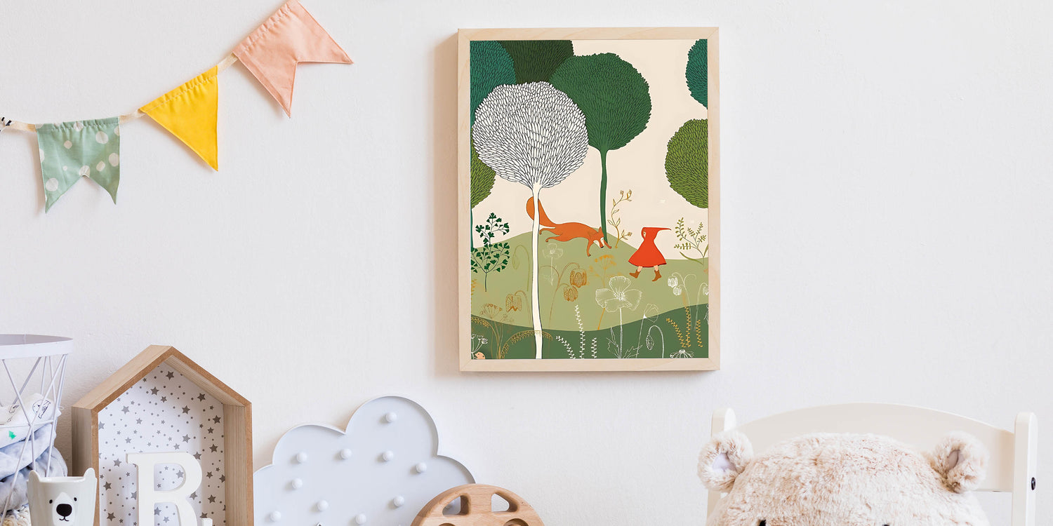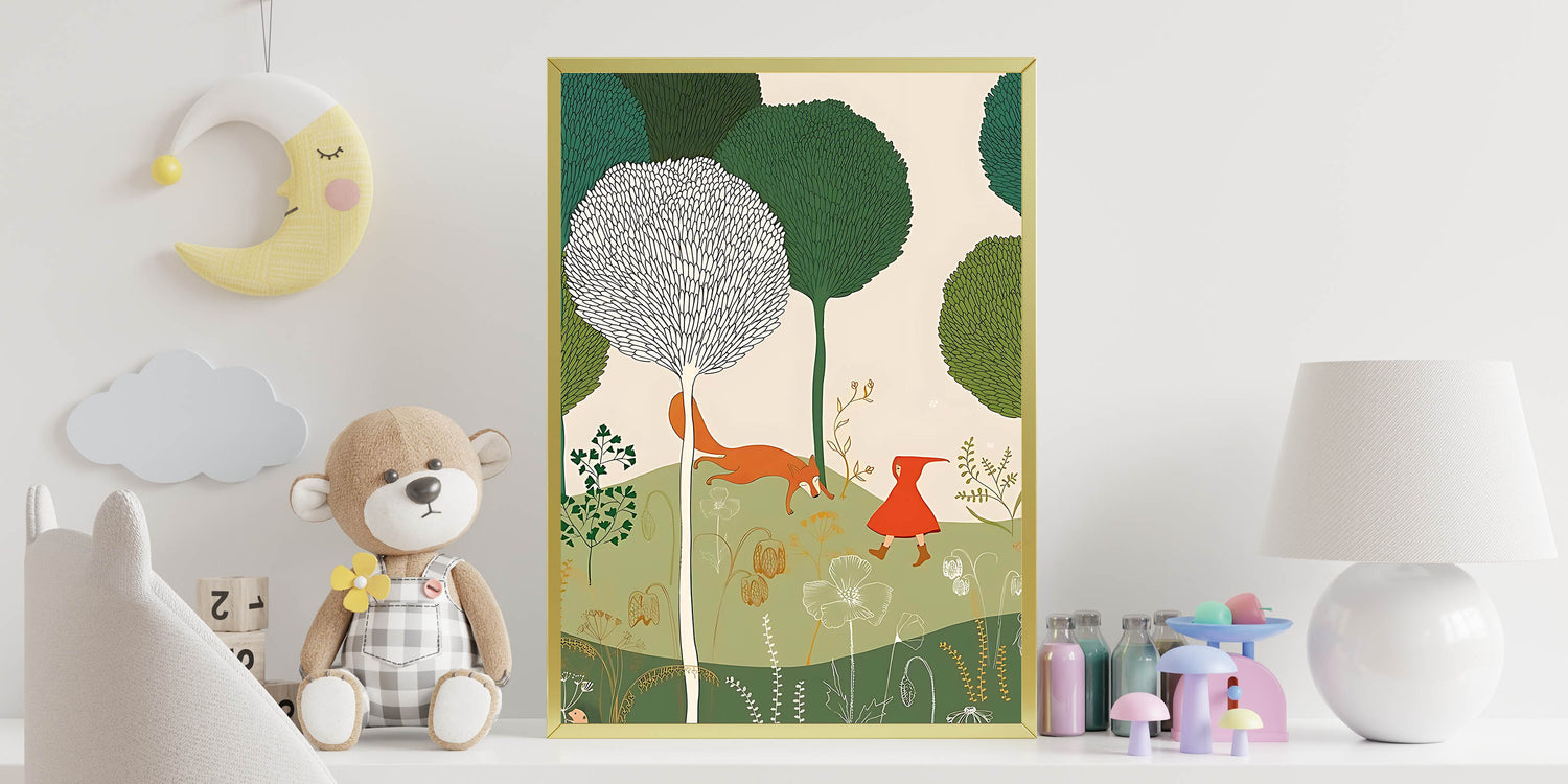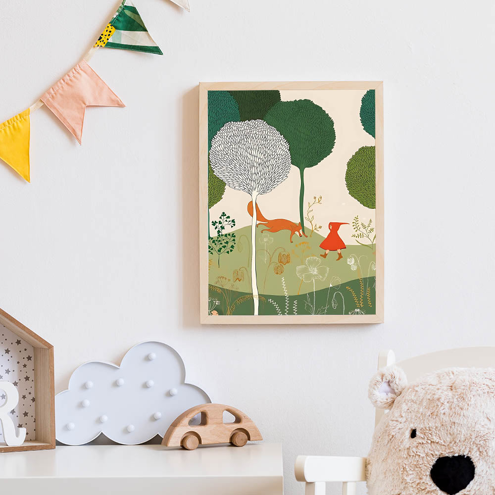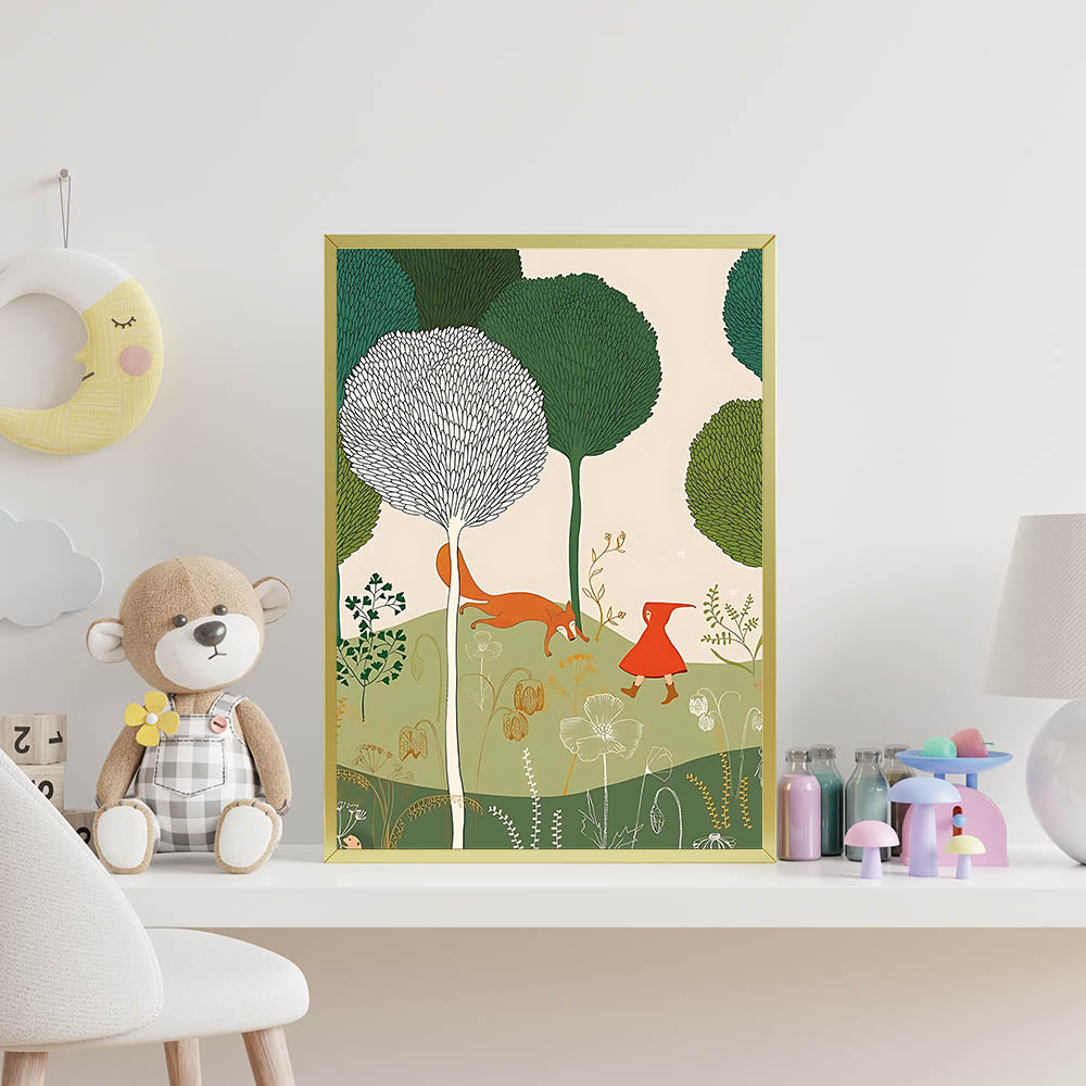Step into a world of adventure with this enchanted forest-themed wall art, featuring a whimsical scene of a little explorer in a red cloak alongside a playful fox. With lush green trees, delicate floral details, and earthy tones, this artwork brings a sense of wonder and storytelling to any boys' bedroom, nursery, or playroom.