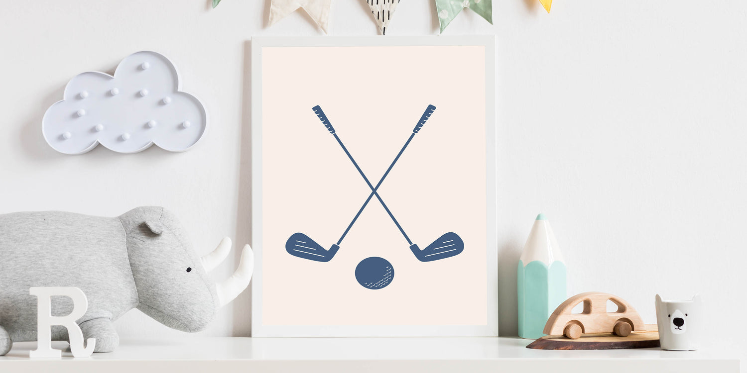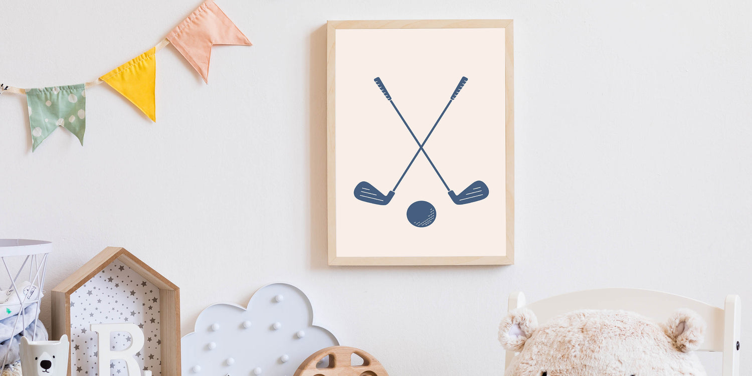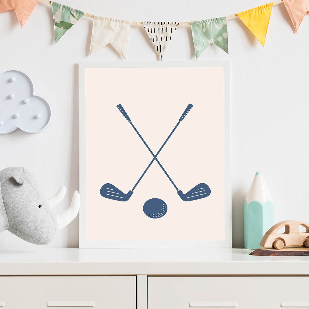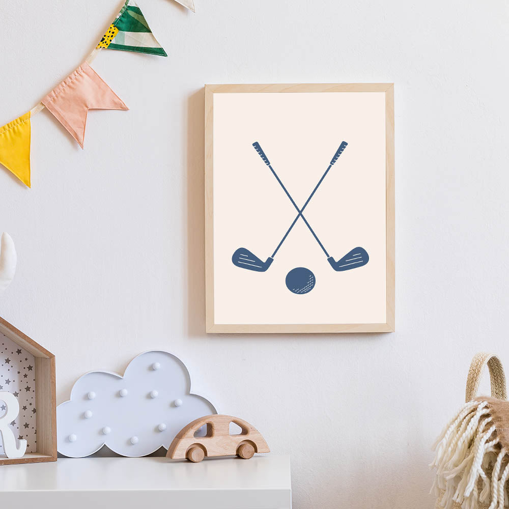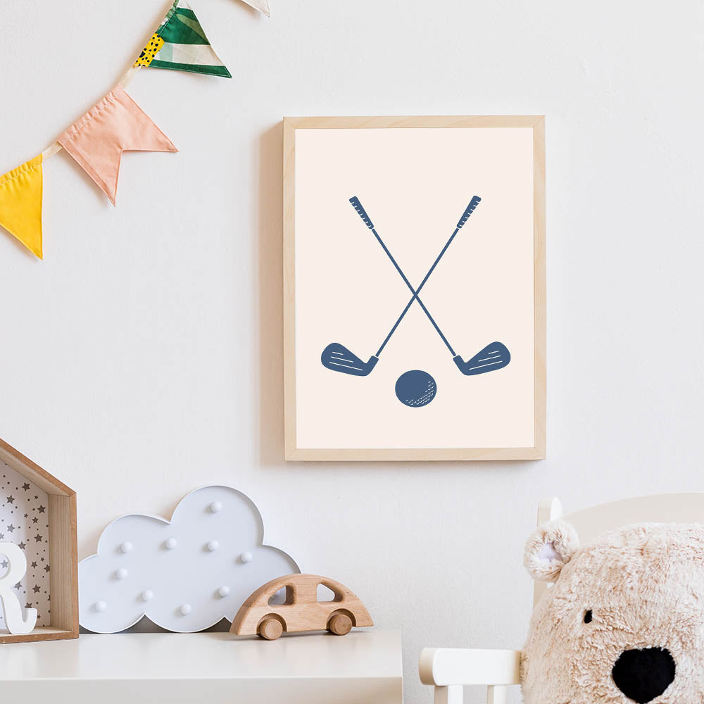 Introduce a sporty and stylish touch to your child’s space with this Golf Club Silhouette Boys Sports Wall Art. Featuring a minimalist design of two crossed golf clubs with a golf ball, this Kids Wall Art Print is perfect for young golf enthusiasts. The clean, modern illustration in navy blue against a neutral background makes it a versatile addition to boys' bedrooms, playrooms, or sports-themed nurseries.