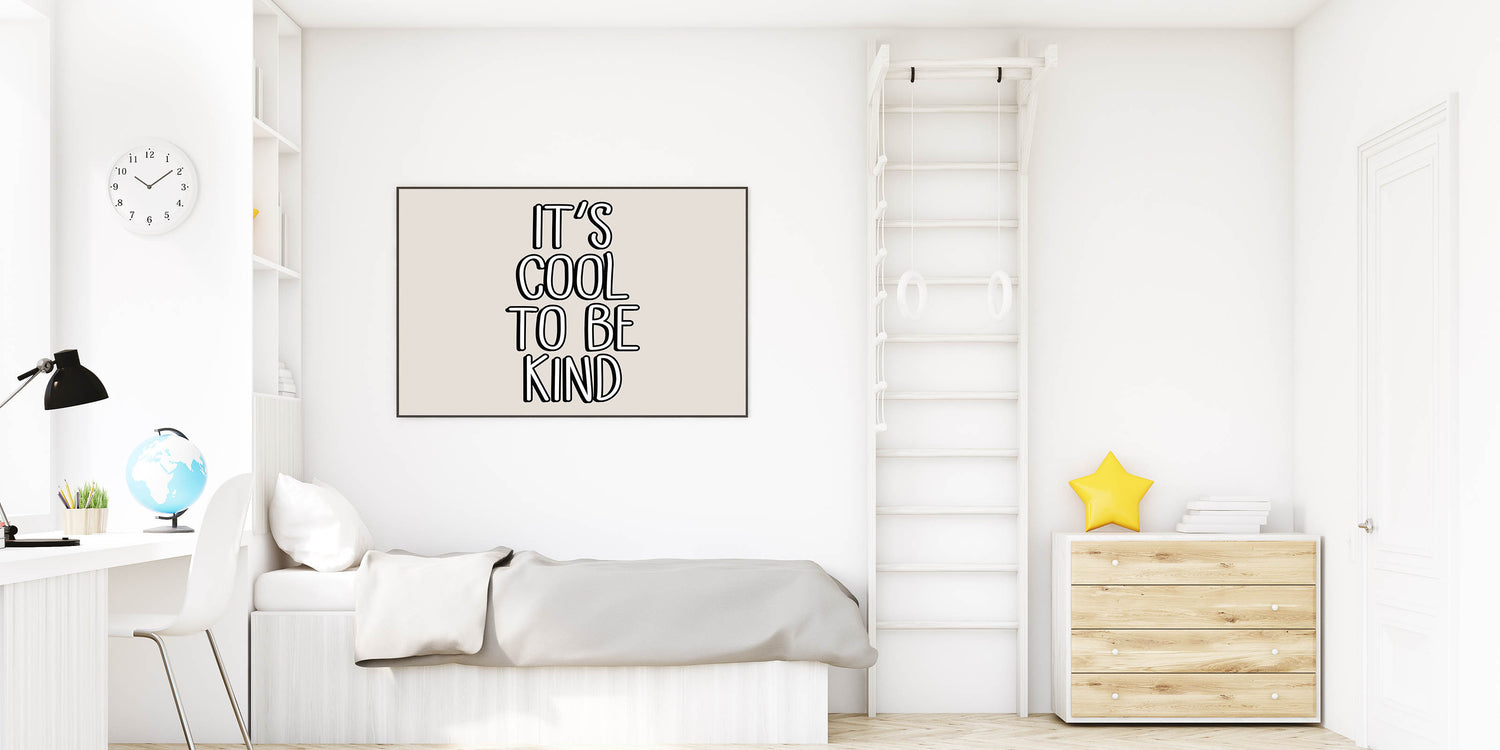 Promote kindness and positivity in your child's space with this modern typography wall art, featuring the uplifting phrase "IT'S COOL TO BE KIND." The simple yet stylish design, with bold black-and-white lettering on a neutral beige background, makes it a perfect decor piece for boys' bedrooms, nurseries, and playrooms.