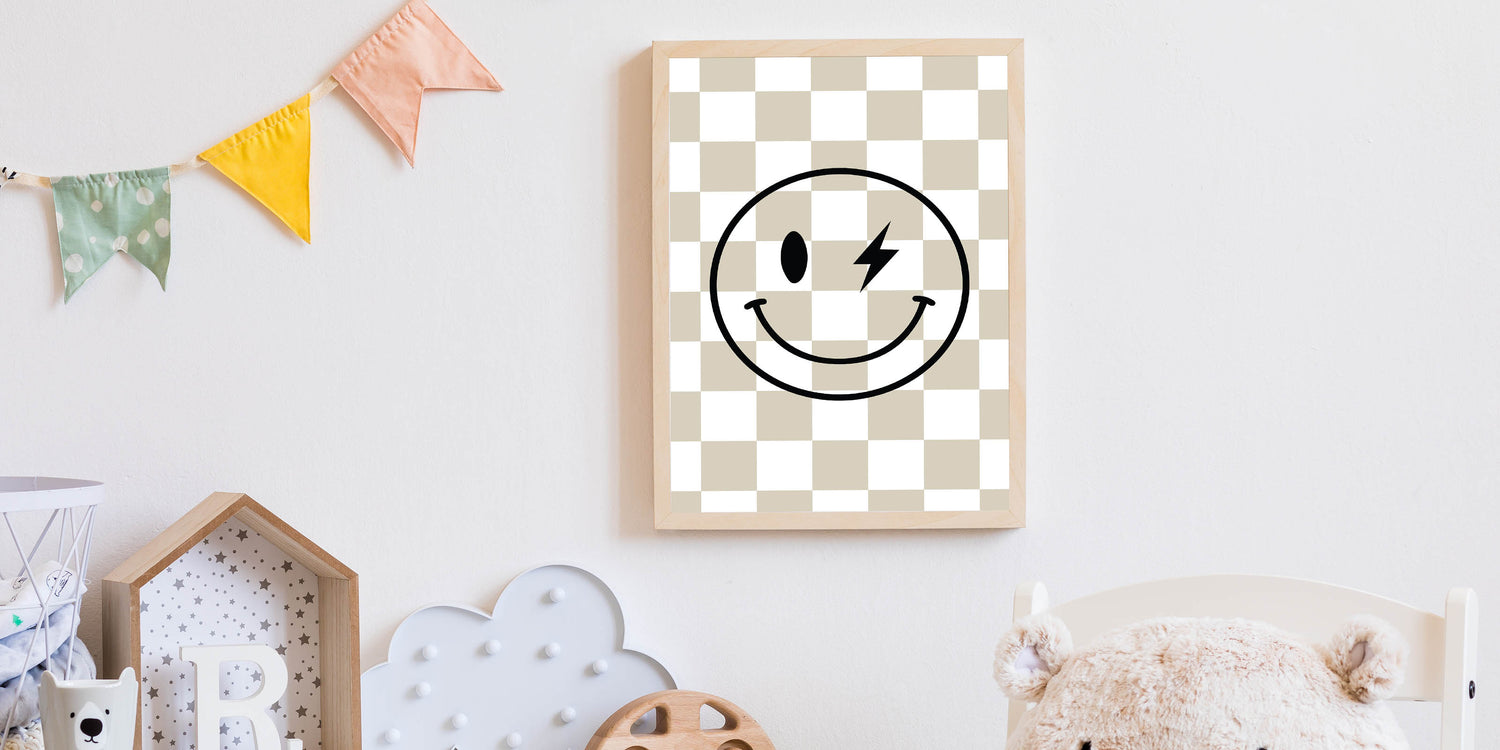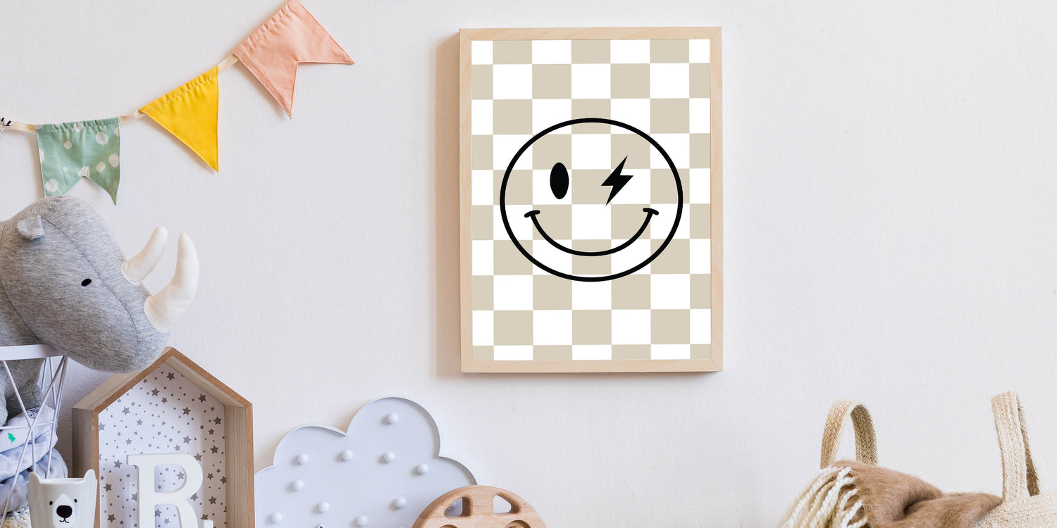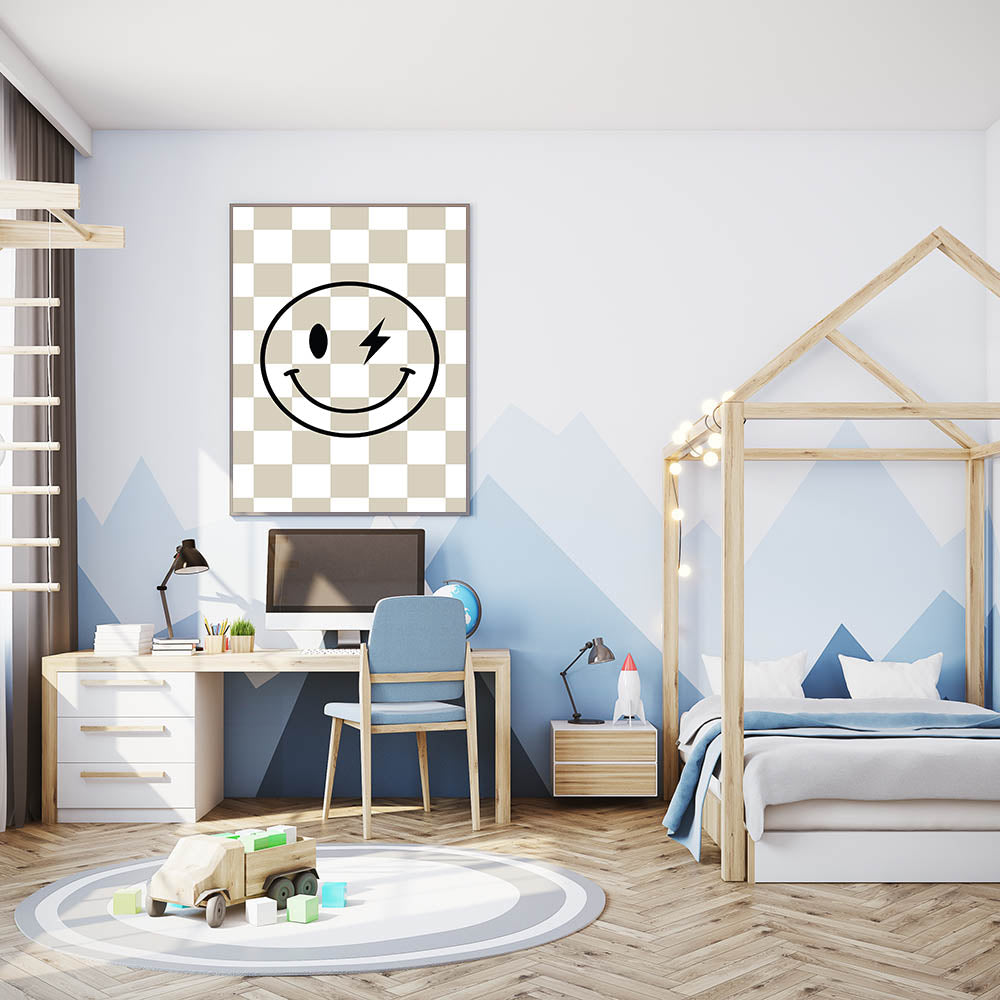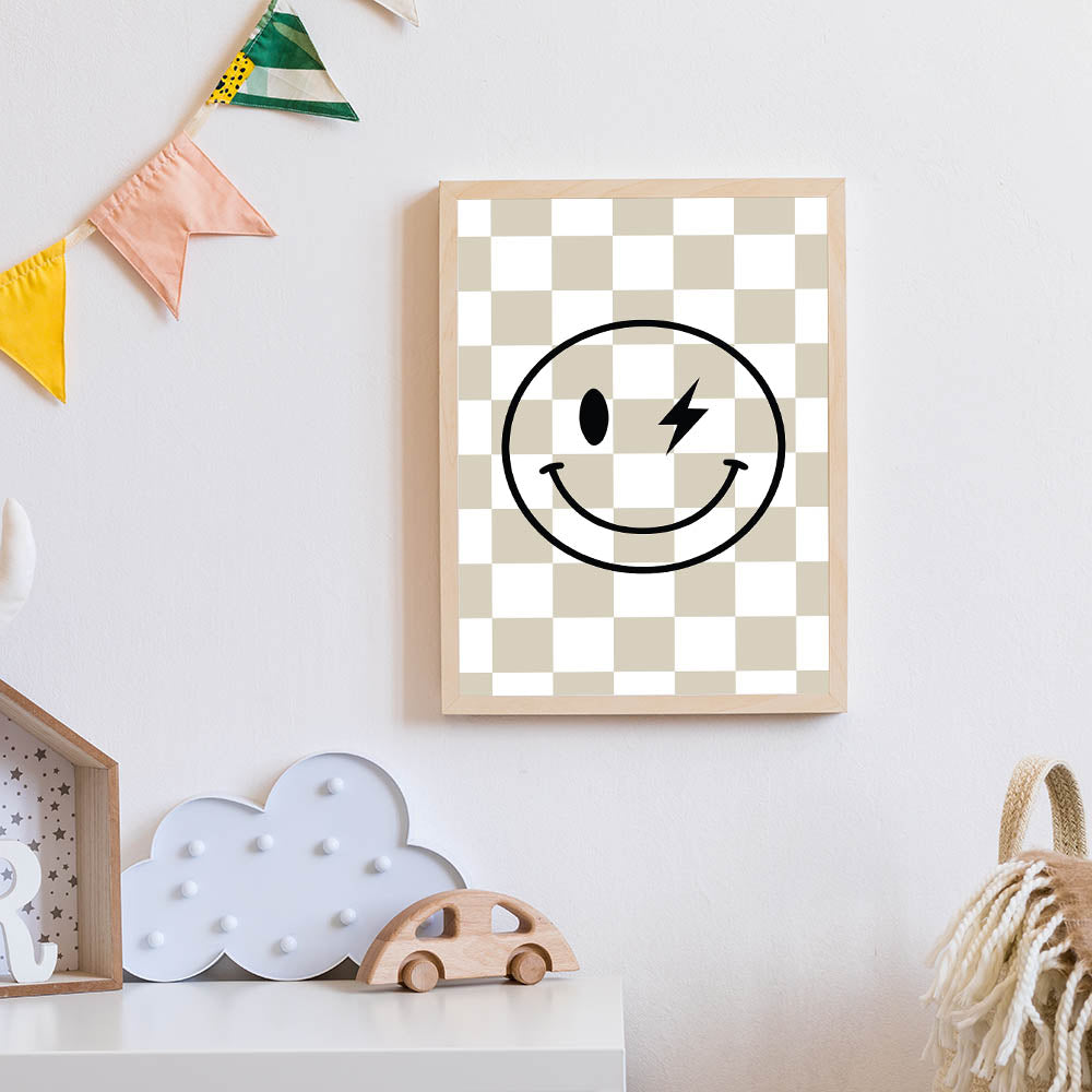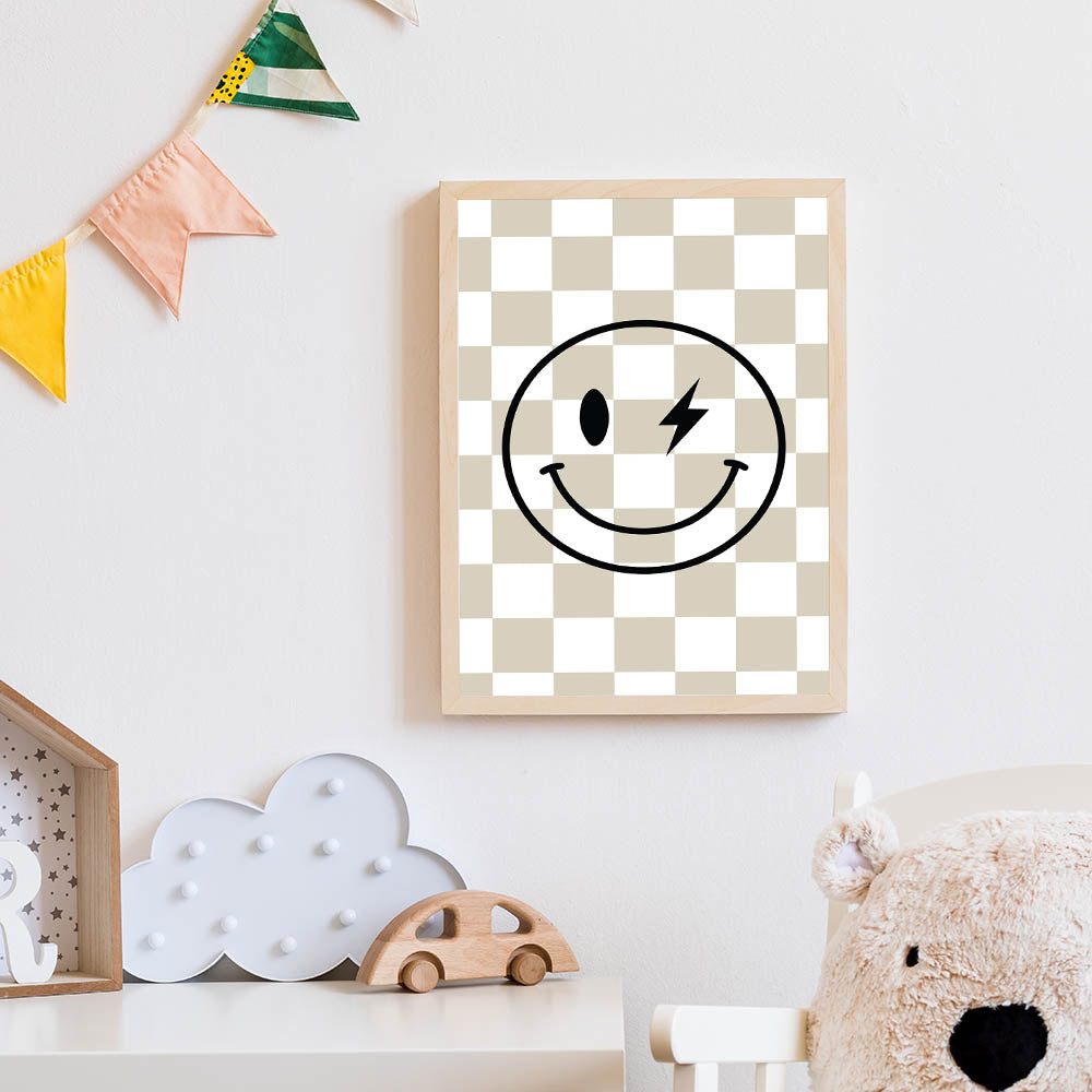 Add a fun and edgy touch to your child’s space with this modern lightning smiley face wall art. Featuring a bold black smiley with a lightning bolt eye over a stylish beige-and-white checkered background, this artwork blends retro and modern aesthetics to create a playful and cool decor piece for boys' bedrooms, nurseries, or playrooms.
