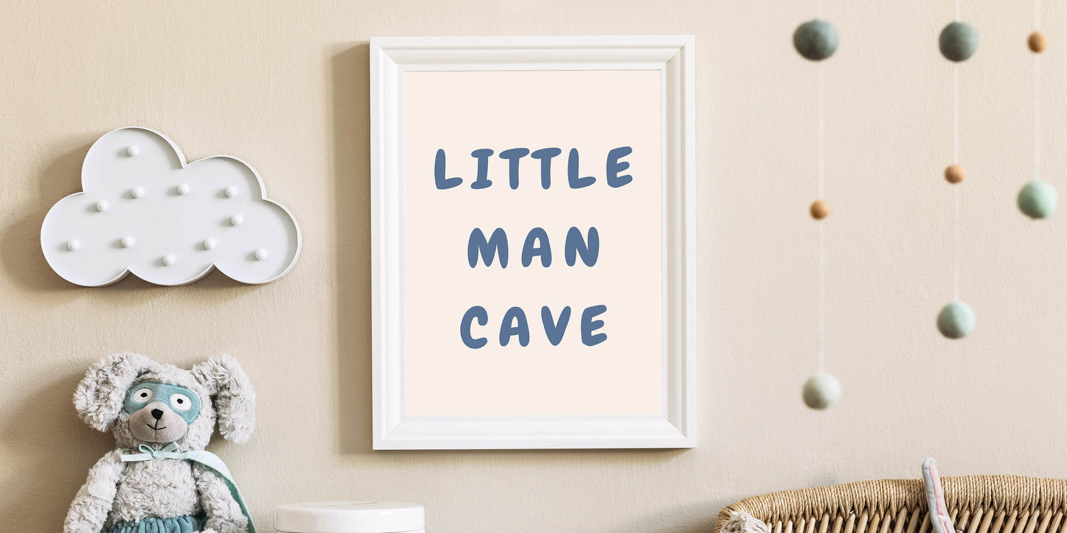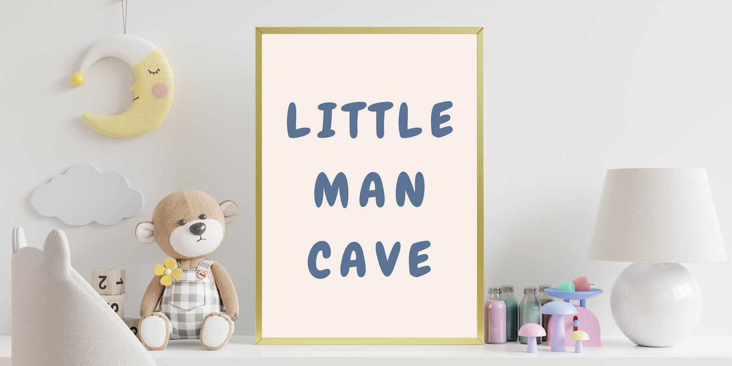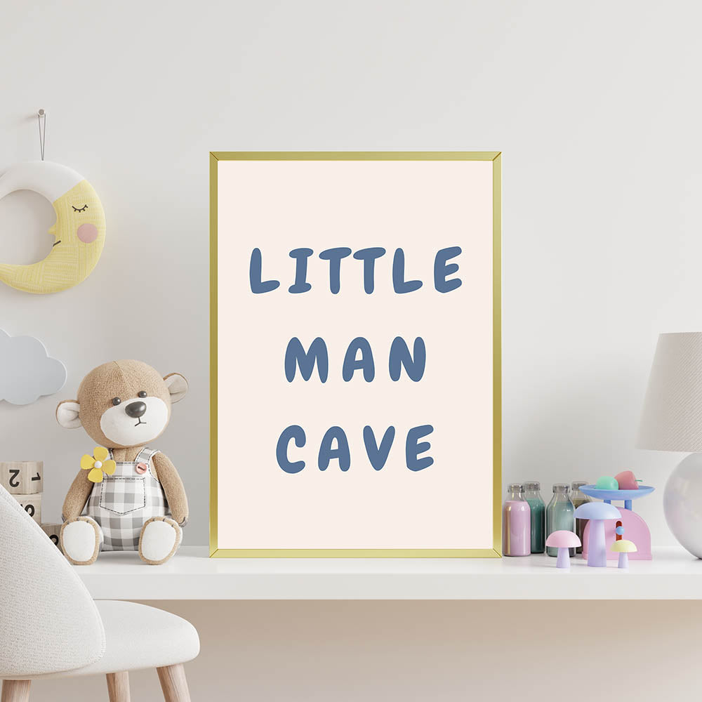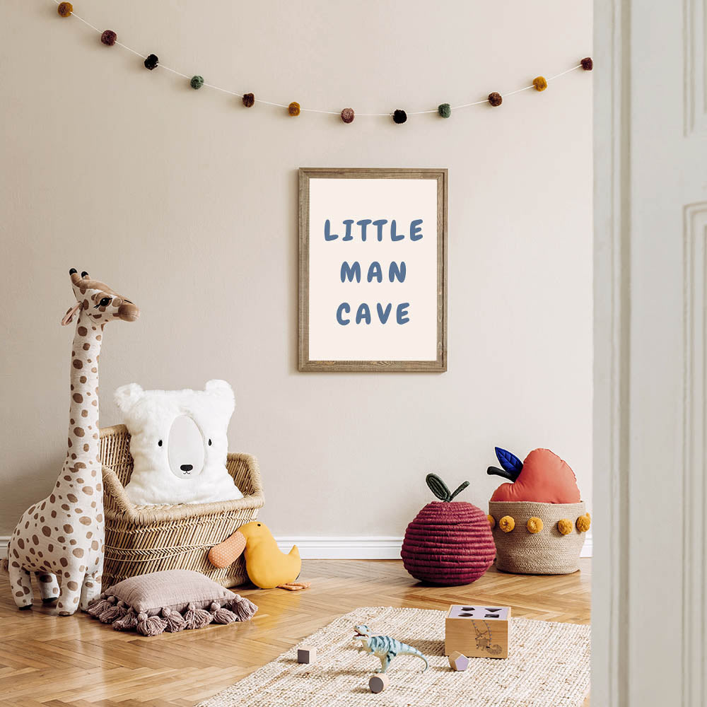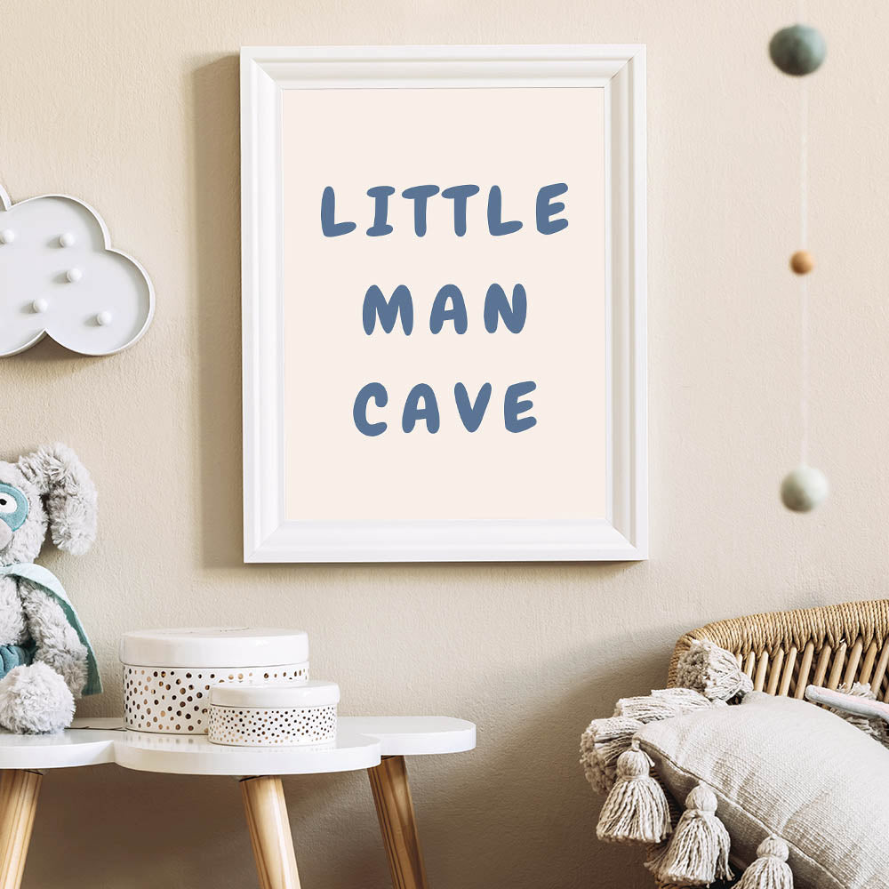 Create a cozy and fun space with this Little Man Cave Wall Art, designed for boys' bedrooms, playrooms, and nurseries. Featuring bold, playful typography in a muted blue tone against a soft beige background, this children's room decor adds a charming and modern touch to any space. Whether you're styling nursery wall art or enhancing a boys bedroom art setup, this piece is the perfect addition.