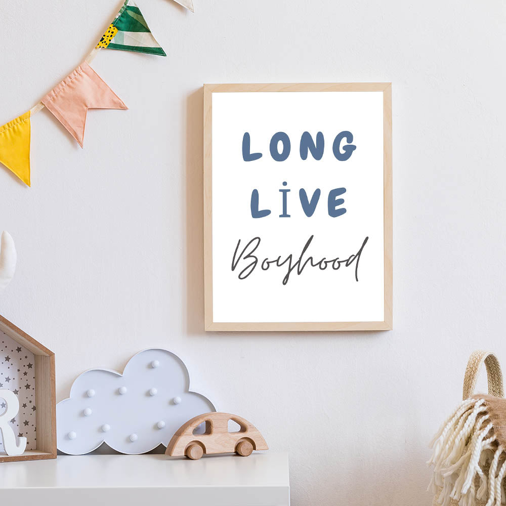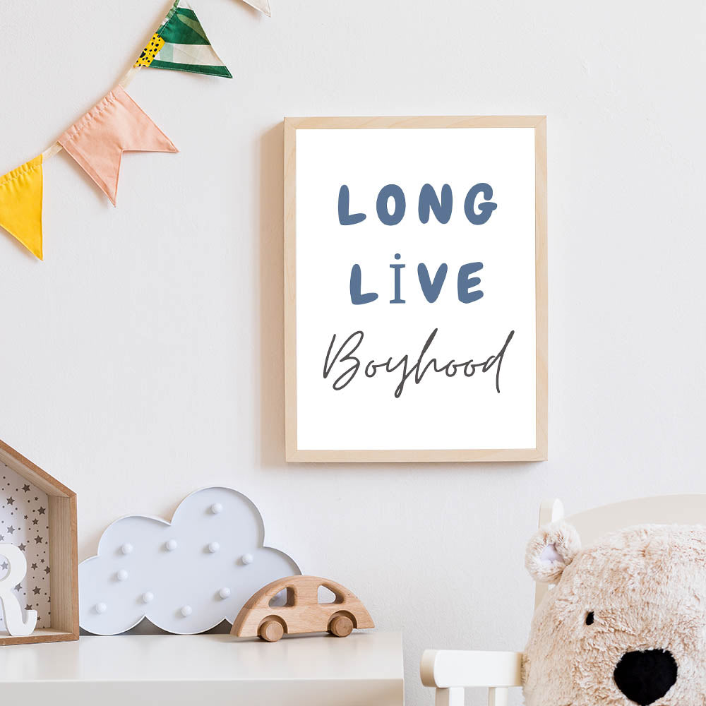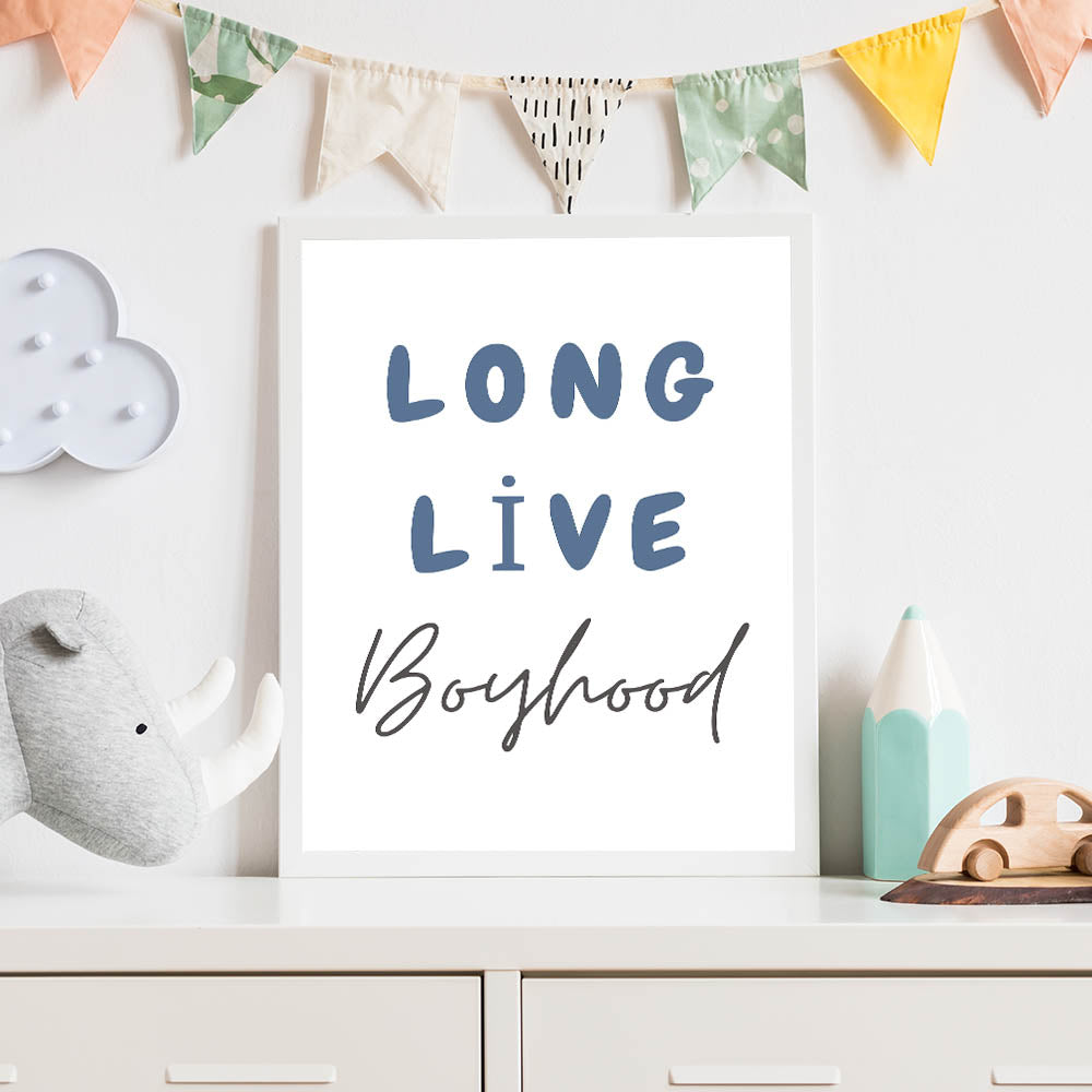 Celebrate the joy and adventure of childhood with this "Long Live Boyhood" wall art print. Featuring bold, hand-lettered typography in a stylish blue and gray color scheme, this artwork adds a timeless and inspiring touch to any boys' bedroom, nursery, or playroom. The simple yet meaningful design captures the essence of youth, imagination, and endless possibilities.