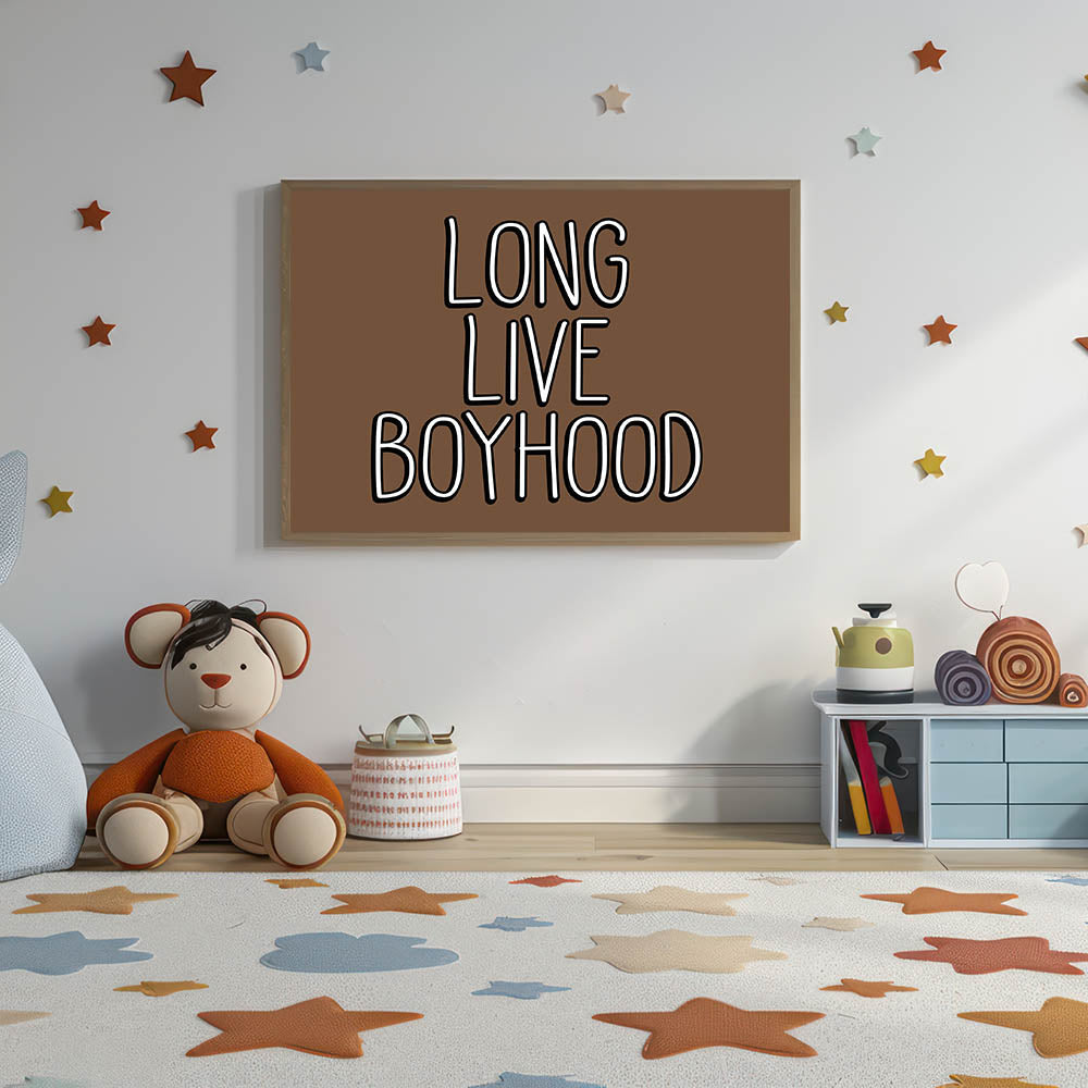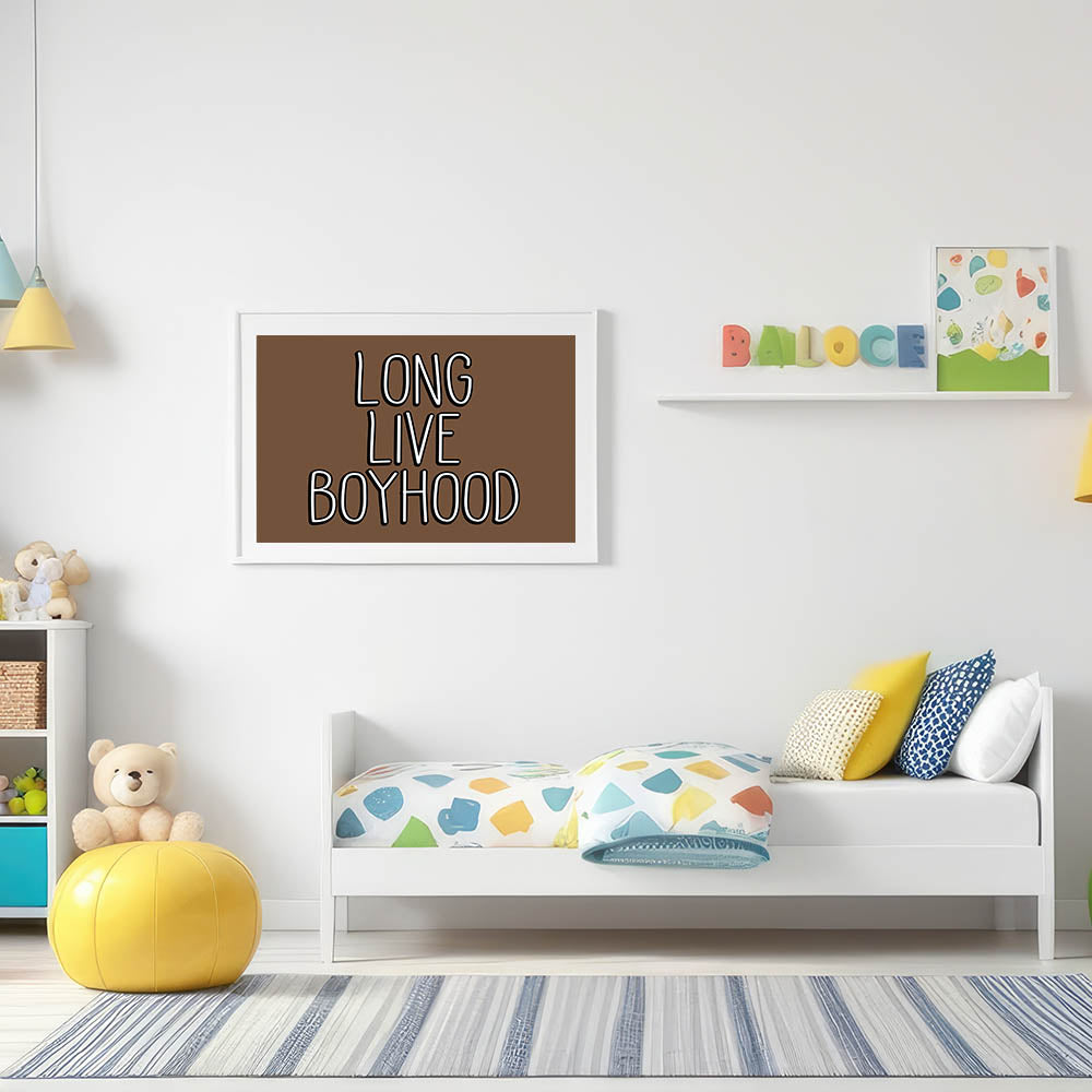 Celebrate the joy and adventure of childhood with this bold and inspiring typography wall art, featuring the phrase "LONG LIVE BOYHOOD." Designed with a rich brown background and bold black-and-white lettering, this piece adds warmth and character to any boys' bedroom, nursery, or playroom. The minimalist yet expressive design blends well with a variety of interior styles, from modern to rustic decor.