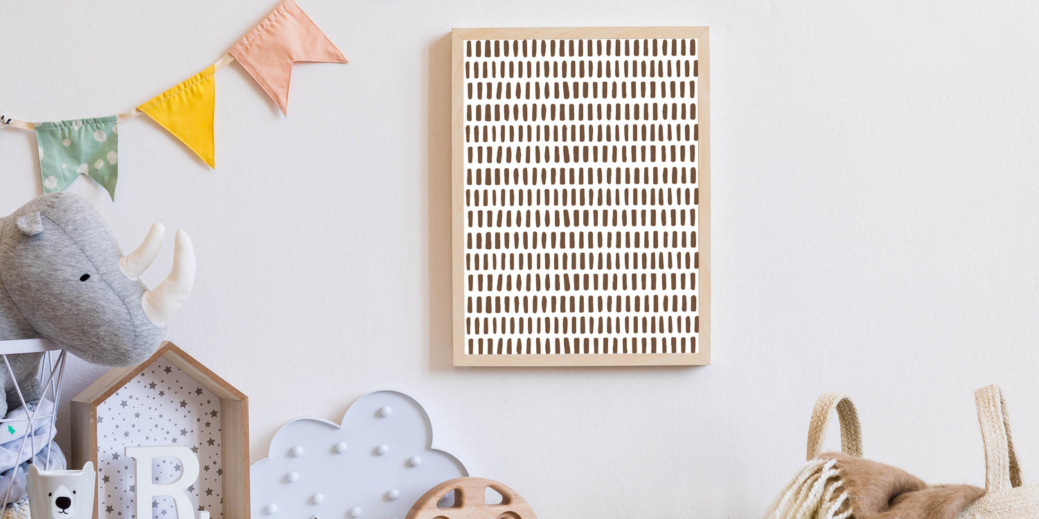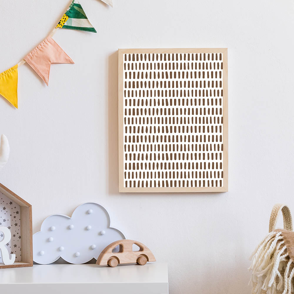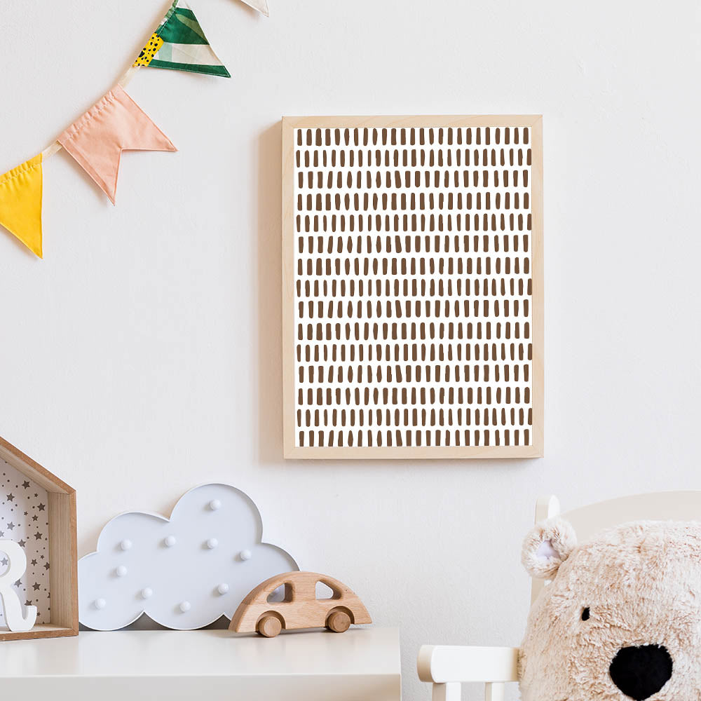 Enhance your child’s room with this modern and minimalist abstract wall art, featuring a structured pattern of brown brushstroke dashes on a crisp white background. This simple yet stylish design is perfect for creating a calm, contemporary, and artistic atmosphere in a boys' bedroom, nursery, or playroom.