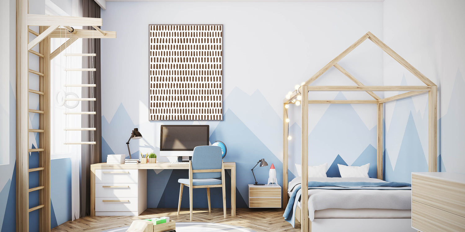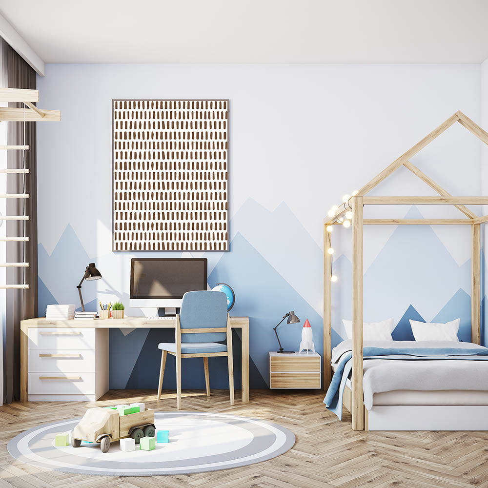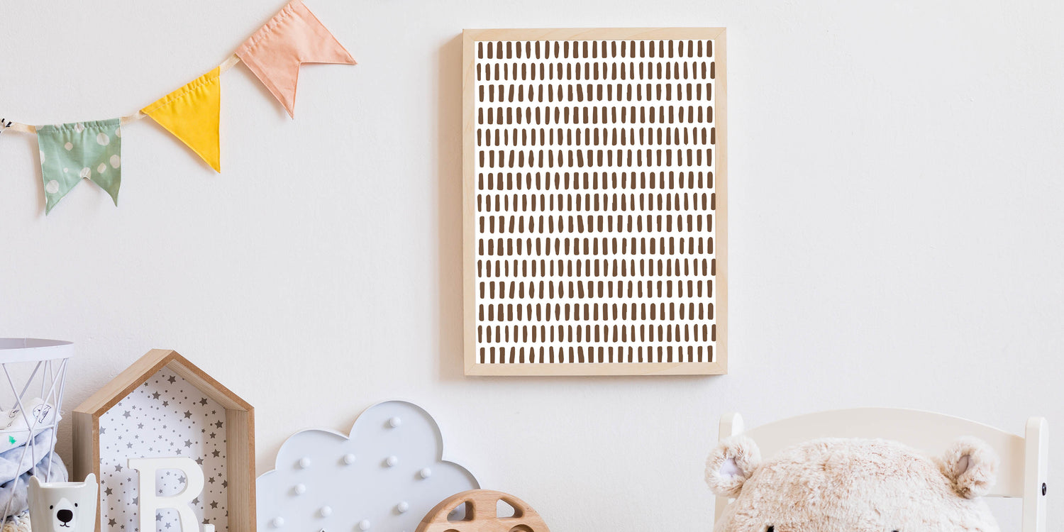 Enhance your child’s room with this modern and minimalist abstract wall art, featuring a structured pattern of brown brushstroke dashes on a crisp white background. This simple yet stylish design is perfect for creating a calm, contemporary, and artistic atmosphere in a boys' bedroom, nursery, or playroom.