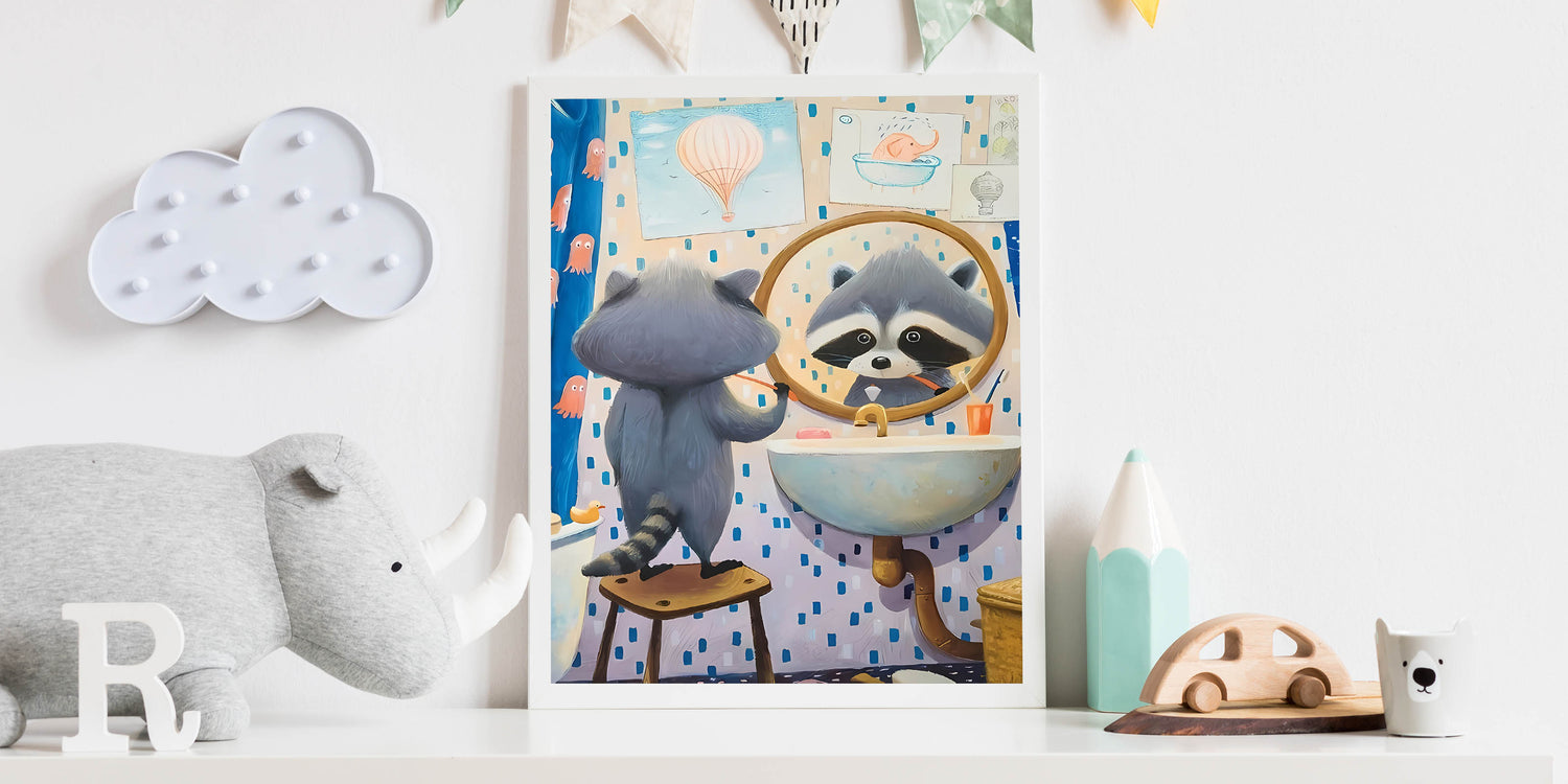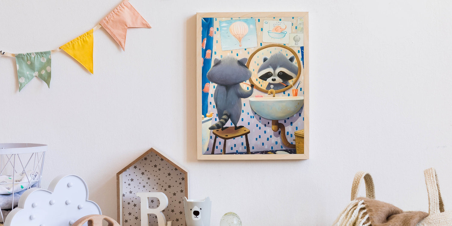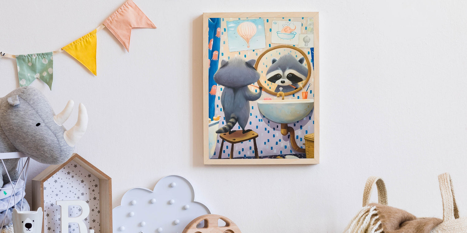 Add a touch of fun and whimsy to your child’s space with this Morning Raccoon wall art. This delightful illustration features an adorable raccoon standing on a stool in front of a mirror, getting ready for the day. The cozy bathroom setting, playful details like the toothbrush, duck, and charming wall drawings, make this children’s room decor a perfect fit for any boys' bedroom, nursery, or playroom.