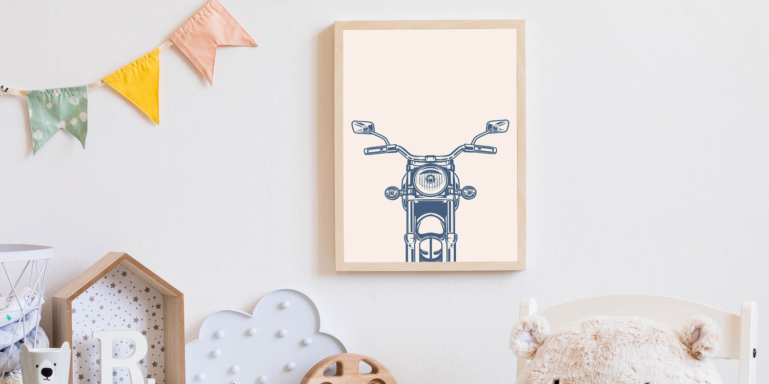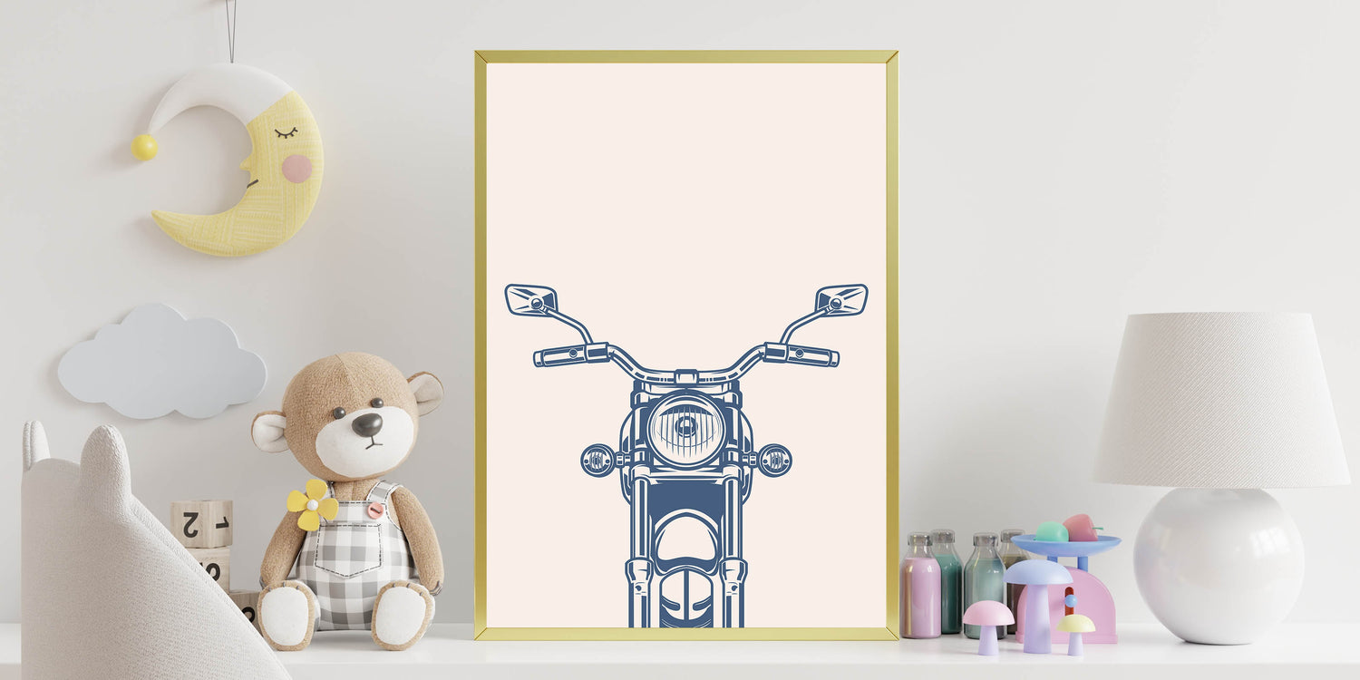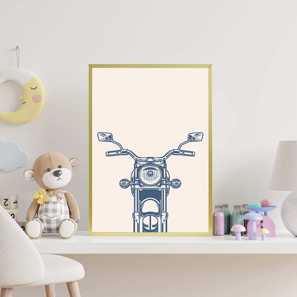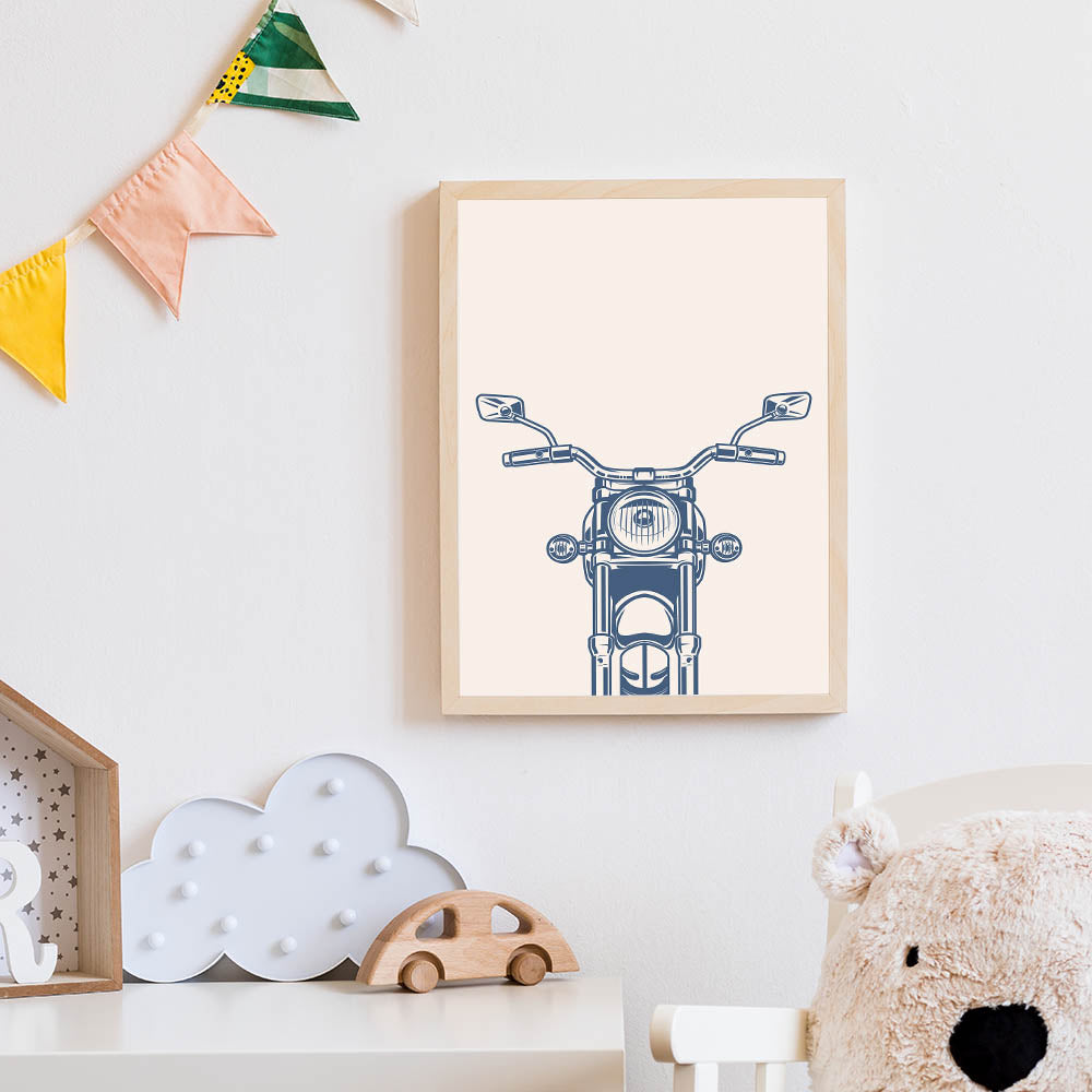Rev up your child's space with this Motorcycle Handlebar Wall Art, a sleek and bold addition to boys' bedrooms, playrooms, and nurseries. Featuring a detailed navy blue illustration of a motorcycle's handlebars, headlight, and mirrors against a soft beige background, this children's room decor is perfect for young motorcycle enthusiasts and adventure seekers. Whether you're designing nursery wall art or adding personality to a boys bedroom art theme, this piece brings a sense of freedom and speed.