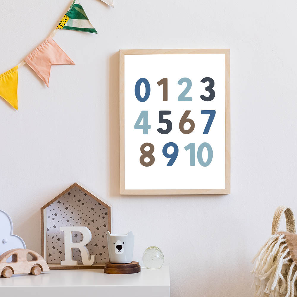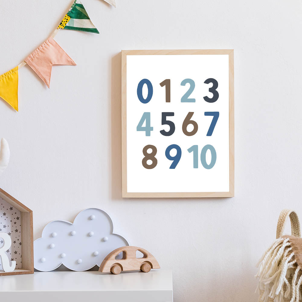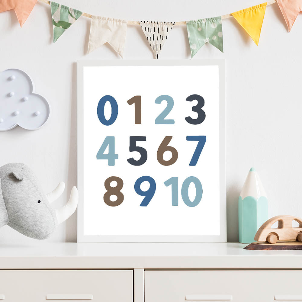 Make learning fun with this modern Number Wall Art, designed for boys' bedrooms, nurseries, and playrooms. This children's room decor features bold and stylish numbers in soft blue, brown, and gray tones, making it a perfect educational and decorative piece. Whether you're adding nursery wall art to a learning space or enhancing a boys bedroom art collection, this print brings both style and function to the room.