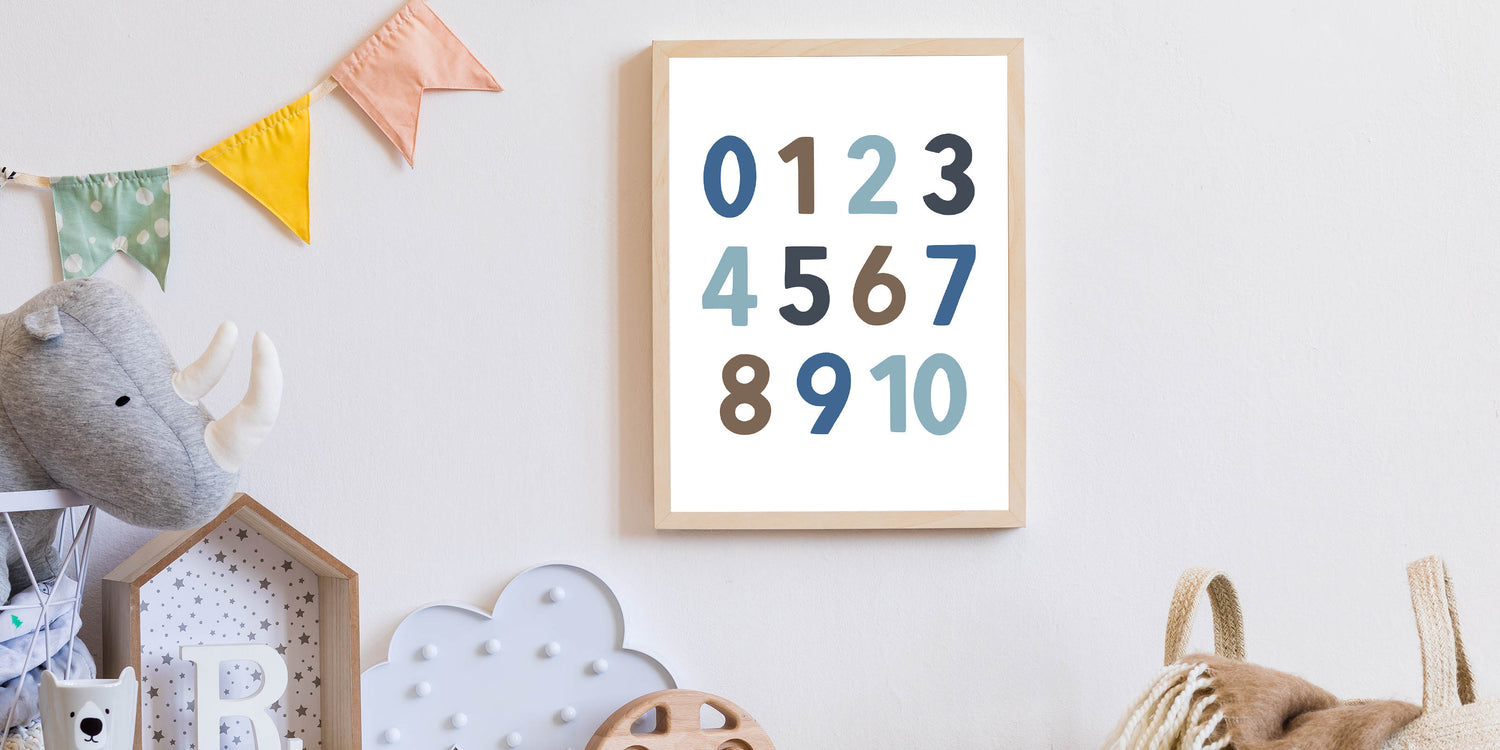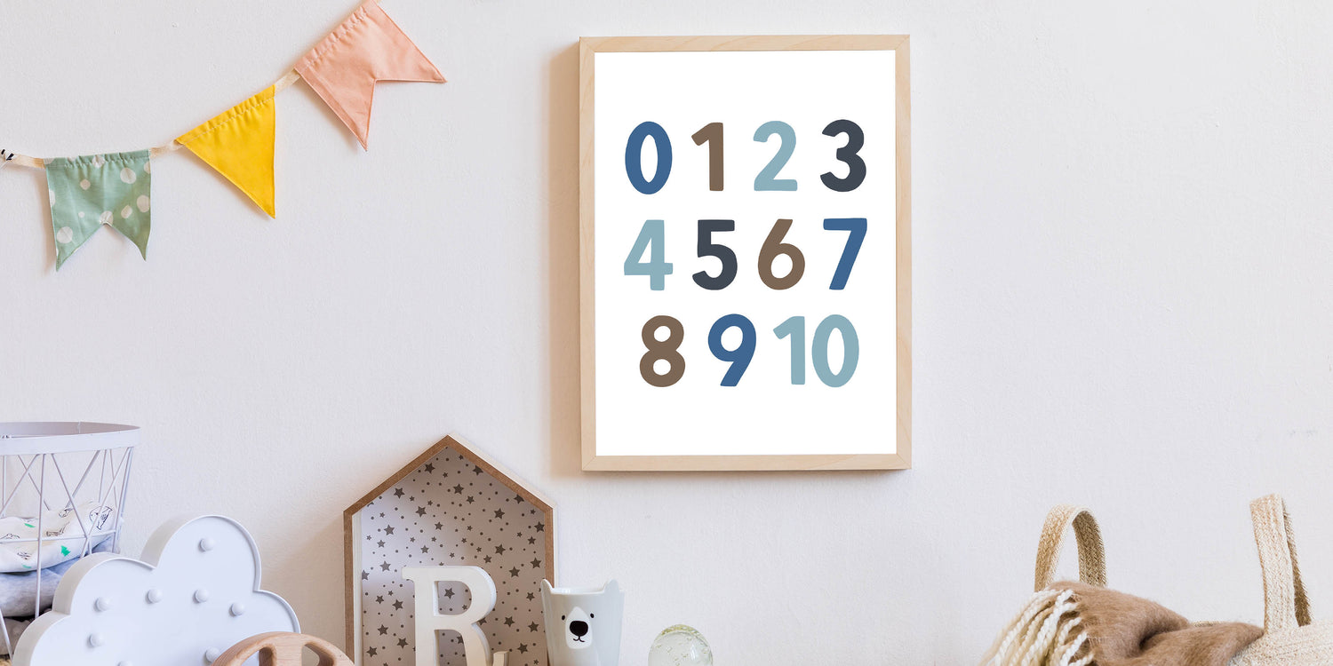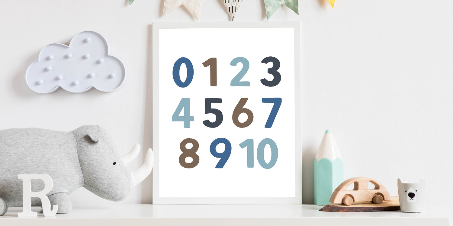 Make learning fun with this modern Number Wall Art, designed for boys' bedrooms, nurseries, and playrooms. This children's room decor features bold and stylish numbers in soft blue, brown, and gray tones, making it a perfect educational and decorative piece. Whether you're adding nursery wall art to a learning space or enhancing a boys bedroom art collection, this print brings both style and function to the room.