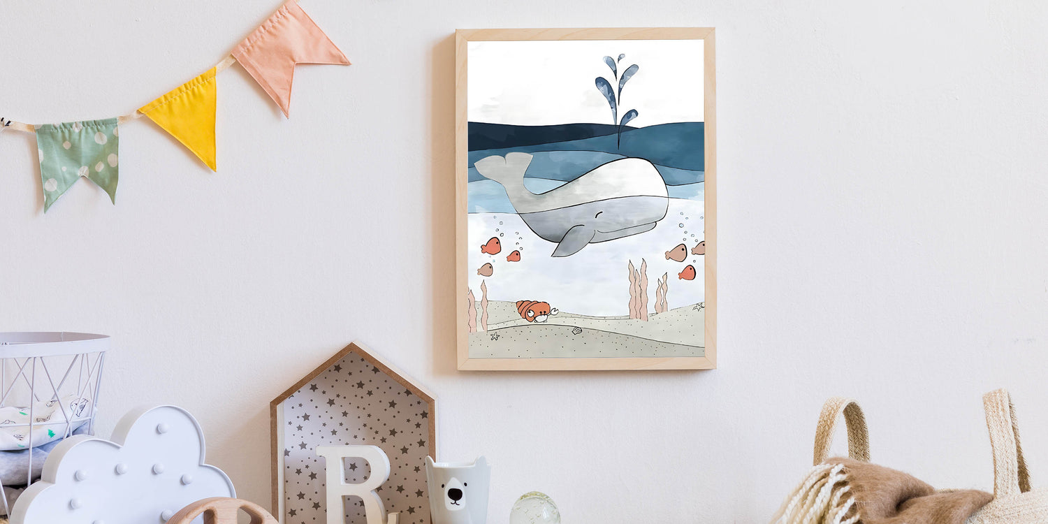 Transform your child’s space into a soothing underwater world with this nursery wall art featuring a peaceful whale surrounded by ocean life. The soft blues and neutral tones create a calming atmosphere, making it an excellent choice for boys’ bedroom art, kids wall art prints, and playroom wall art.