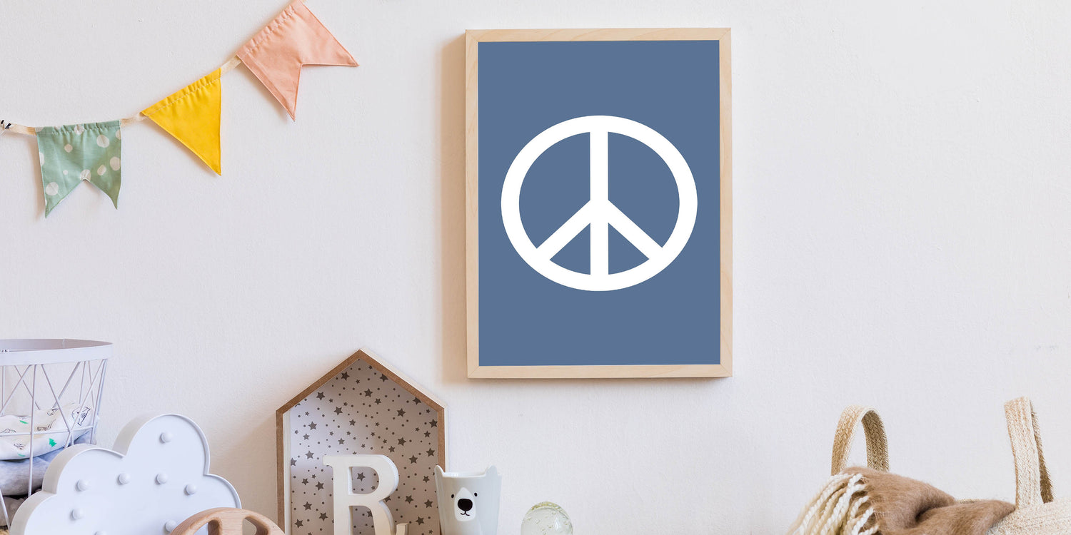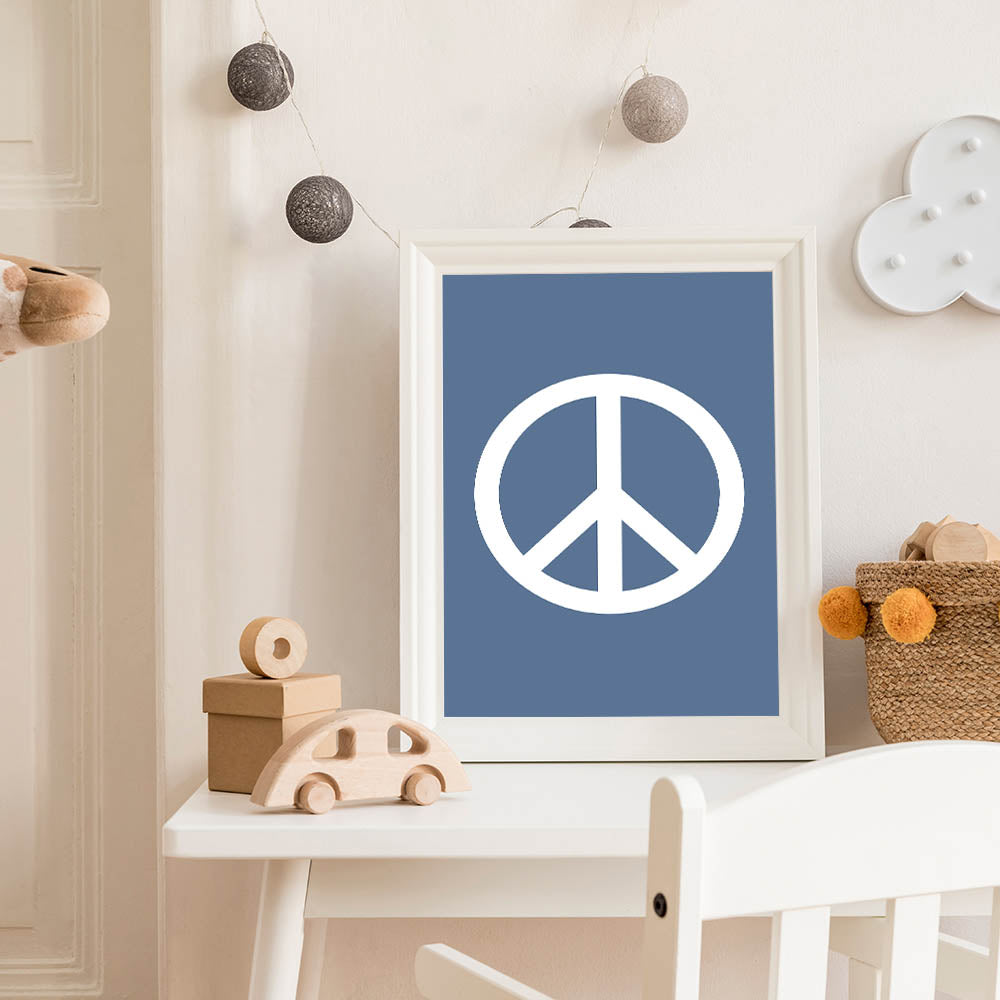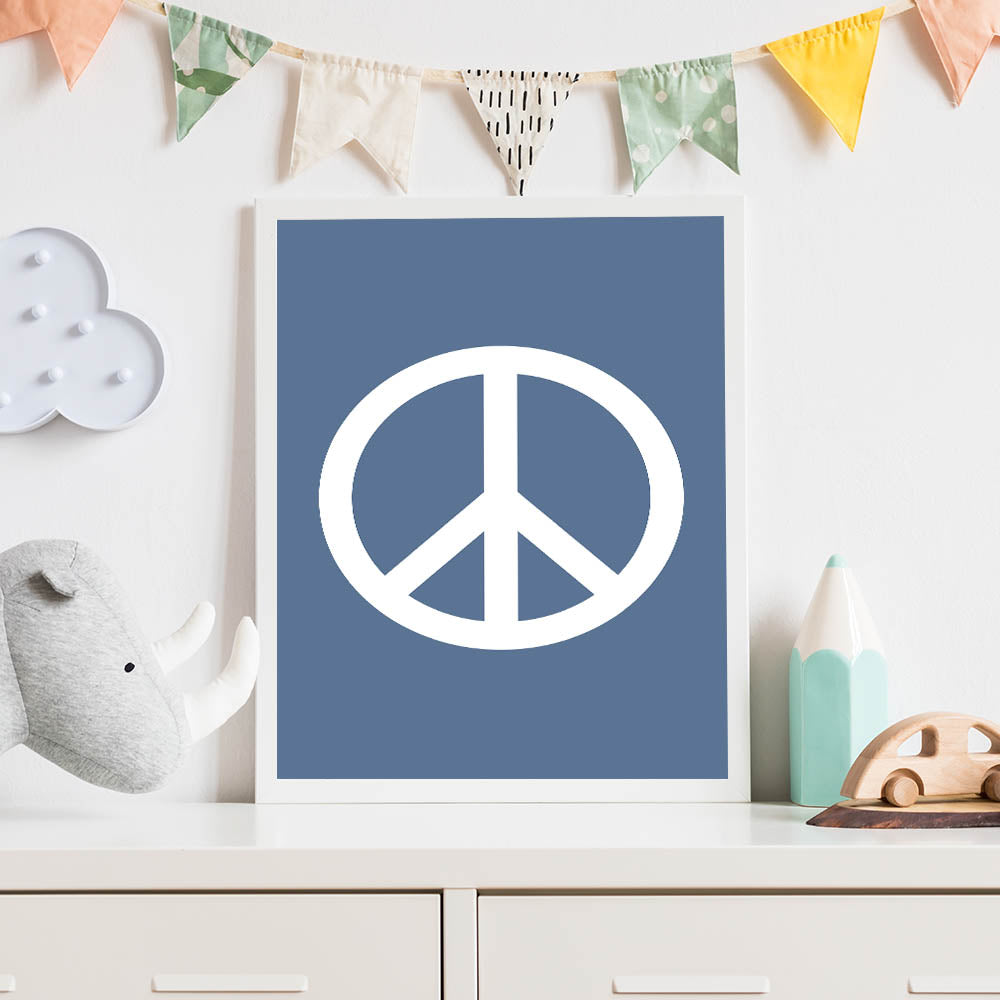 Bring a sense of calm and positivity to your child's space with this Peace Symbol wall art. Featuring a simple yet bold white peace sign against a muted blue background, this design is both stylish and meaningful. Perfect for boys' bedrooms, playrooms, or nurseries, this artwork serves as a symbol of harmony, unity, and kindness—values every child should grow up with.