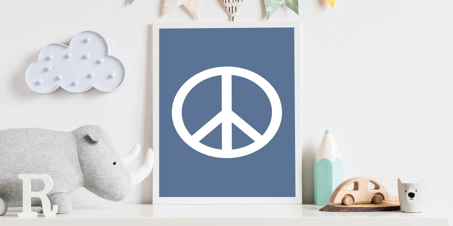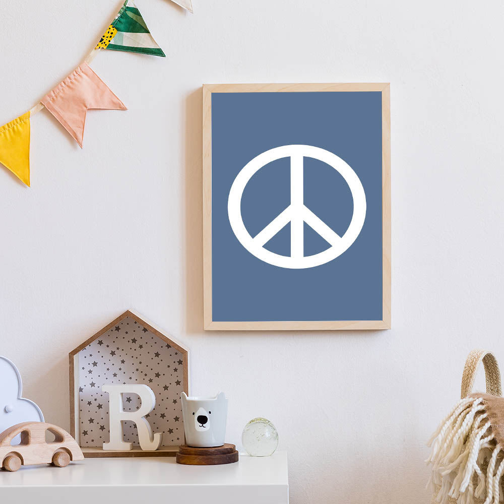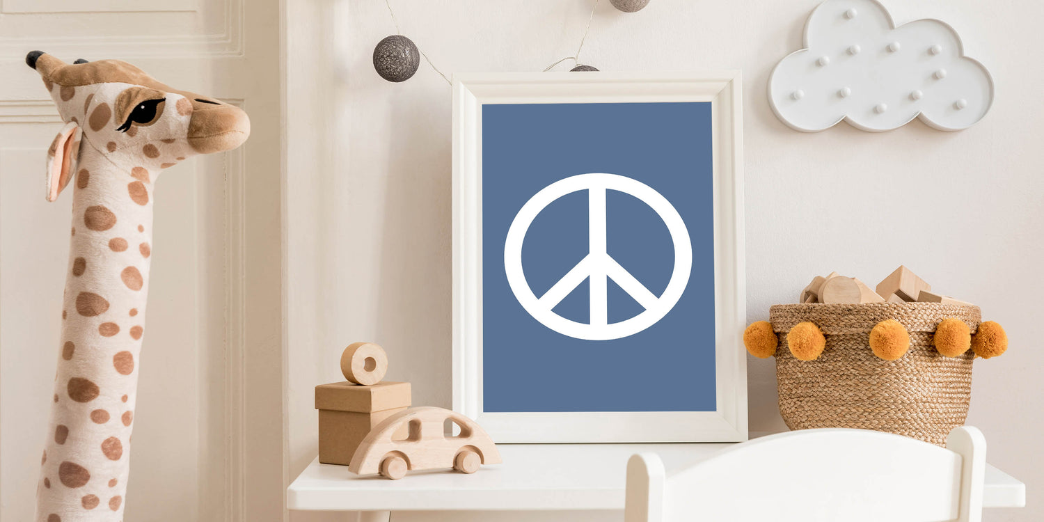 Bring a sense of calm and positivity to your child's space with this Peace Symbol wall art. Featuring a simple yet bold white peace sign against a muted blue background, this design is both stylish and meaningful. Perfect for boys' bedrooms, playrooms, or nurseries, this artwork serves as a symbol of harmony, unity, and kindness—values every child should grow up with.