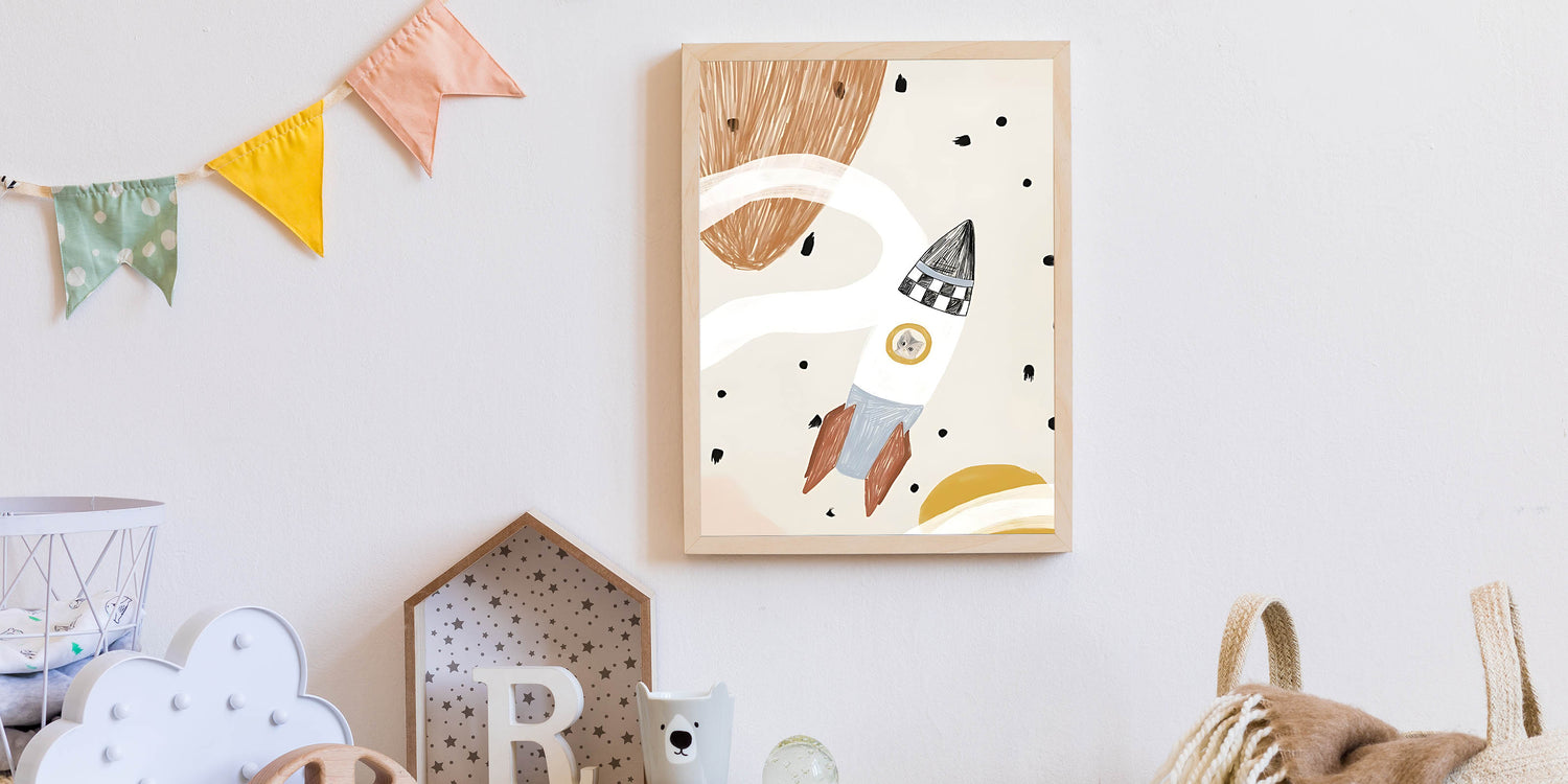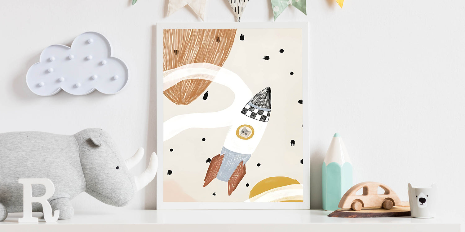 Ignite your child’s imagination with this playroom wall art featuring a whimsical space rocket soaring through the galaxy. With a charming cat astronaut at the helm, this kids wall art print is perfect for inspiring adventure and curiosity. The hand-drawn aesthetic, combined with soft beige, brown, and blue tones, makes it a stylish yet playful addition to boys' bedroom art, nursery wall art, and space-themed kids decor.