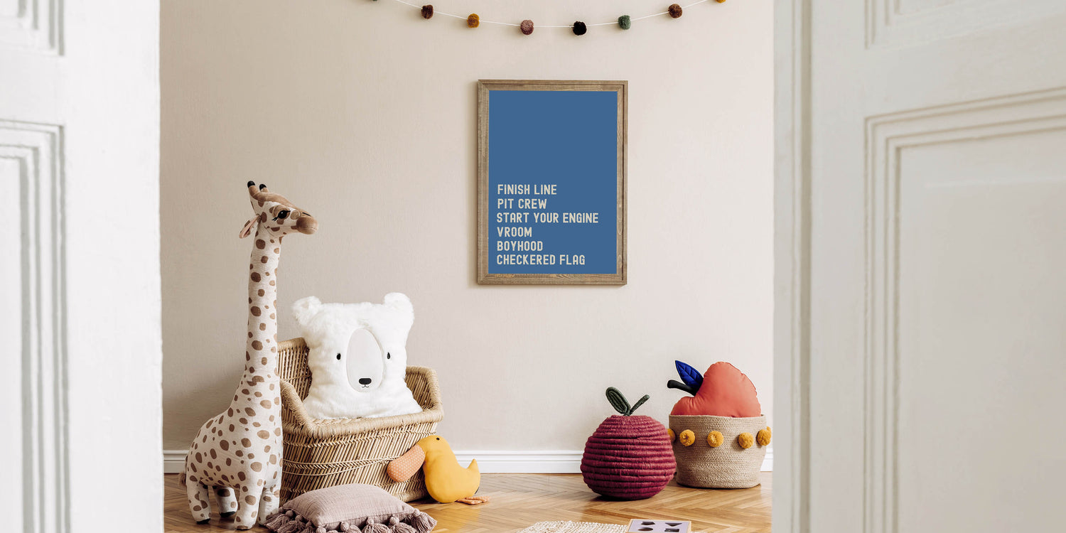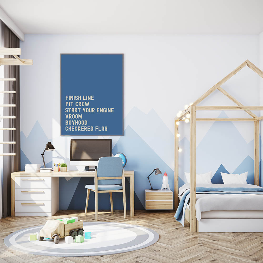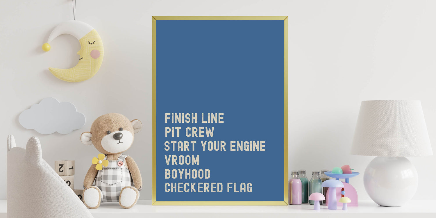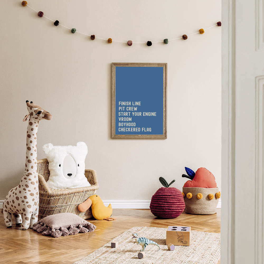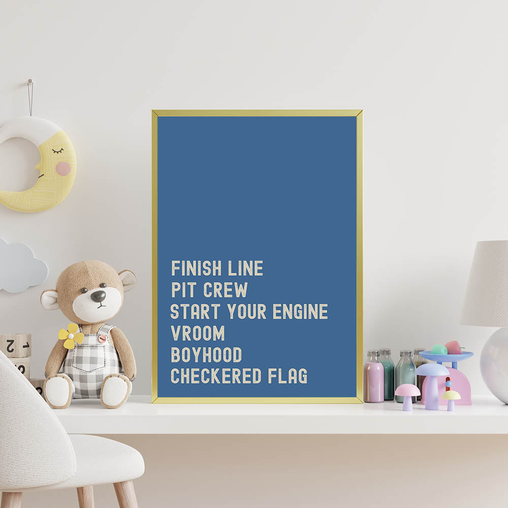This boys wall art print is an exciting way to bring a passion for racing into any child's space. The combination of royal blue art, white text, and a modern layout makes it a standout piece that easily blends into themed rooms.
