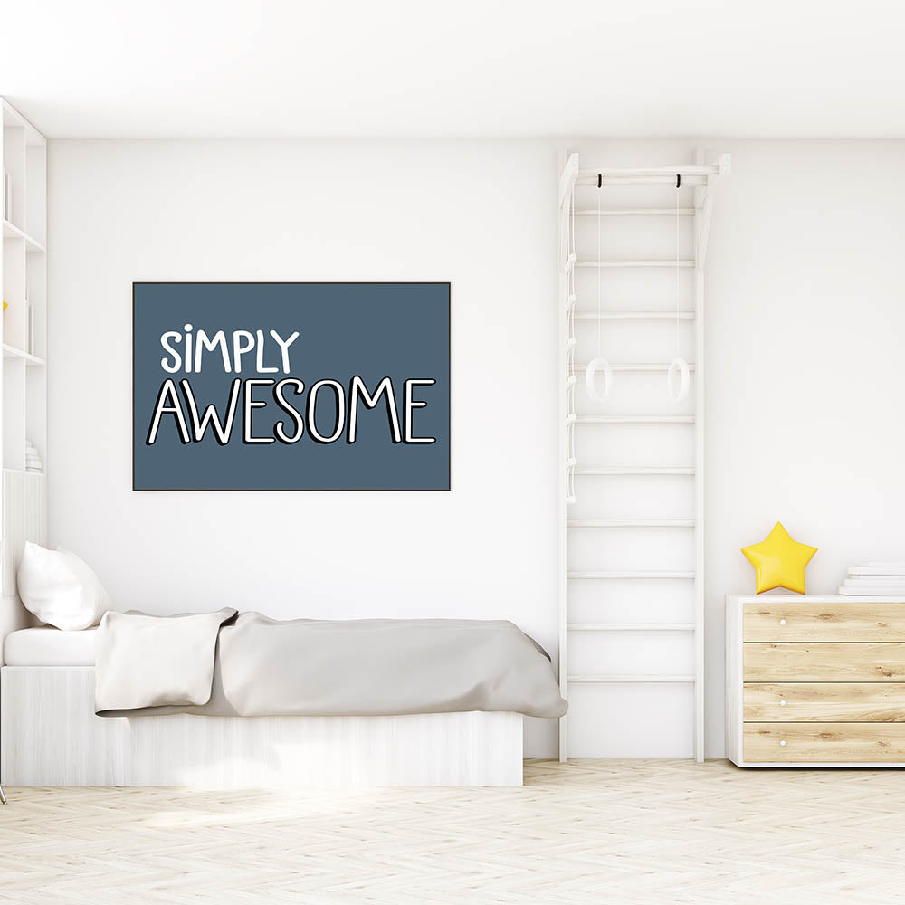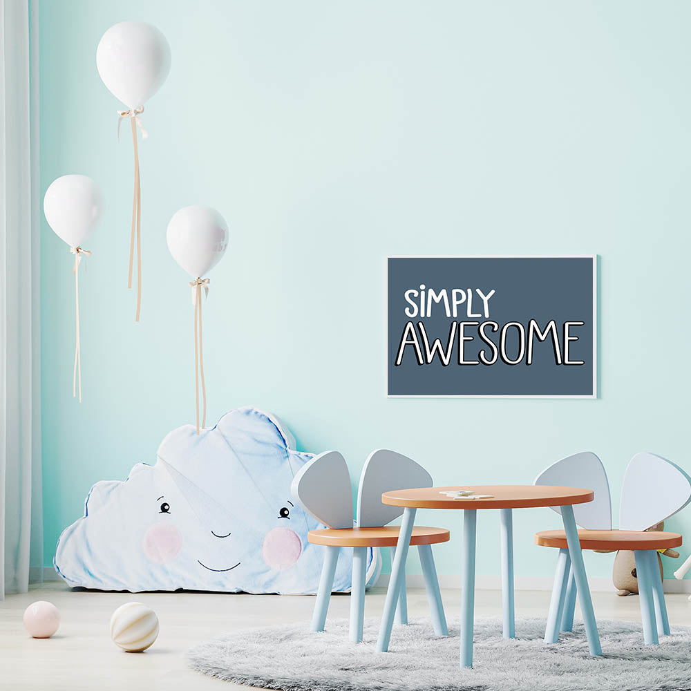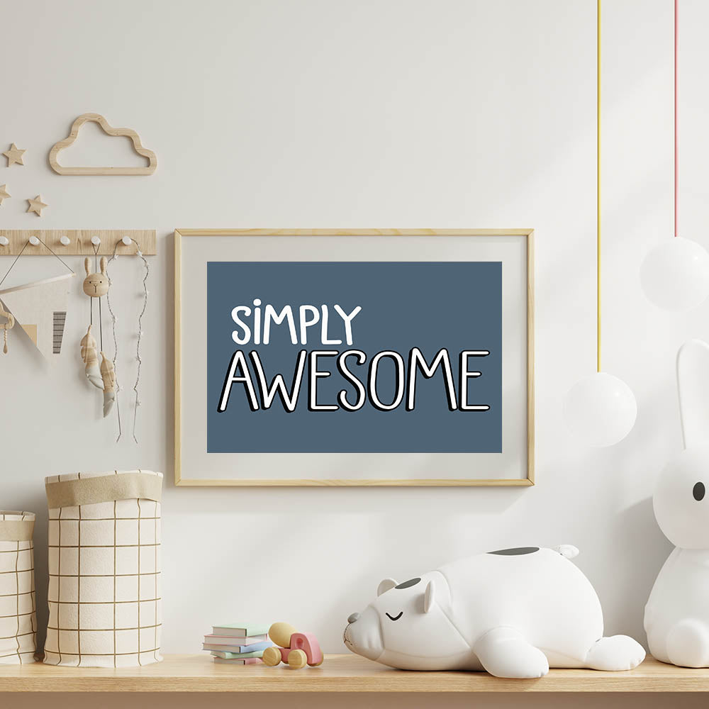 Add a boost of confidence and positivity to your child’s space with this bold and modern typography wall art, featuring the phrase "SIMPLY AWESOME." With a deep blue-gray background and stylish black-and-white lettering, this print makes a perfect statement piece for boys' bedrooms, nurseries, and playrooms. The clean and energetic design blends effortlessly with various decor styles while inspiring creativity and self-expression.
