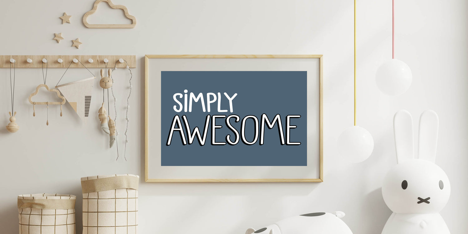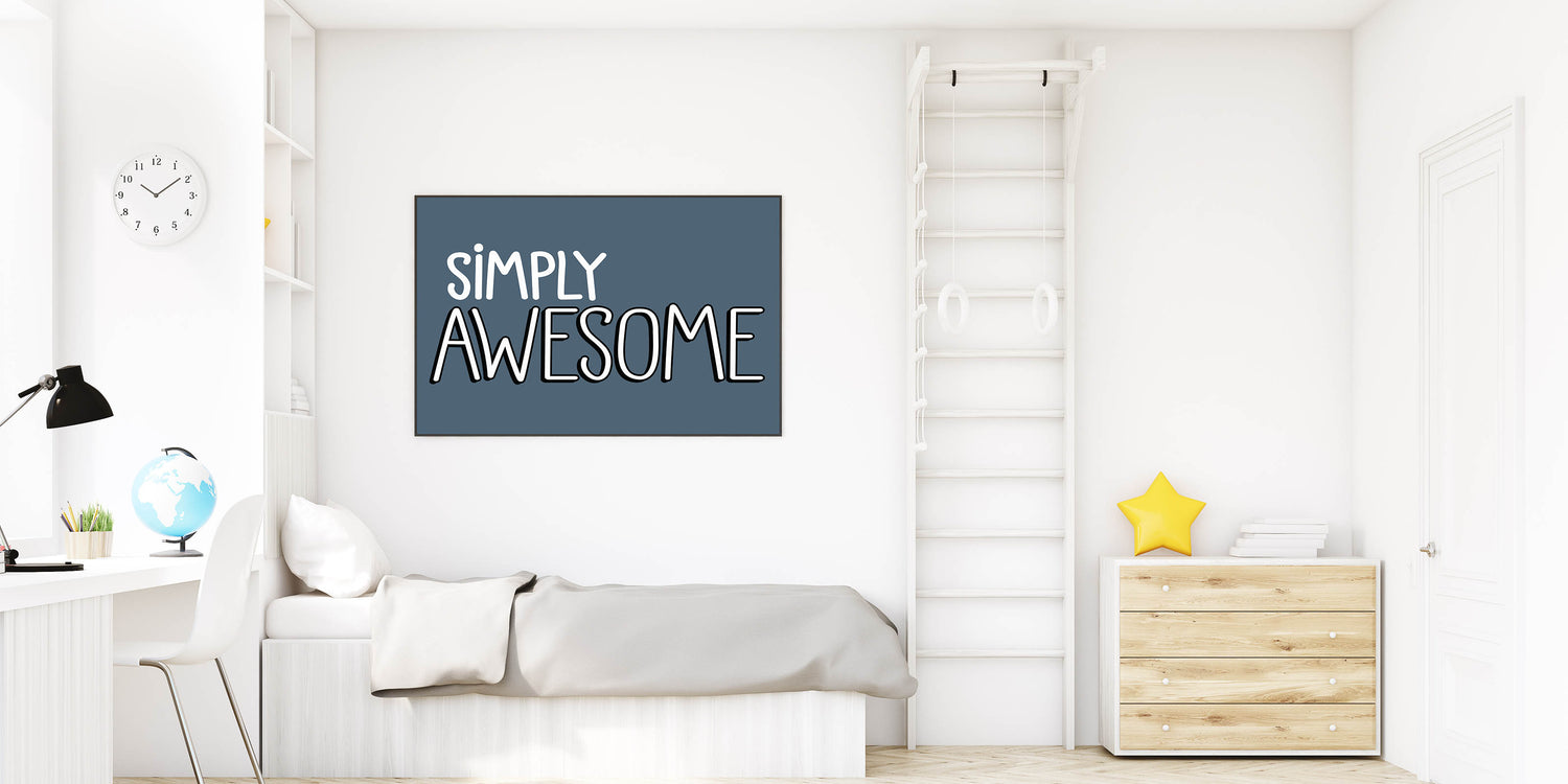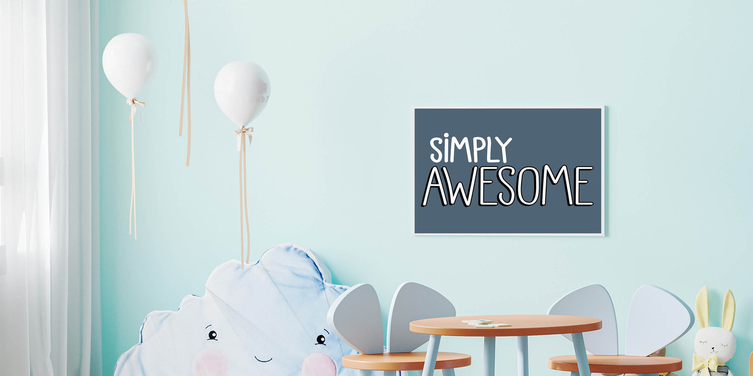 Add a boost of confidence and positivity to your child’s space with this bold and modern typography wall art, featuring the phrase "SIMPLY AWESOME." With a deep blue-gray background and stylish black-and-white lettering, this print makes a perfect statement piece for boys' bedrooms, nurseries, and playrooms. The clean and energetic design blends effortlessly with various decor styles while inspiring creativity and self-expression.