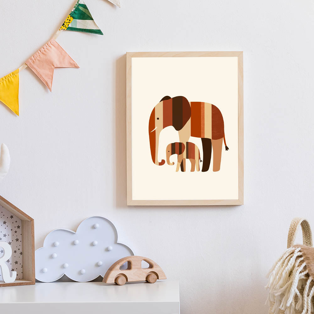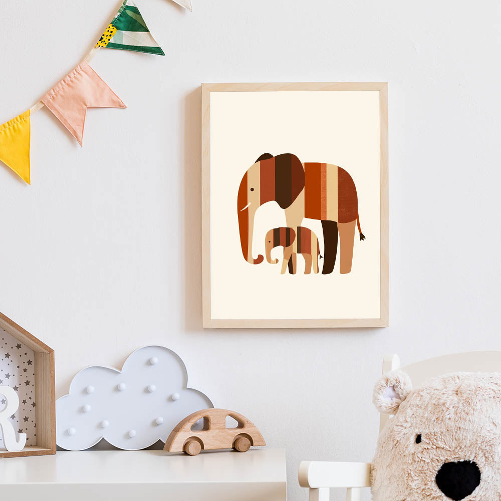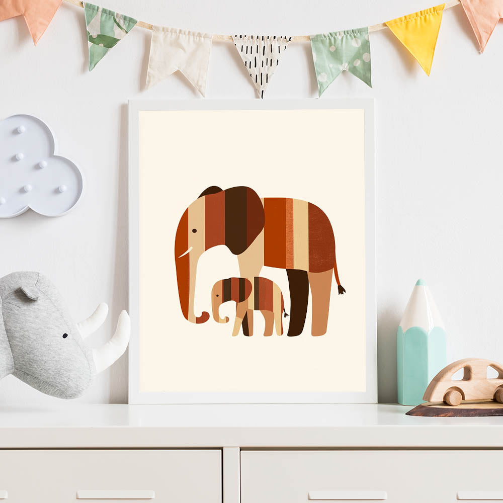 Add a touch of safari charm to your child's space with Safari Elephant Duo, a delightful boys' room wall art print featuring a mother and baby elephant in a modern, geometric-inspired design. This artwork blends warm earthy tones of brown, beige, and burnt orange, creating a cozy and inviting atmosphere perfect for a nursery, playroom, or boys’ bedroom.