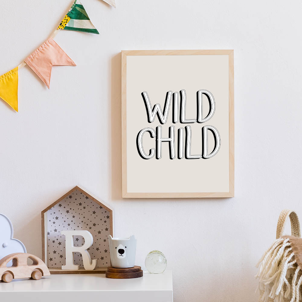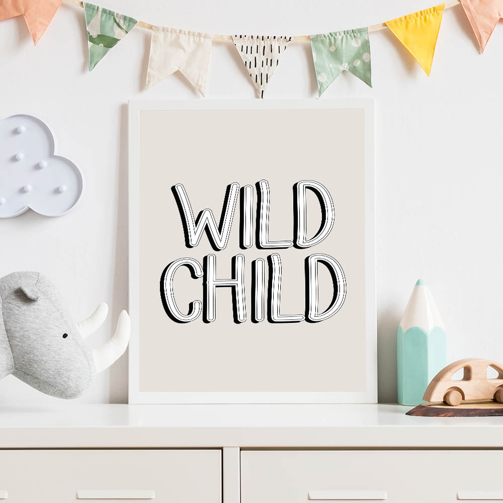 Create a bold and playful statement in your child's space with this modern typography wall art, featuring the phrase "WILD CHILD." With a neutral beige background and bold black-and-white lettering, this artwork blends effortlessly with various decor styles while adding a fun and adventurous touch to boys’ bedrooms, nurseries, and playrooms.