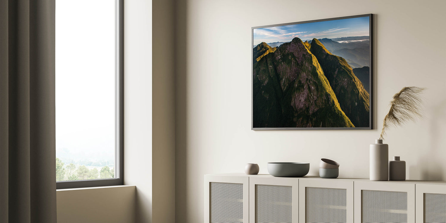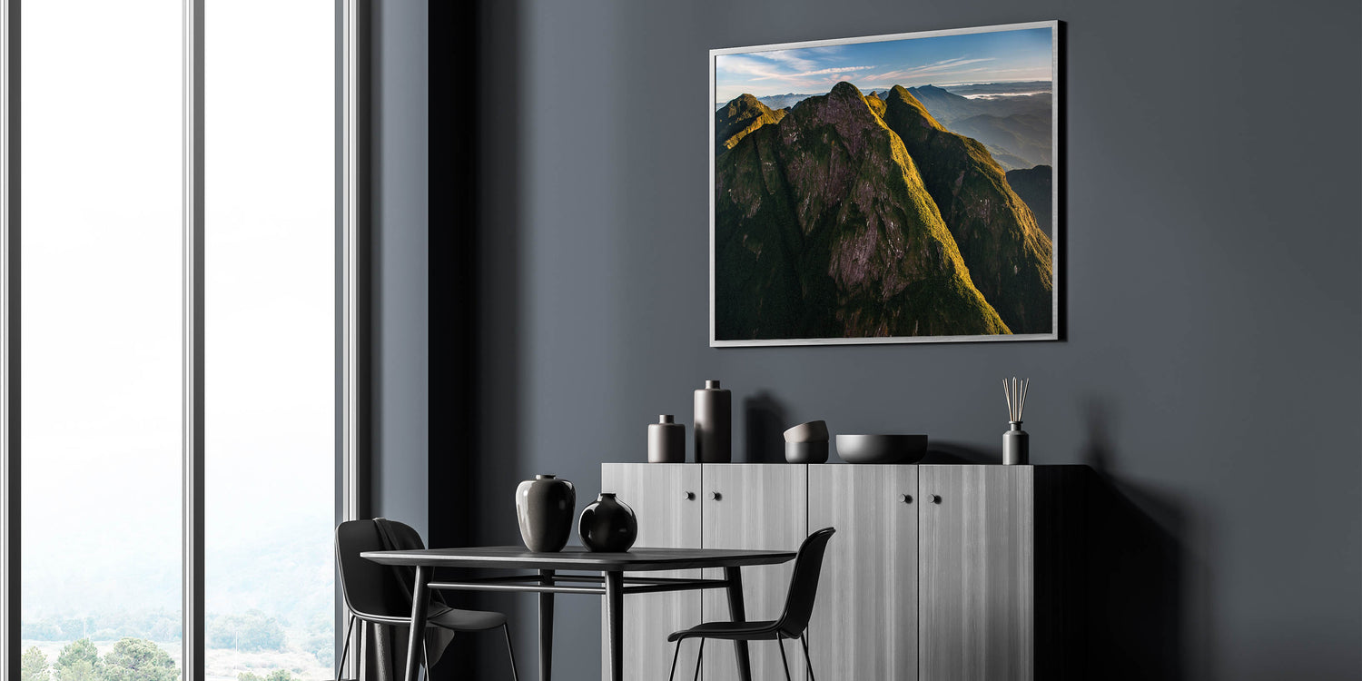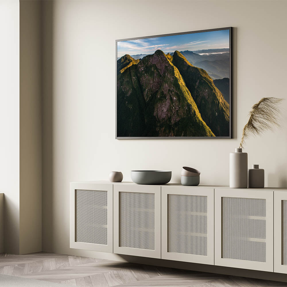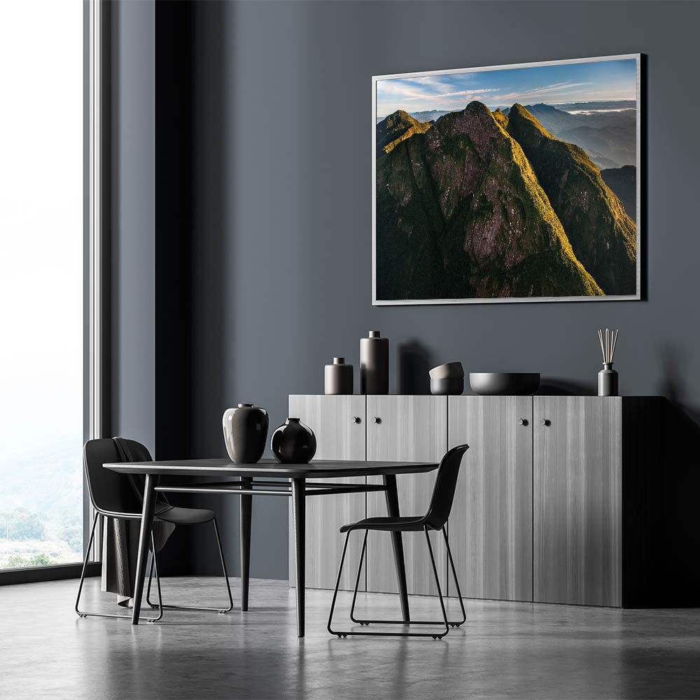 Capture the grandeur of Brazil’s mountainous landscapes with this breathtaking South America scenery print. The rich greens and rocky textures of the mountain peaks are illuminated by the warm sunlight, offering a stunning visual of Brazil’s natural beauty. This Brazilian landscape print is perfect for nature lovers and those looking to bring the majestic outdoors into their home or office decor.