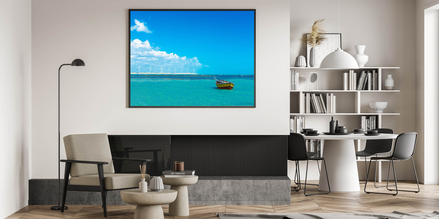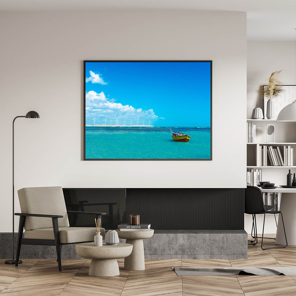 Bring the serene beauty of Brazil’s coastline into your space with this vibrant piece of Brazilian nature photography. This stunning Brazil wall art captures the calm turquoise waters, a solitary fishing boat, and a line of wind turbines in the distance. The peaceful scene offers a perfect balance between natural beauty and modern energy, making it ideal for those seeking South America scenery prints.