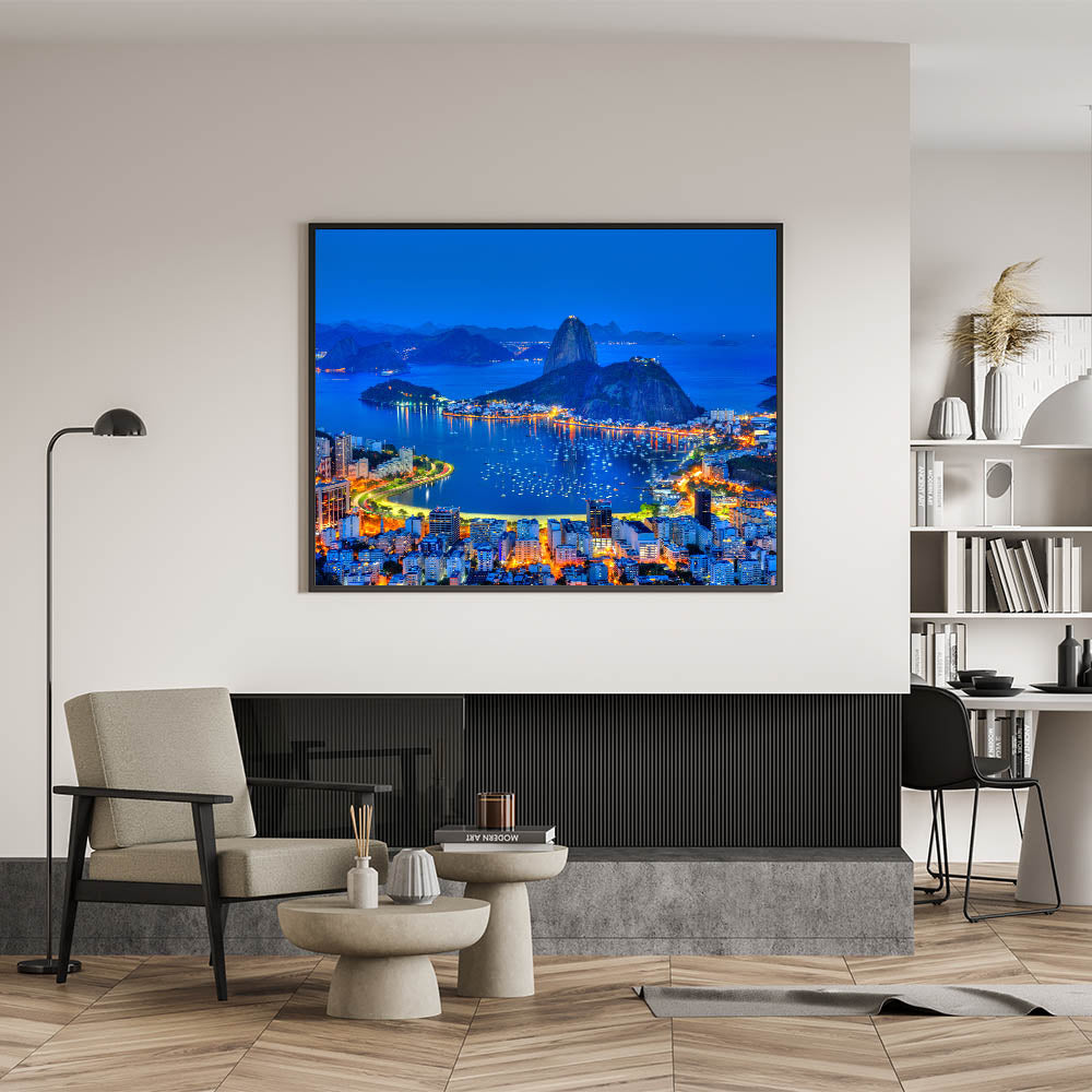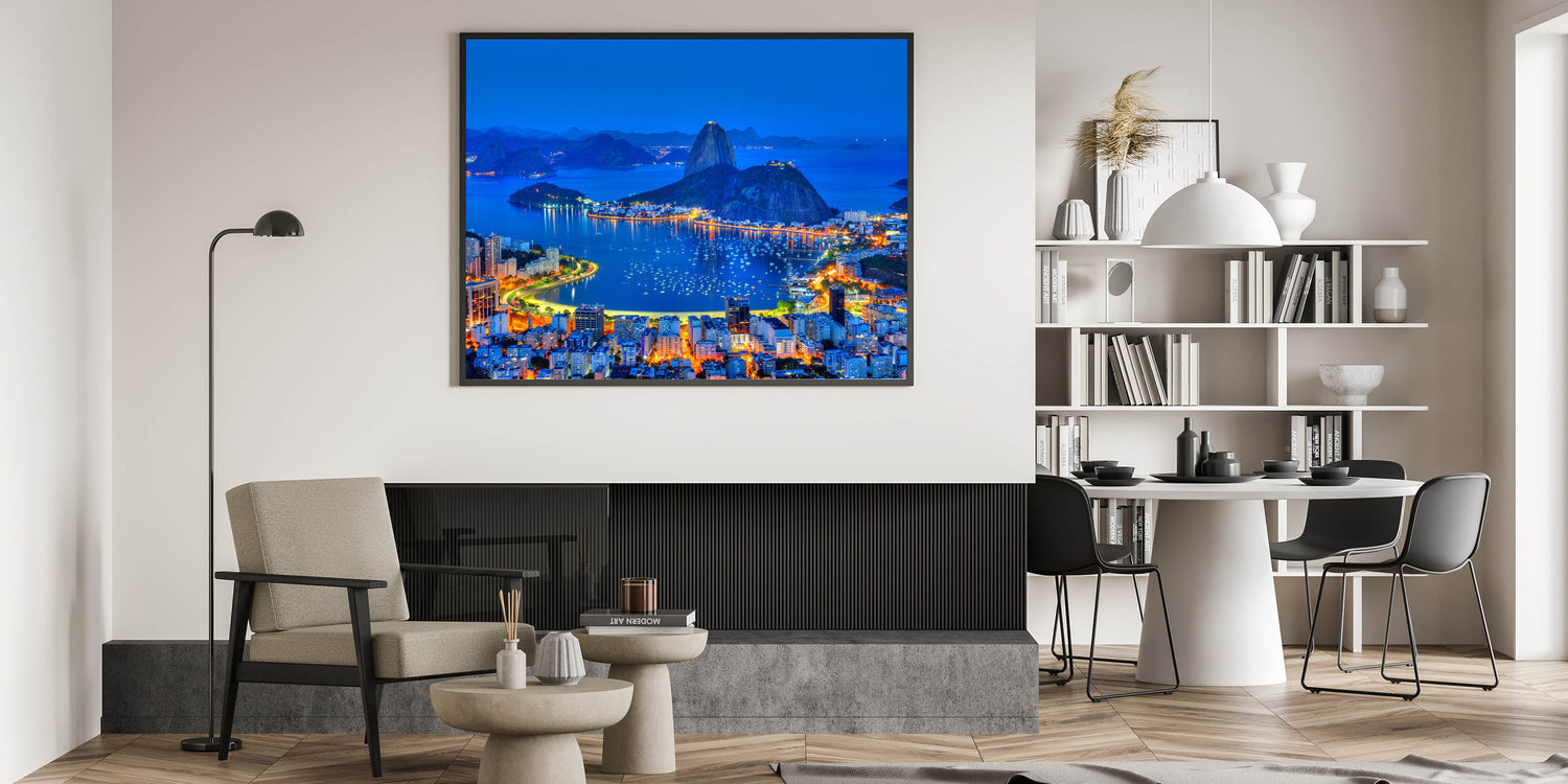 Add a touch of sophistication to your space with this captivating Brazilian nature photography, featuring a stunning nighttime view of Rio de Janeiro. This Brazil wall art captures the vibrant lights reflecting off Guanabara Bay, with the iconic Sugarloaf Mountain looming in the background. The brilliant blue tones of the sky and the city’s warm glow make this an ideal choice for those looking for Brazilian landscape prints that showcase the beauty of South America scenery.
