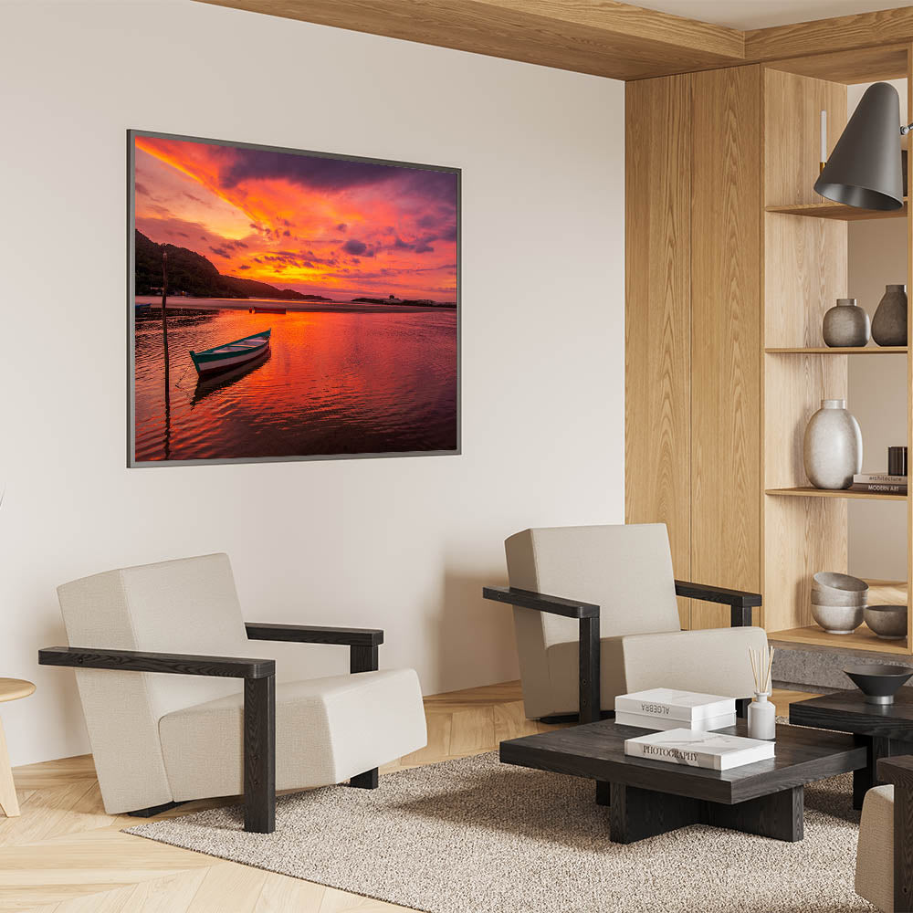Unwind in the tranquil beauty of a Brazilian sunset with our "Brazilian Sunset Serenity - Tropical Wall Art." This piece captures a peaceful evening where the sky explodes in hues of orange and red, reflecting over calm waters with a solitary boat at rest. It's a slice of paradise that evokes a sense of peace and wonder, perfect for any space that could use a touch of nature's majesty.