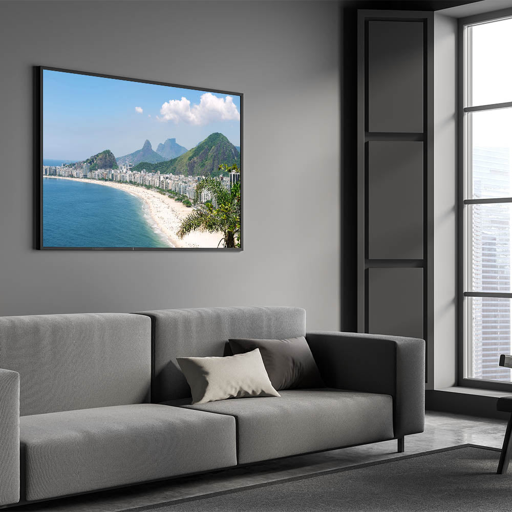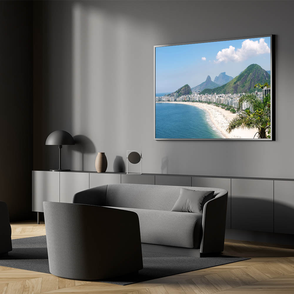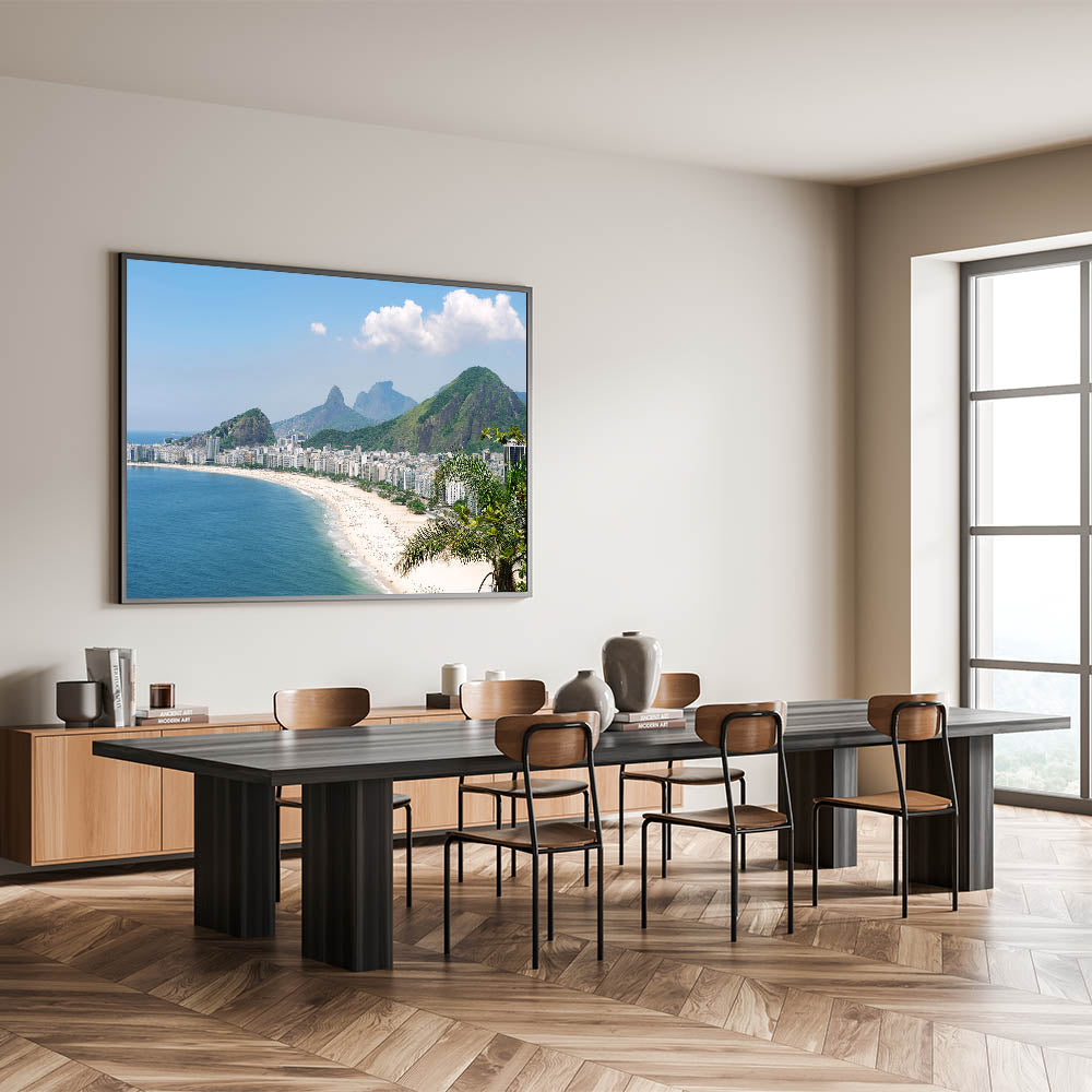 Capture the vibrant beauty of Rio de Janeiro with this breathtaking Brazil wall art, featuring a panoramic view of the iconic Copacabana Beach. This Brazilian landscape print showcases the contrast between the stunning coastline, the rolling green mountains, and the bustling urban landscape. Perfect for those seeking South America scenery prints, this artwork embodies the energy and charm of one of Brazil's most famous cities.