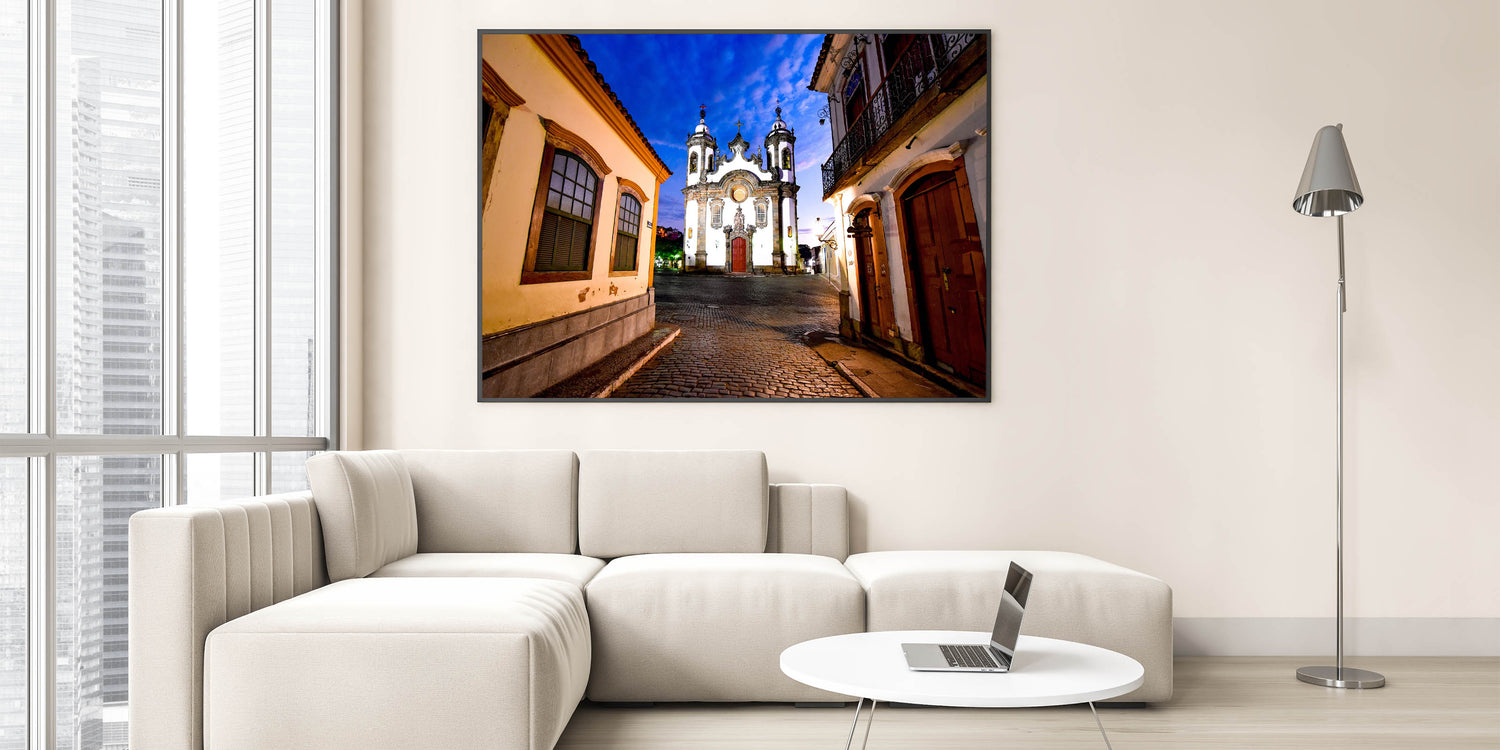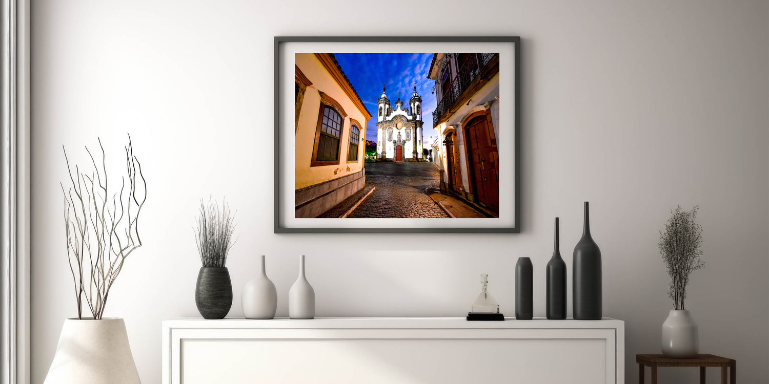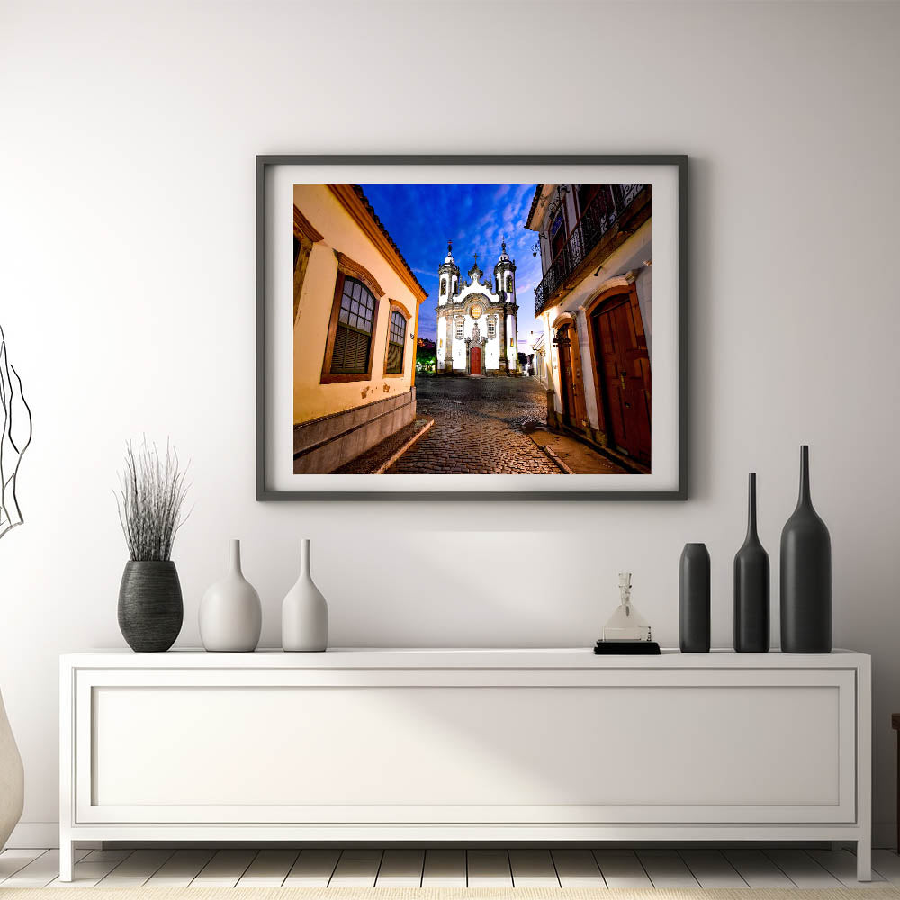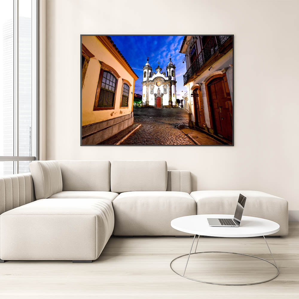 Immerse yourself in the rich history of Brazil with this striking South America scenery print. This stunning artwork captures the intricate colonial architecture of Ouro Preto at dusk, with its beautifully preserved baroque church framed by the charming cobblestone streets. Ideal for anyone looking to bring a touch of Brazilian history into their home, this Brazil wall art is a timeless addition to any decor.