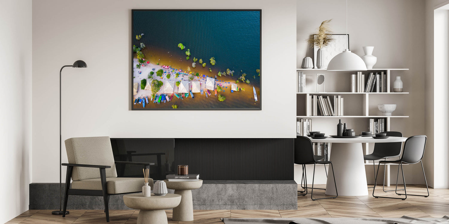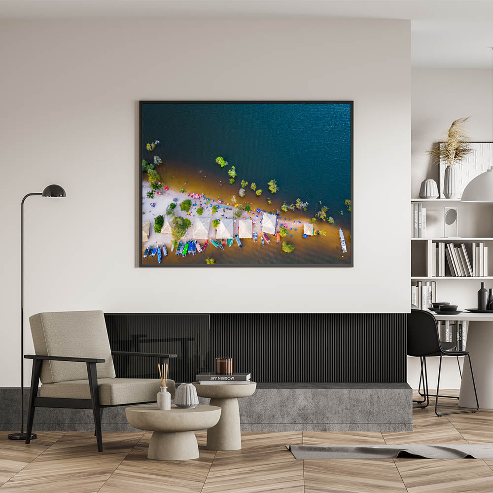 This colorful aerial view of a tropical river beach in Brazil captures the vibrancy and natural beauty of South America’s diverse landscapes. Featuring lush greenery, rustic huts, and vibrant boats lined up by the water, this stunning wall art piece is perfect for anyone looking to bring a touch of Brazil’s lively coastal scenery into their home or office.