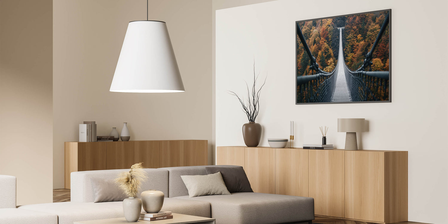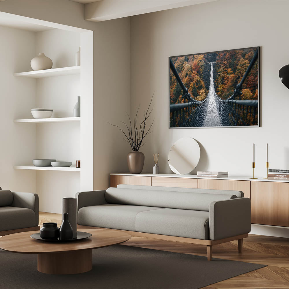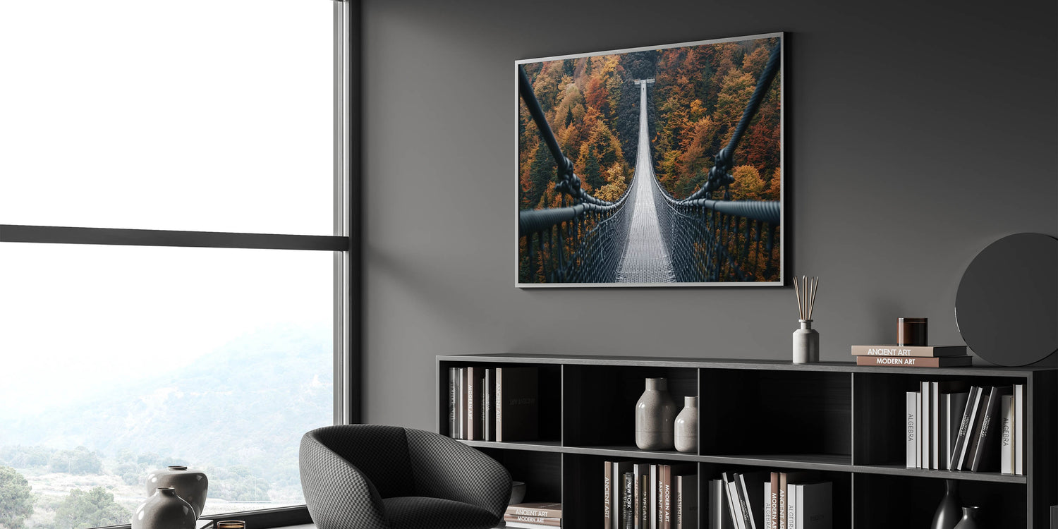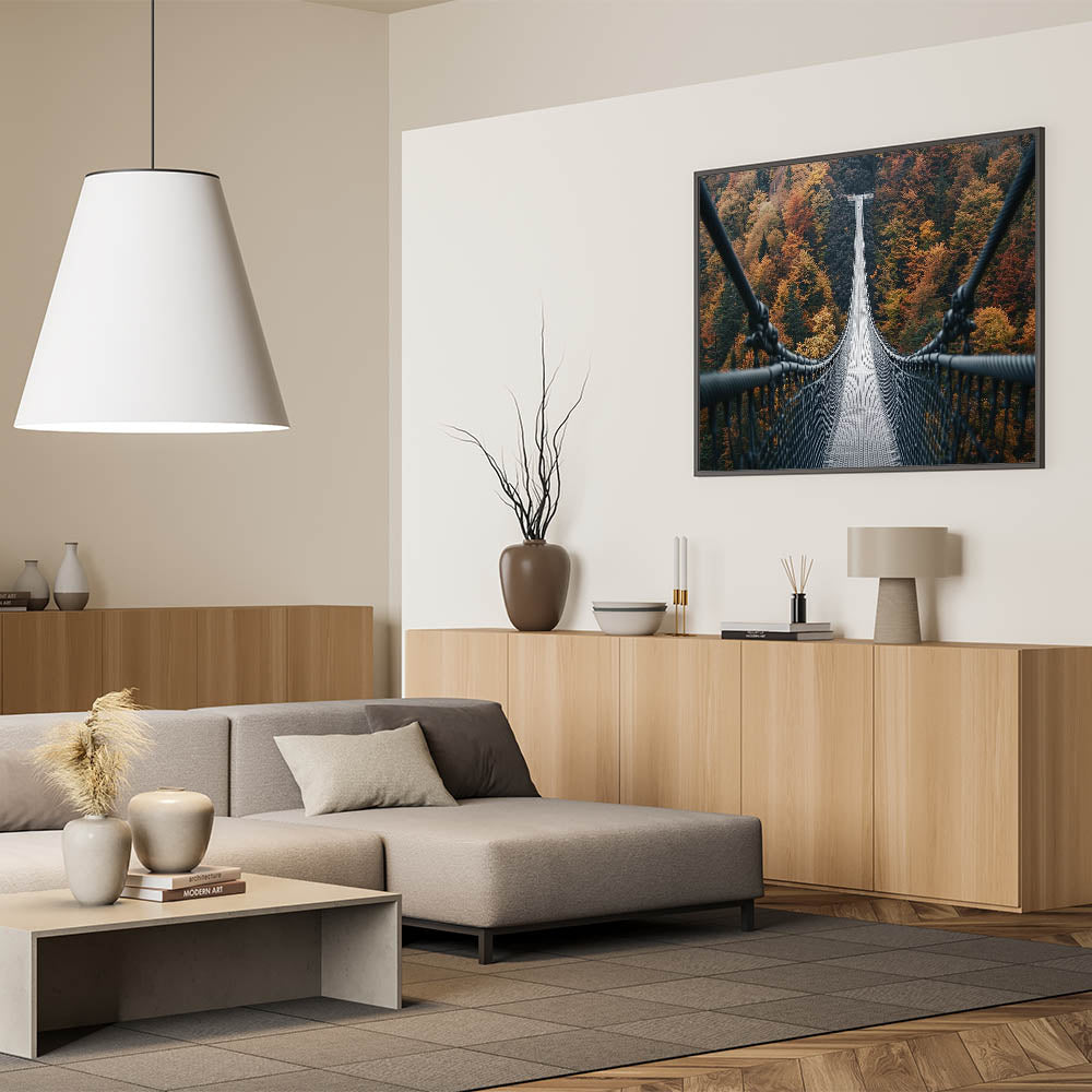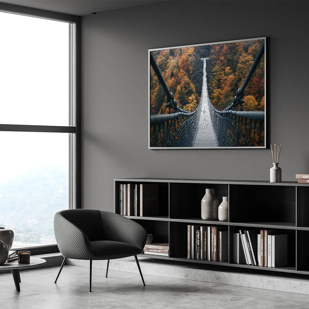 Take a walk through the vibrant beauty of fall with this decorative bridge wall art, featuring a suspension bridge stretching across a forest alive with rich autumn hues. This striking artwork perfectly captures the majesty of nature’s seasonal transformation, blending warm colors with the bold lines of architectural design. It's an ideal centerpiece for bringing the essence of autumn into your home.
