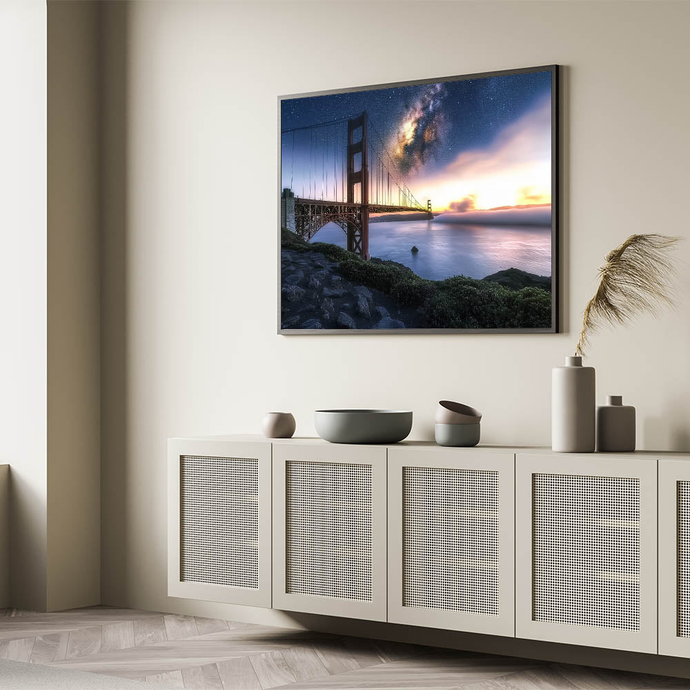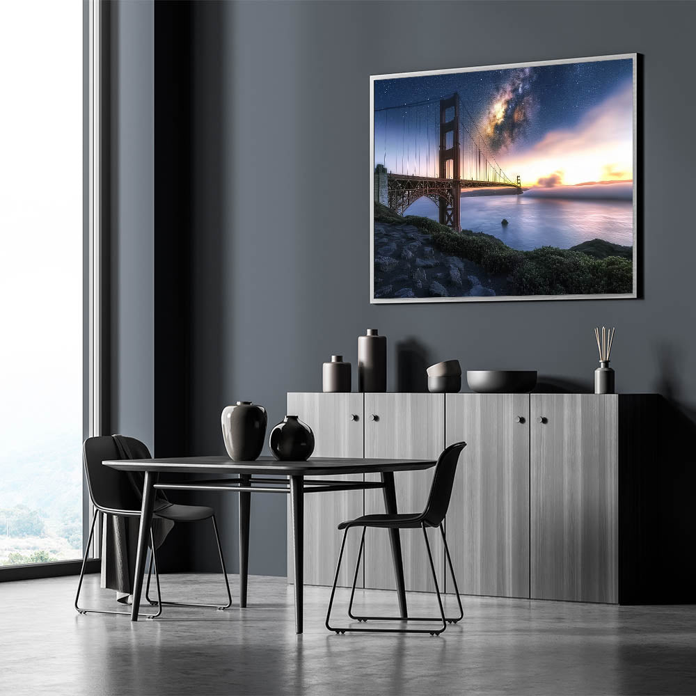 Capture the stunning elegance of this decorative bridge wall art, featuring the Golden Gate Bridge against a breathtaking starry night sky and a vibrant sunset. This masterpiece blends celestial beauty with architectural grandeur, creating a captivating visual that radiates serenity and wonder. Perfect for adding sophistication to your space, this artwork embodies both modernity and timeless charm.
