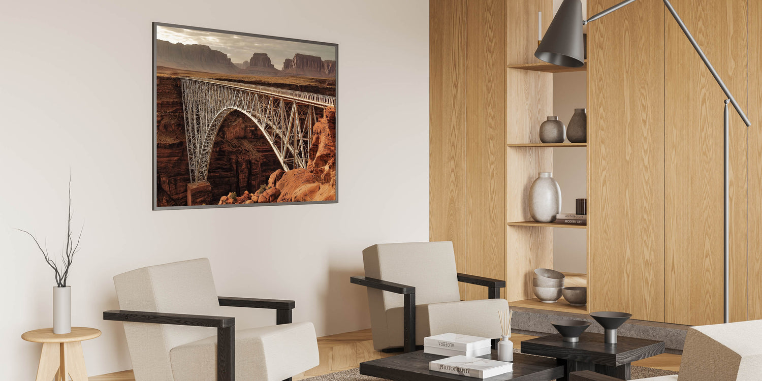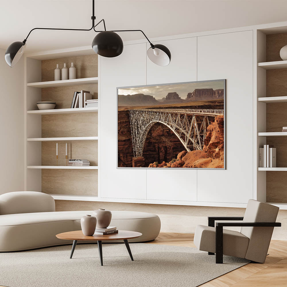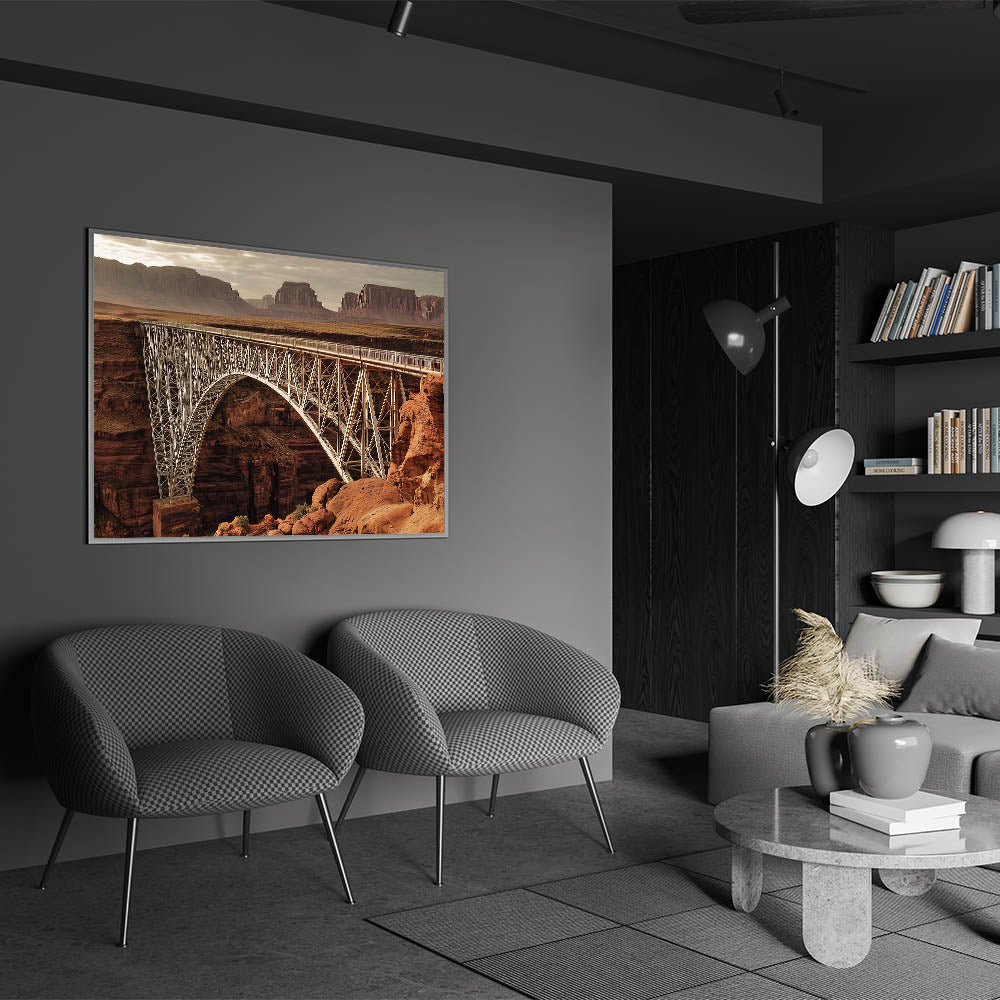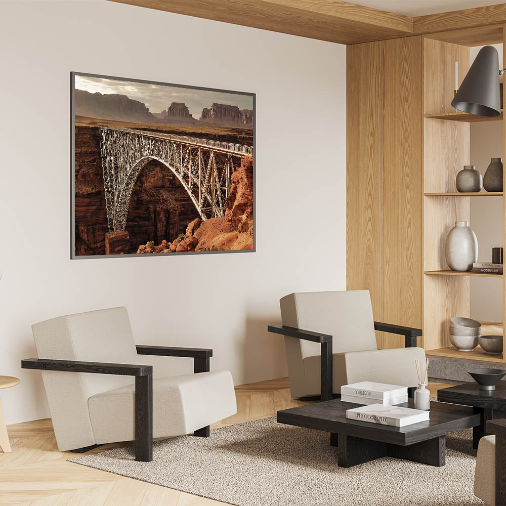 Add a touch of elegance and adventure to your home with this captivating decorative bridge wall art. This artwork features a stunning steel bridge spanning a rugged canyon landscape, bathed in warm golden hues and earthy tones. Perfect for enhancing any modern or rustic interior, this piece beautifully captures the harmony between architectural marvels and natural beauty.