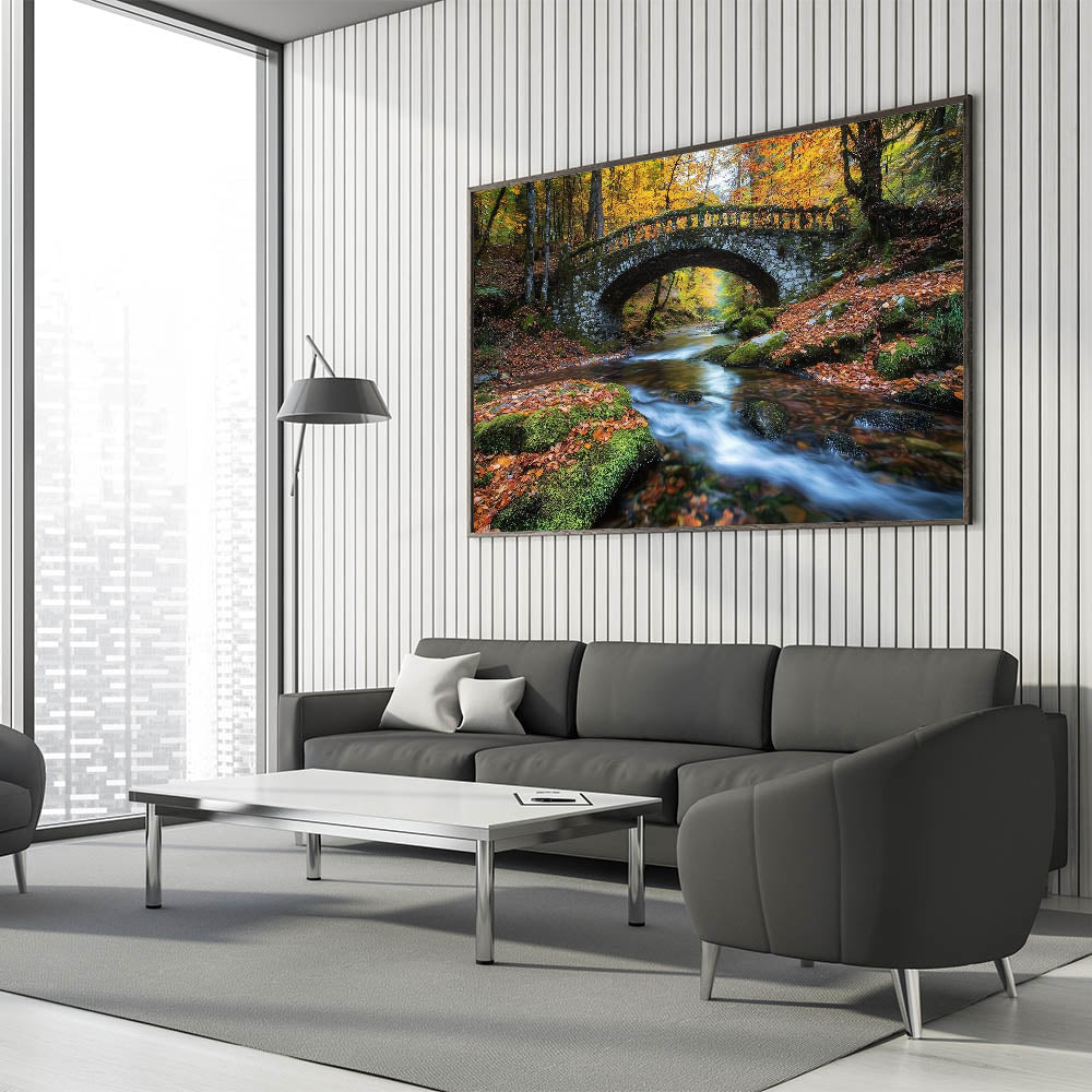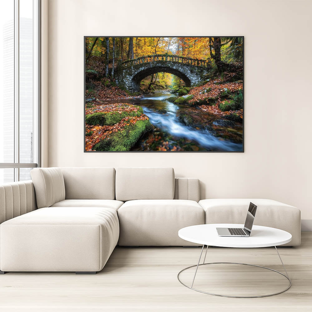Experience the charm of a tranquil autumn forest with this rustic bridge art. This exquisite artwork showcases an old stone bridge nestled in a vibrant woodland, with golden and orange autumn leaves reflecting on the glistening stream below. The lush moss-covered rocks and crystal-clear flowing water create a serene and inviting ambiance, making this piece a perfect addition to your living room, office, or bedroom.