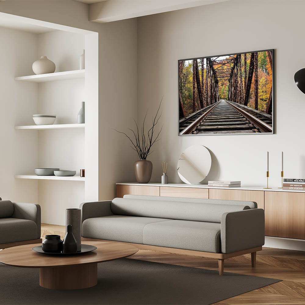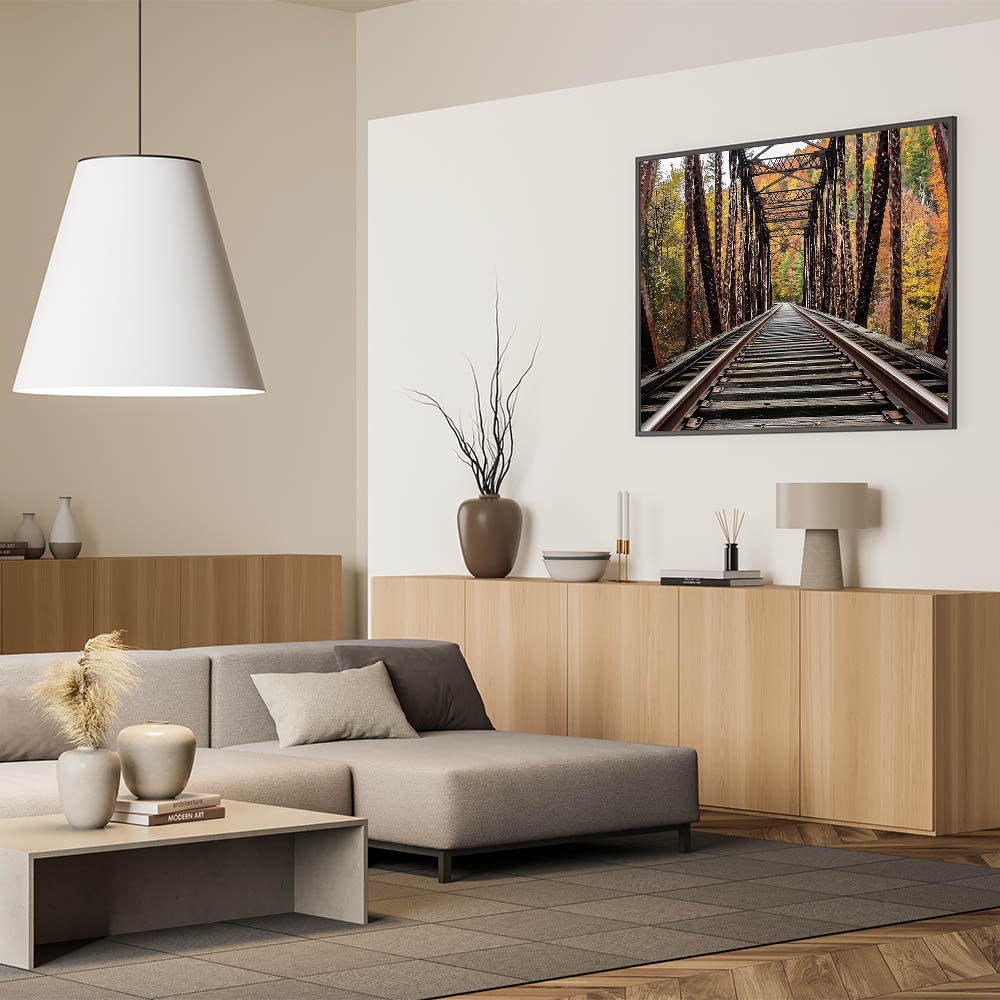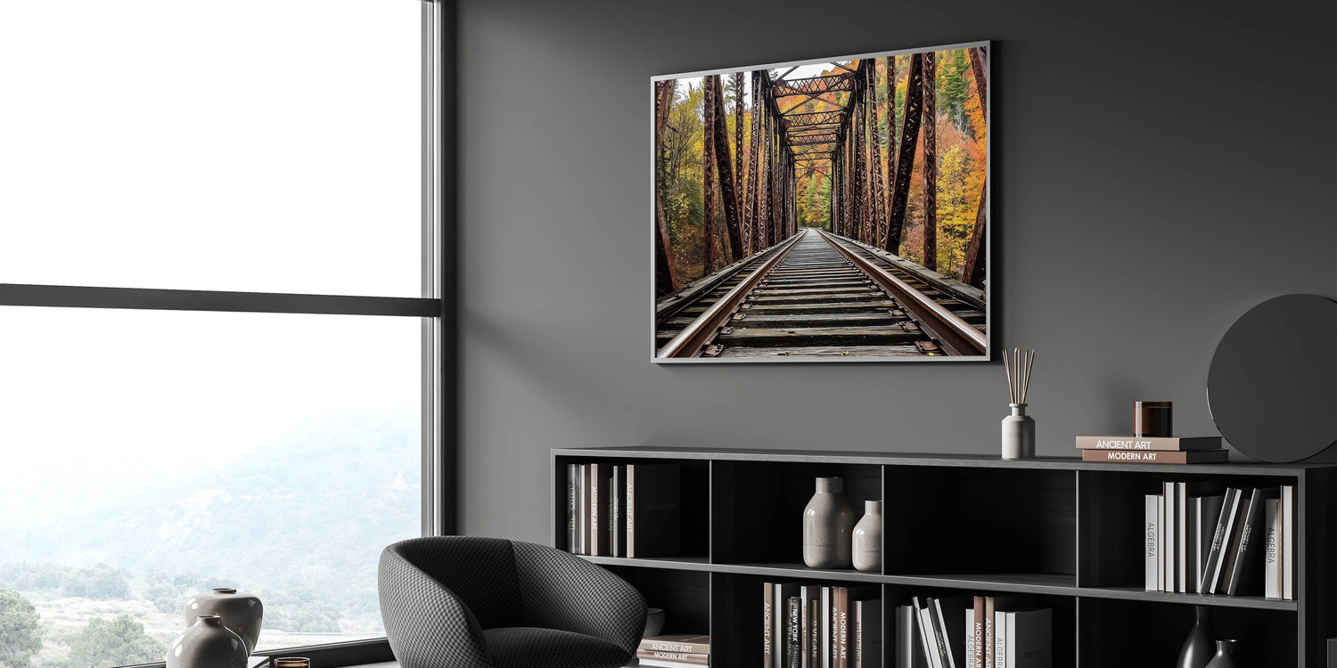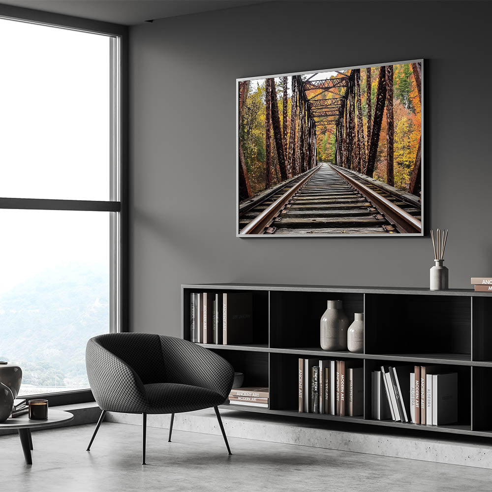Bring the warmth of autumn into your home with this rustic-inspired bridge painting. Whether displayed in a living room, office, or bedroom, its rich colors and timeless design make it a versatile piece. Perfect for art and nature lovers, this unique bridge art print celebrates the beauty of fall and industrial craftsmanship.