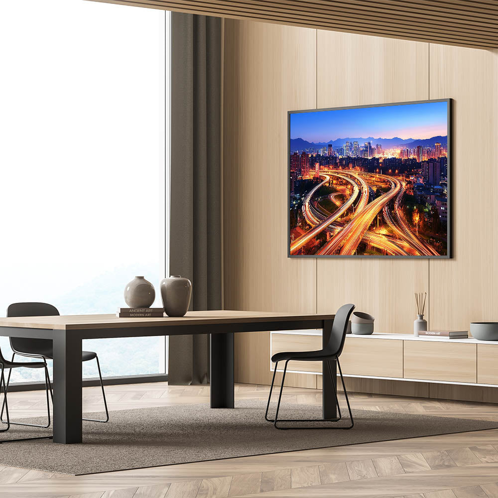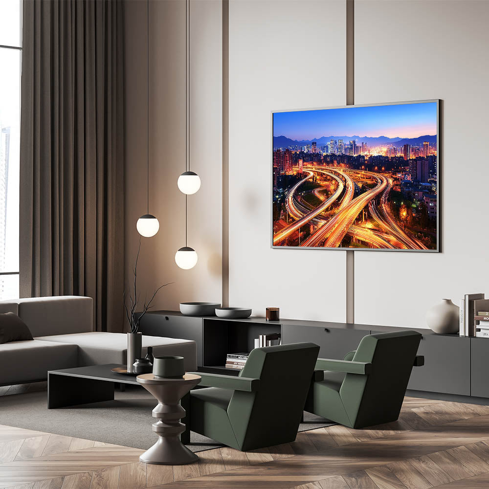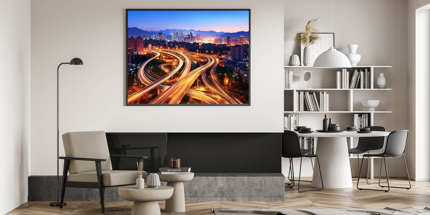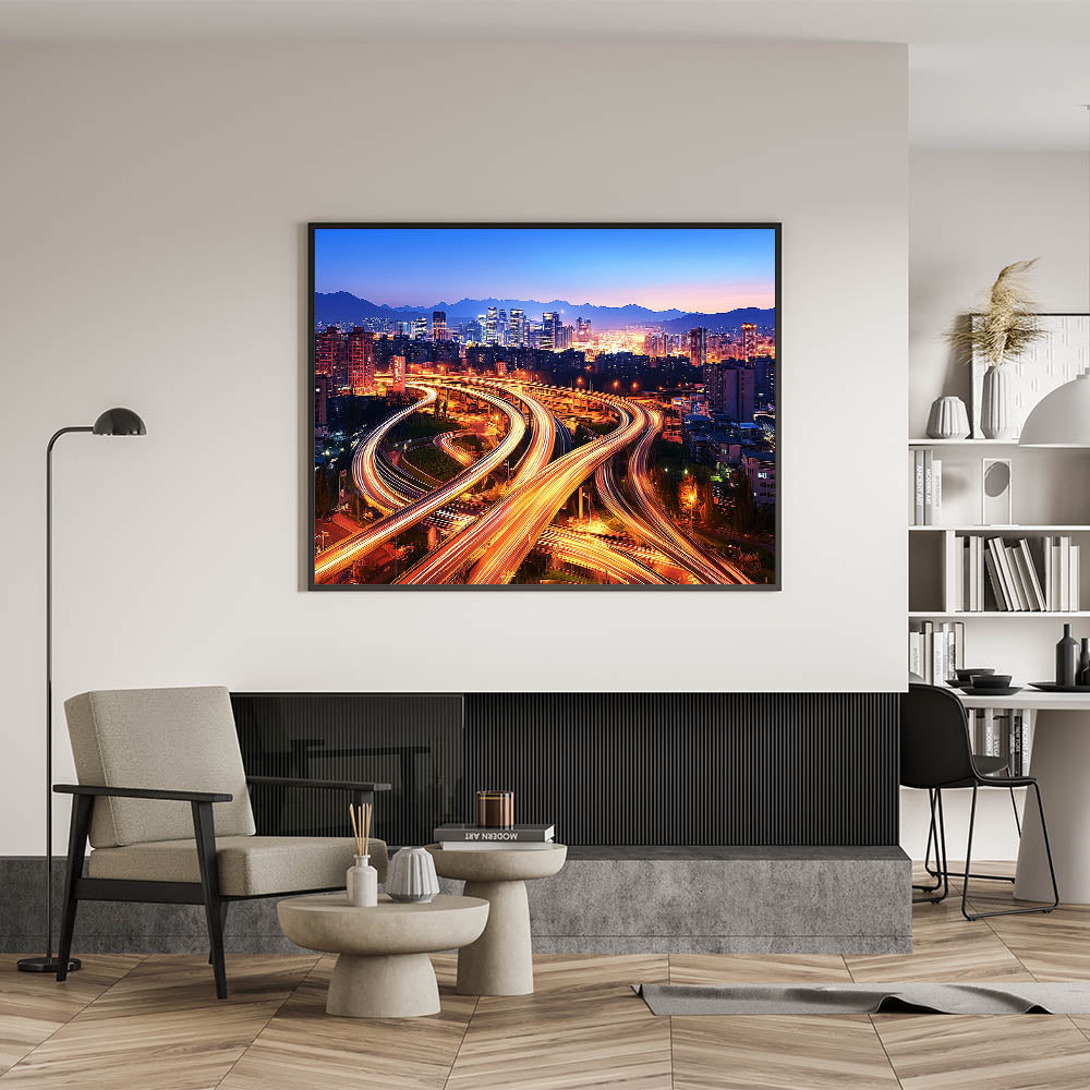 Capture the vibrancy of city life with this stunning scenic bridge art. This artwork features a mesmerizing view of illuminated highways snaking through a bustling urban skyline under a deep blue dusk sky. The light trails of traffic create a dynamic flow of energy, perfectly contrasting with the glowing cityscape in the background. Ideal for modern, industrial, or urban-inspired interiors, this piece combines architectural beauty with the pulse of city life.