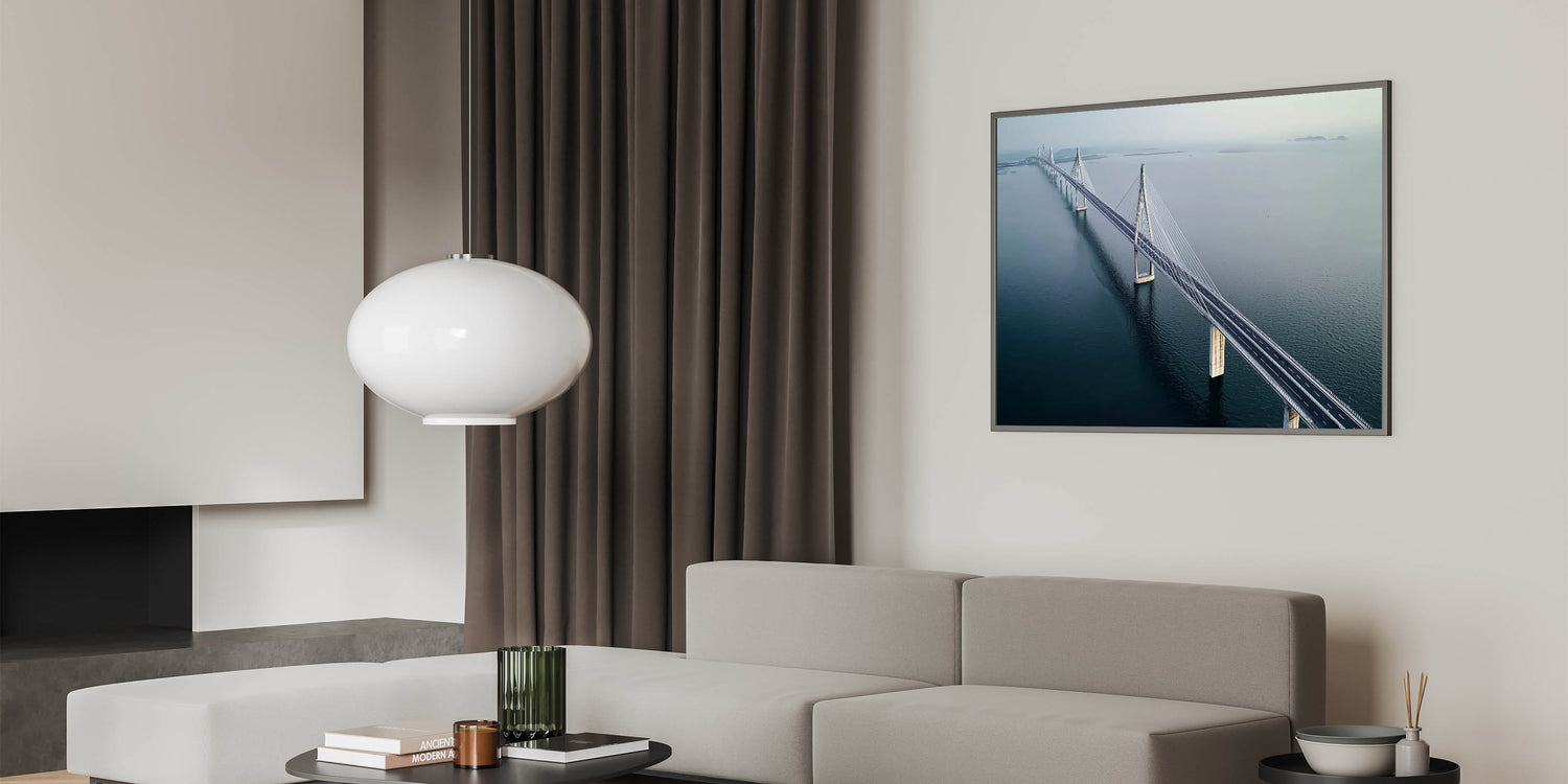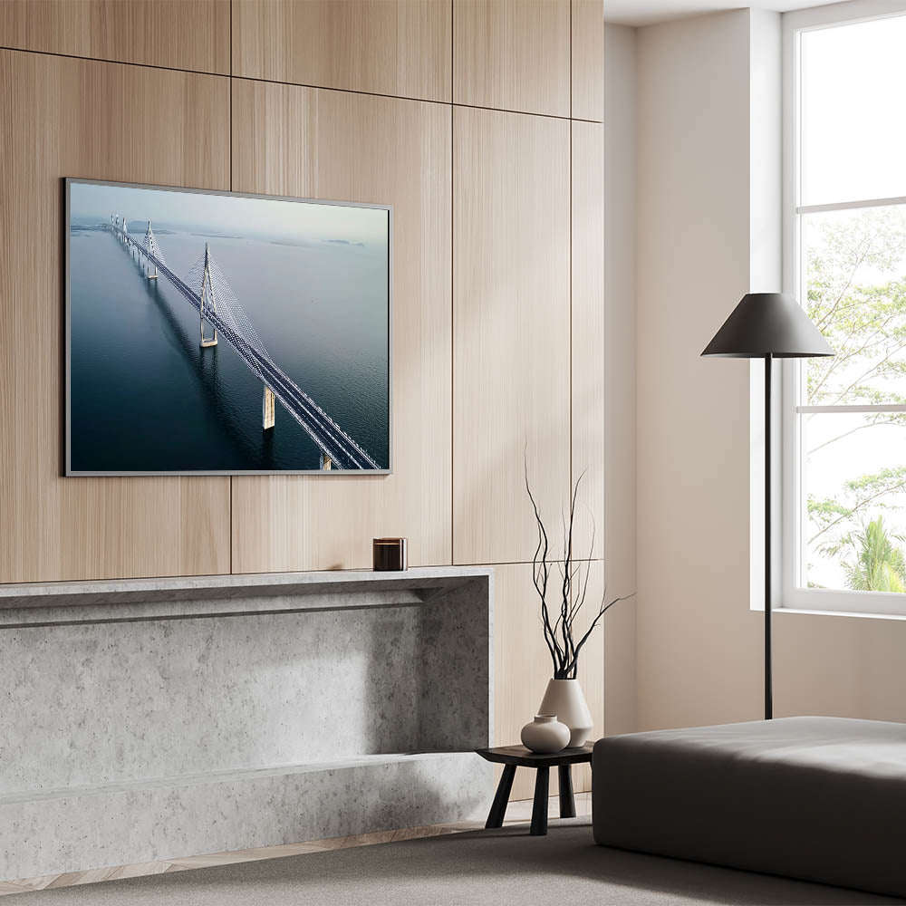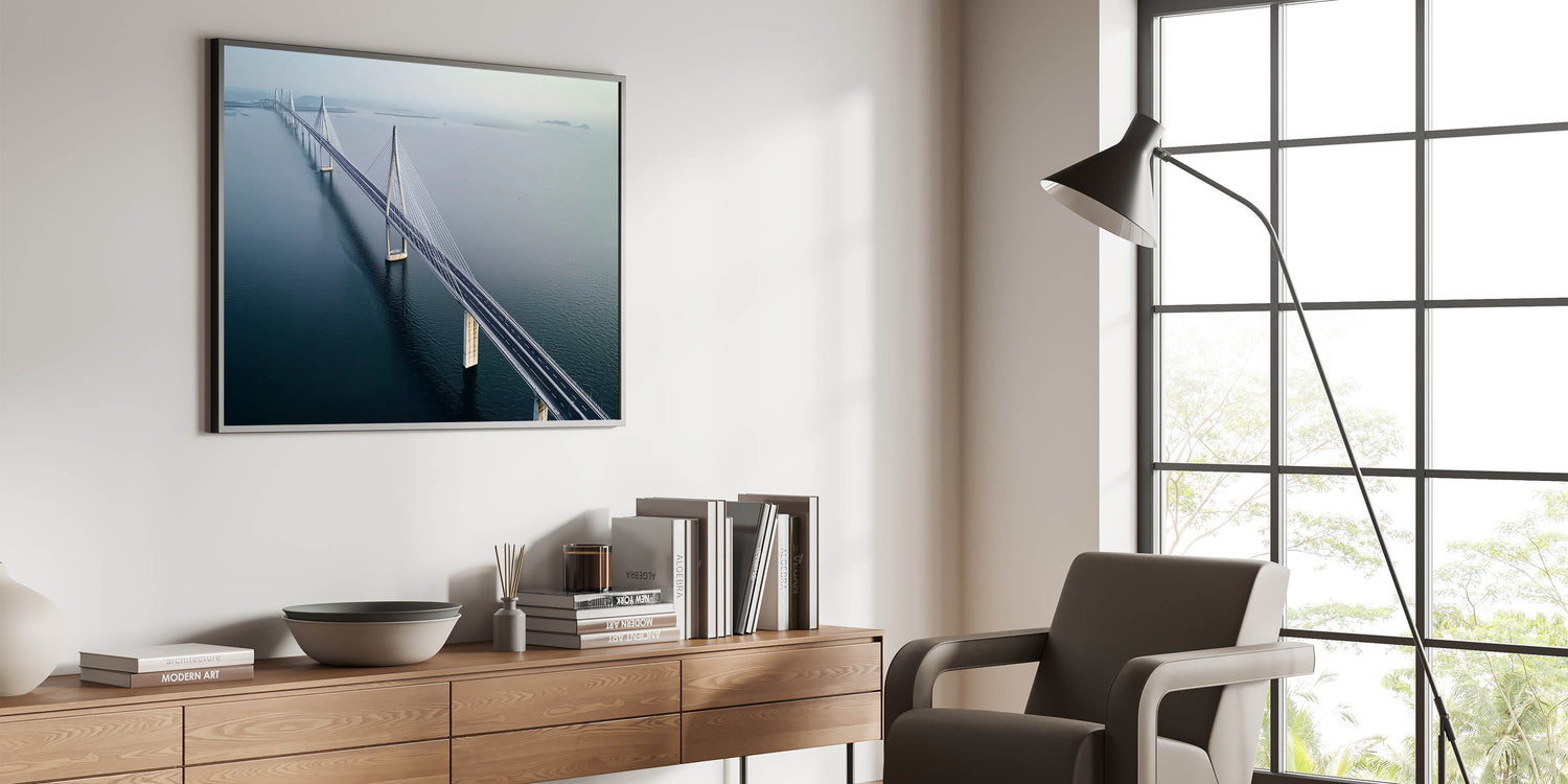 - High-quality scenic bridge art prints showcasing a modern cable-stayed bridge, available in Stretched Canvas, Framed Canvas, Acrylic Glass, and Framed Acrylic Glass formats.
