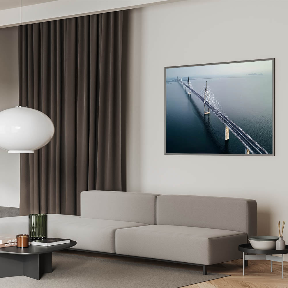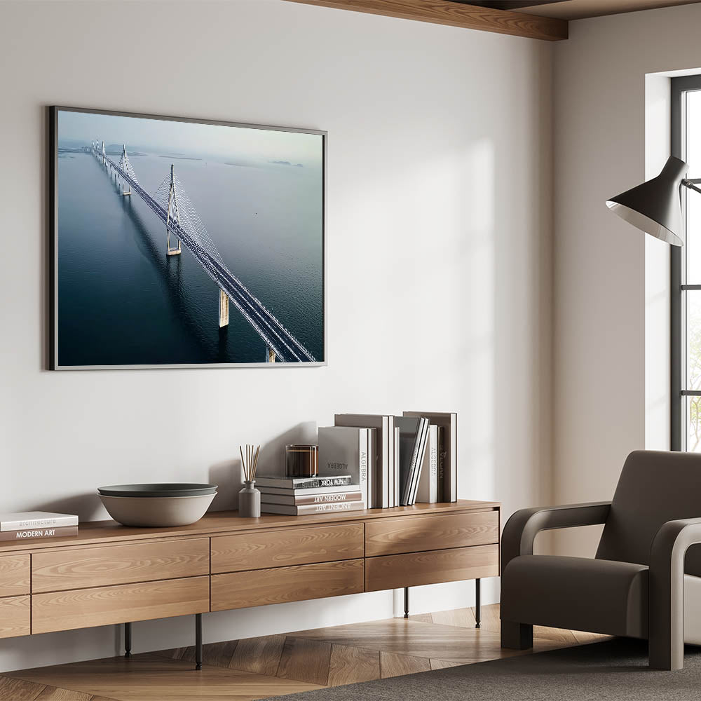 Embrace the elegance of modern engineering with this captivating scenic bridge art. This artwork features an aerial view of a sleek cable-stayed bridge stretching across serene ocean waters. The minimalist design and soft hues of the sea and sky make this piece an ideal addition to contemporary, industrial, or coastal interiors. This bridge artwork perfectly blends architectural brilliance with the calming beauty of nature.