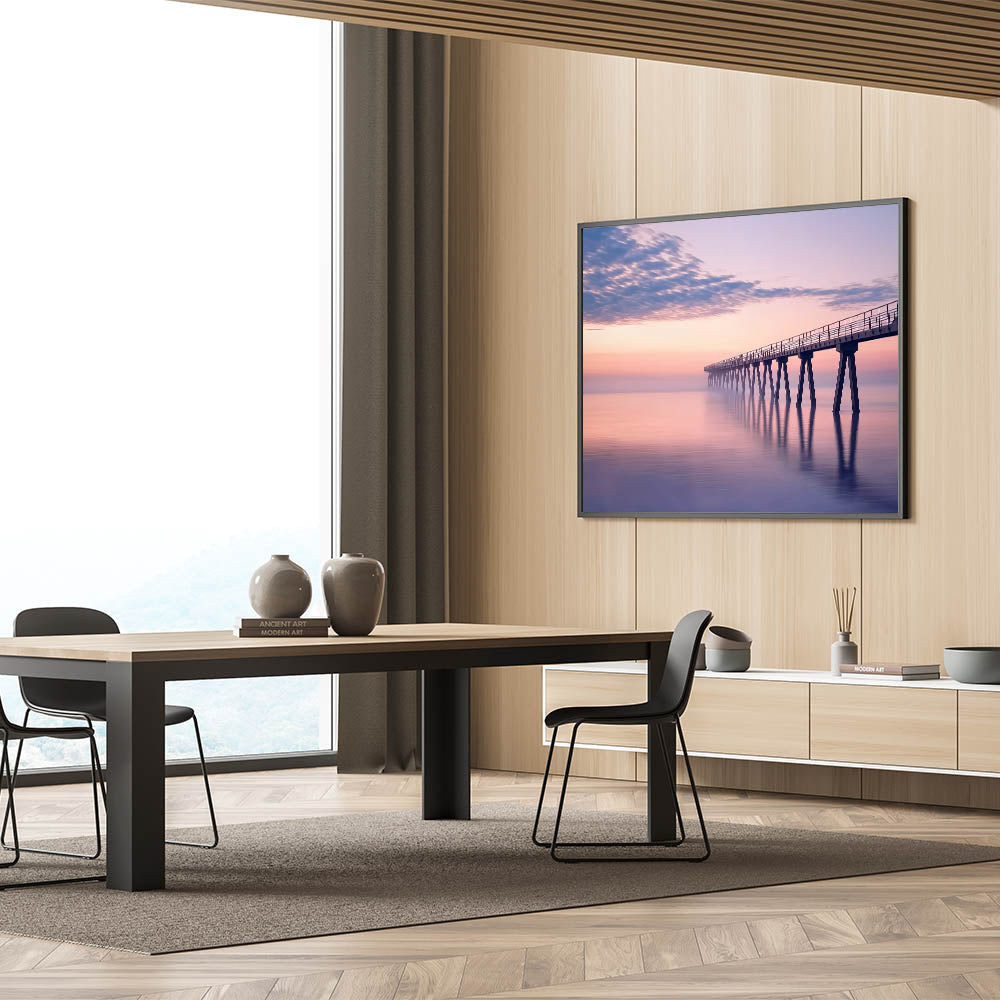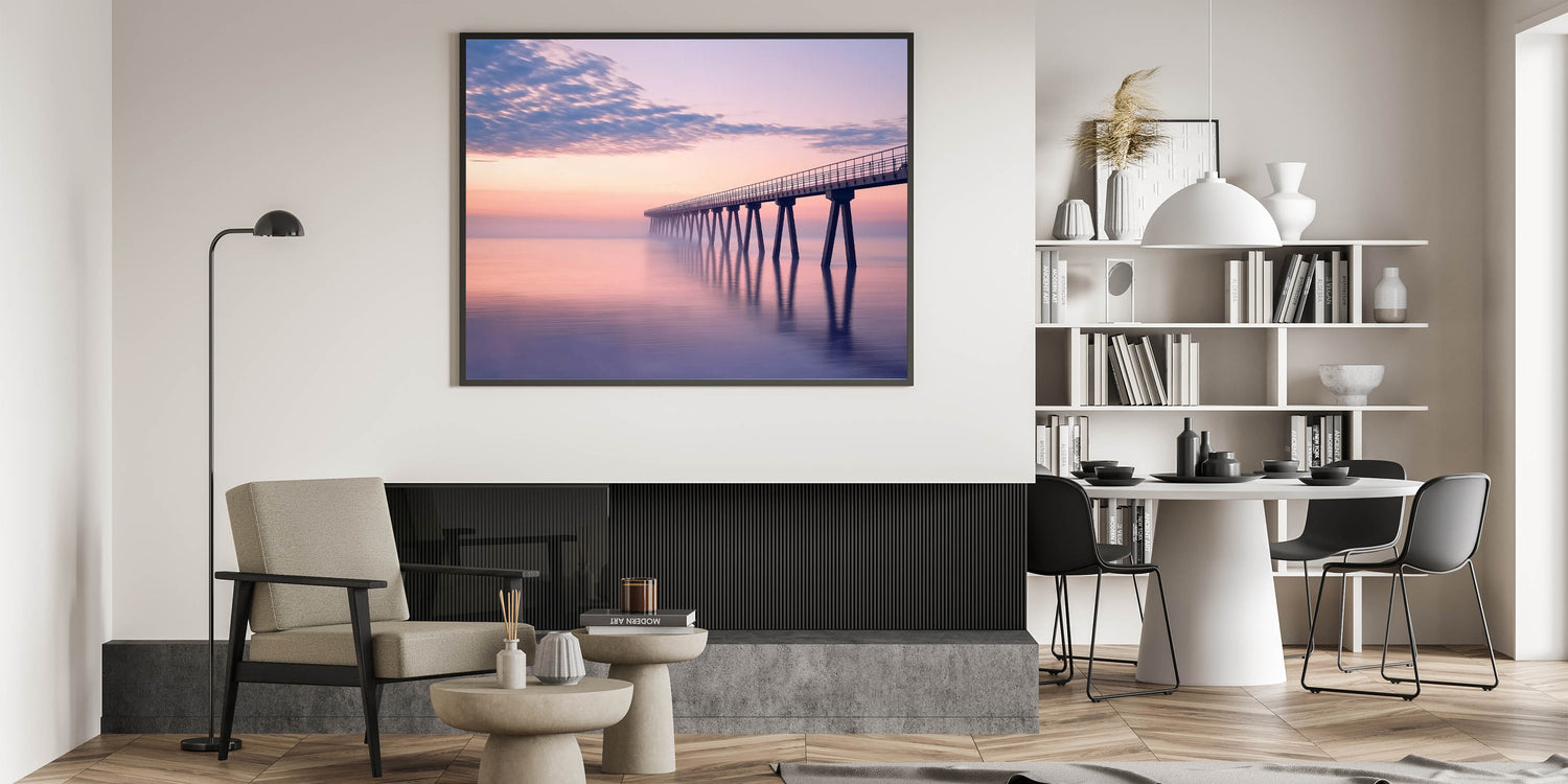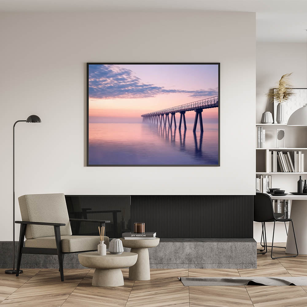 Immerse yourself in the peaceful beauty of nature with this serene pier bridge wall art. Featuring a minimalist pier stretching over calm waters under a soft pastel sunset, this artwork evokes tranquility and elegance. The delicate reflections in the water and the gentle hues of pink, peach, and lavender create a soothing visual experience. Ideal for contemporary, coastal, or serene interiors, this piece is perfect for transforming your space into a haven of relaxation.