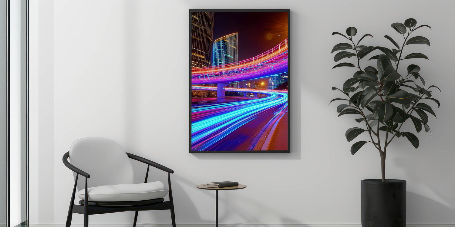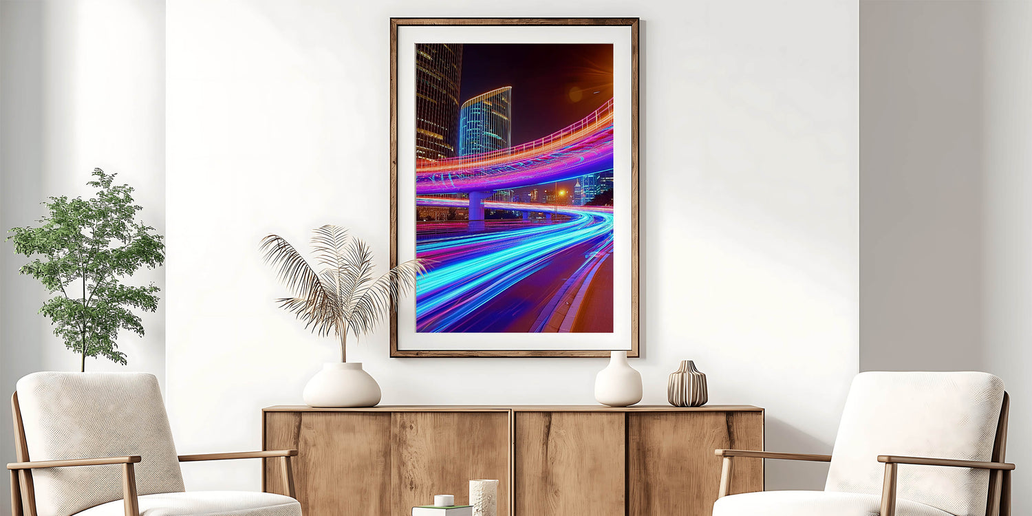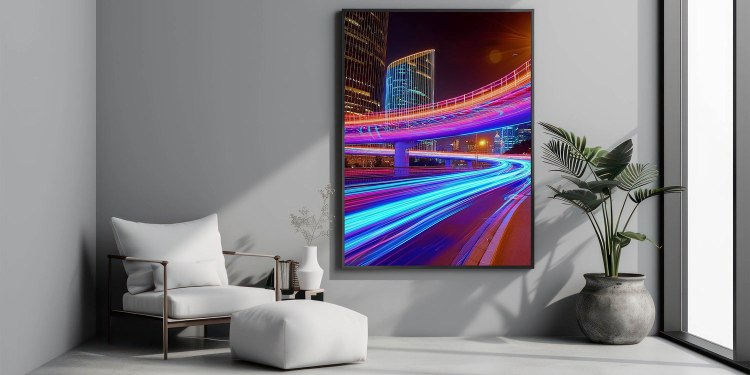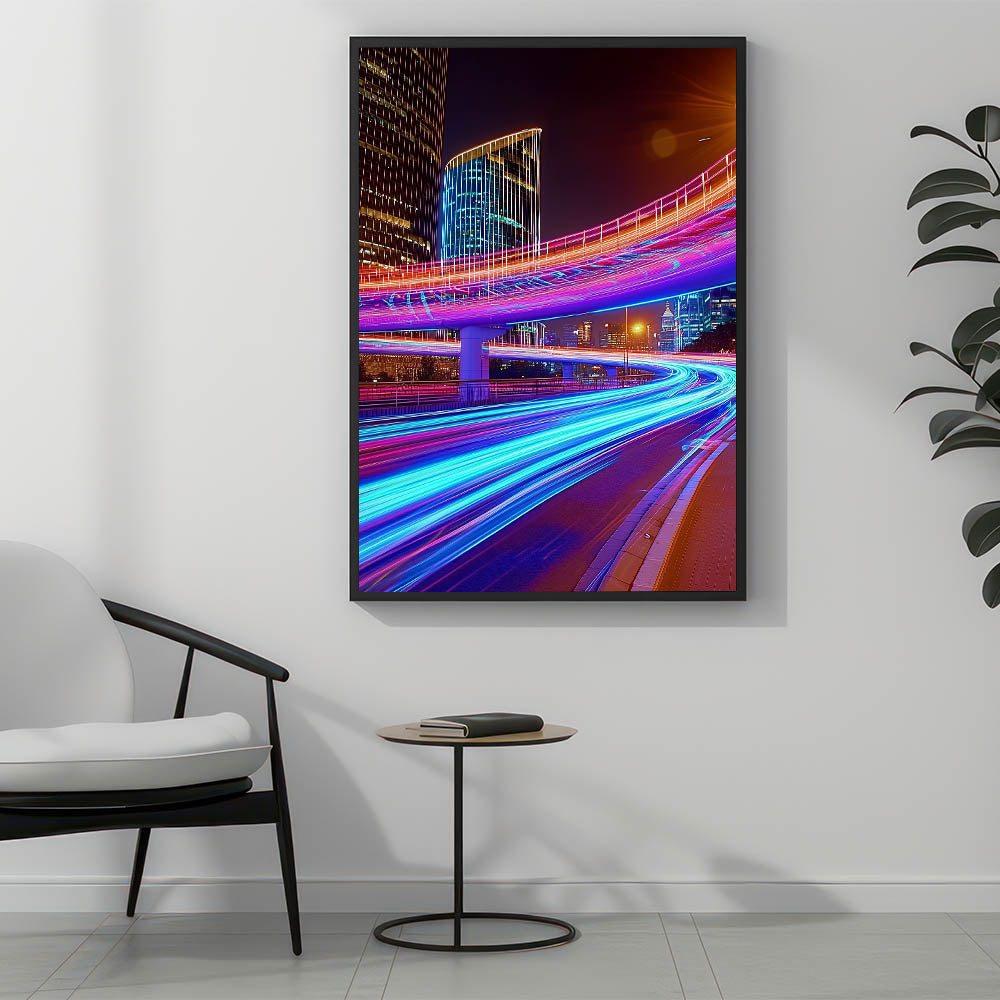 Illuminate your space with this vivid light trail urban bridge wall art. Featuring dynamic neon streaks weaving through a futuristic bridge against a cityscape backdrop, this artwork perfectly captures the energy and vibrancy of modern urban nights. With bold colors like magenta, blue, and orange lighting up the scene, it is ideal for contemporary homes, offices, or stylish interior spaces.