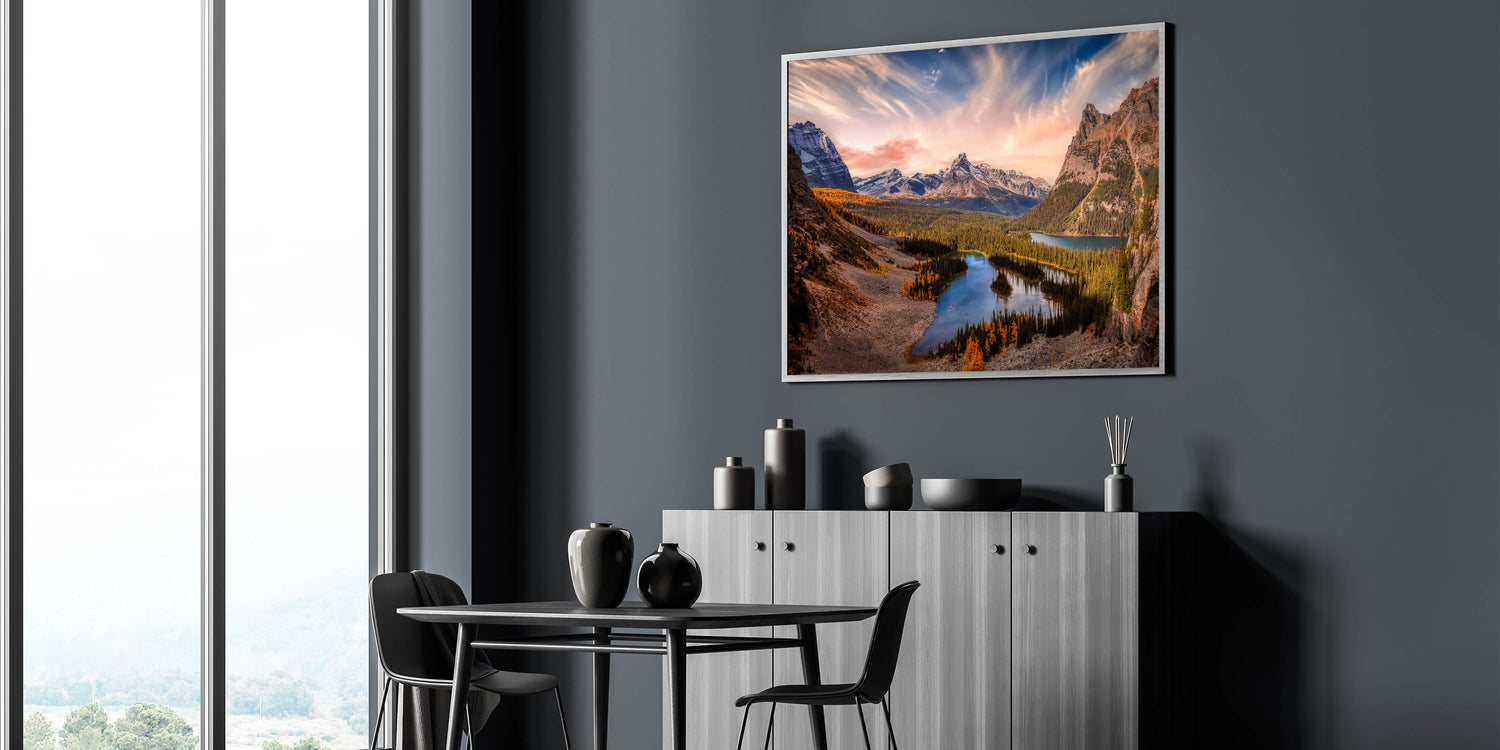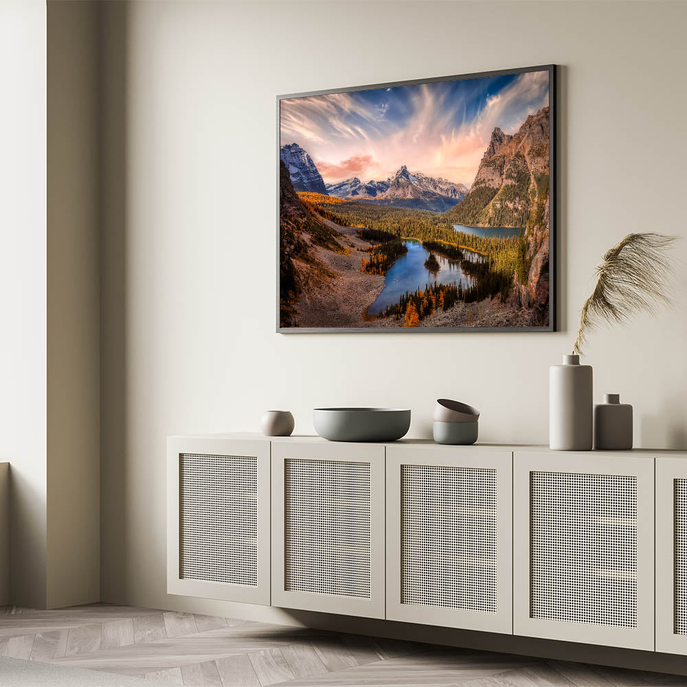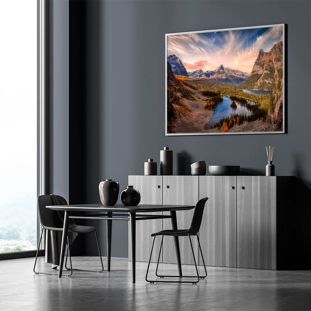 Immerse yourself in the grandeur of British Columbia’s wilderness with this stunning autumn mountain valley wall art. Featuring vibrant fall foliage, serene blue lakes, and towering mountain peaks, this breathtaking scene captures the natural beauty of Canada’s wild landscape. The warm hues of orange and yellow trees stand in contrast to the rugged mountains, creating a harmonious and captivating view. Perfect for nature lovers and those who want to bring the essence of the outdoors into their space, this artwork will make a bold statement in any room.