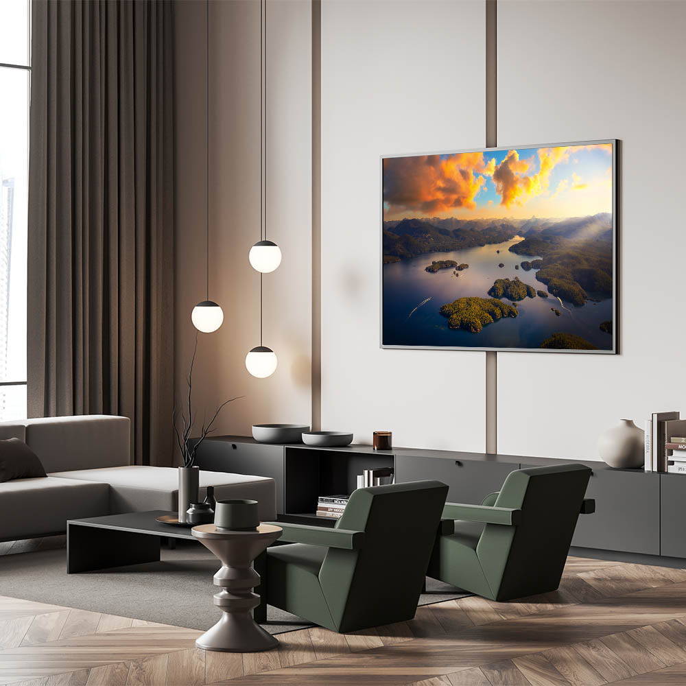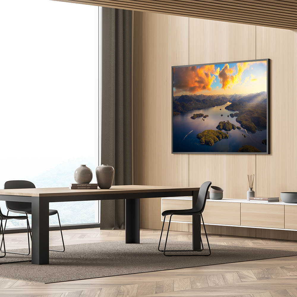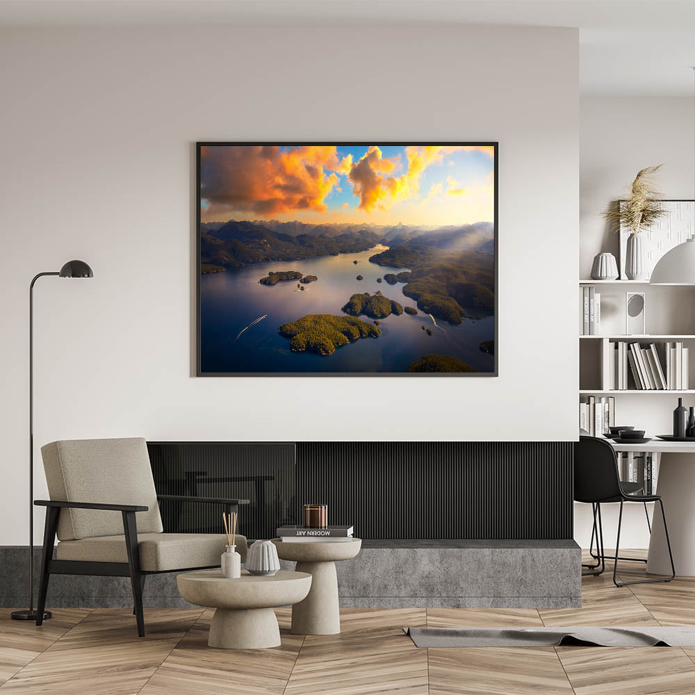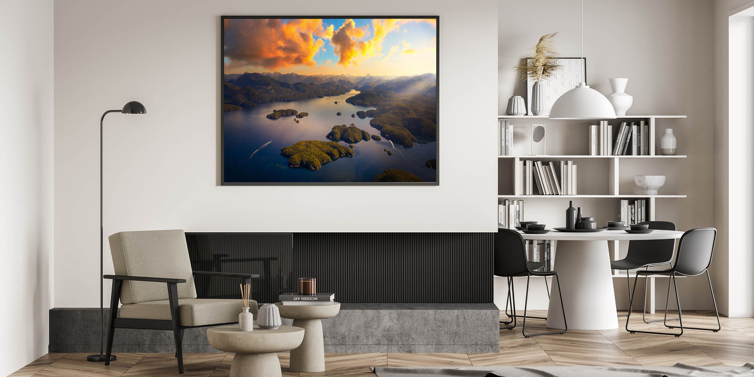 Experience the breathtaking beauty of British Columbia’s coastal islands with this captivating aerial wall art. The golden glow of the sunset illuminates the lush, green islands and winding inlets, creating a stunning contrast against the deep blue waters. This peaceful scene, with distant mountain ranges in the background, embodies the natural splendor of Canada’s Pacific coastline. Perfect for lovers of landscape photography and those looking to bring a sense of tranquility and wonder into their space.