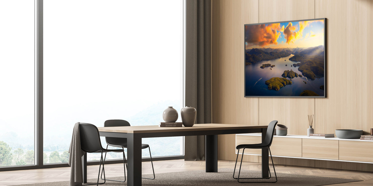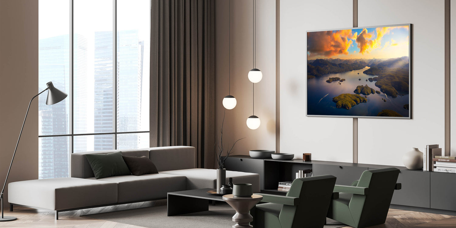 Transform your space with this unique piece of art that showcases the golden light and serene beauty of British Columbia’s coastal islands. This artwork blends perfectly with rustic, contemporary, and modern decor styles, making it a versatile choice for any setting.