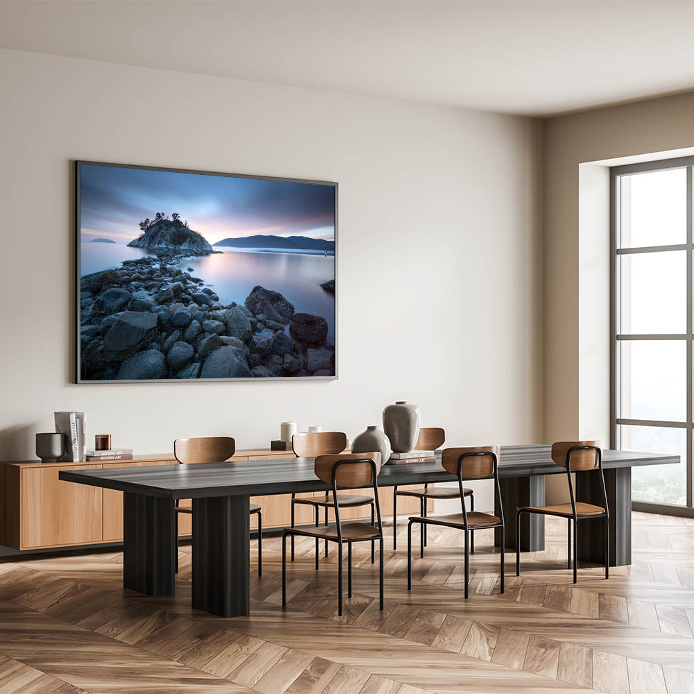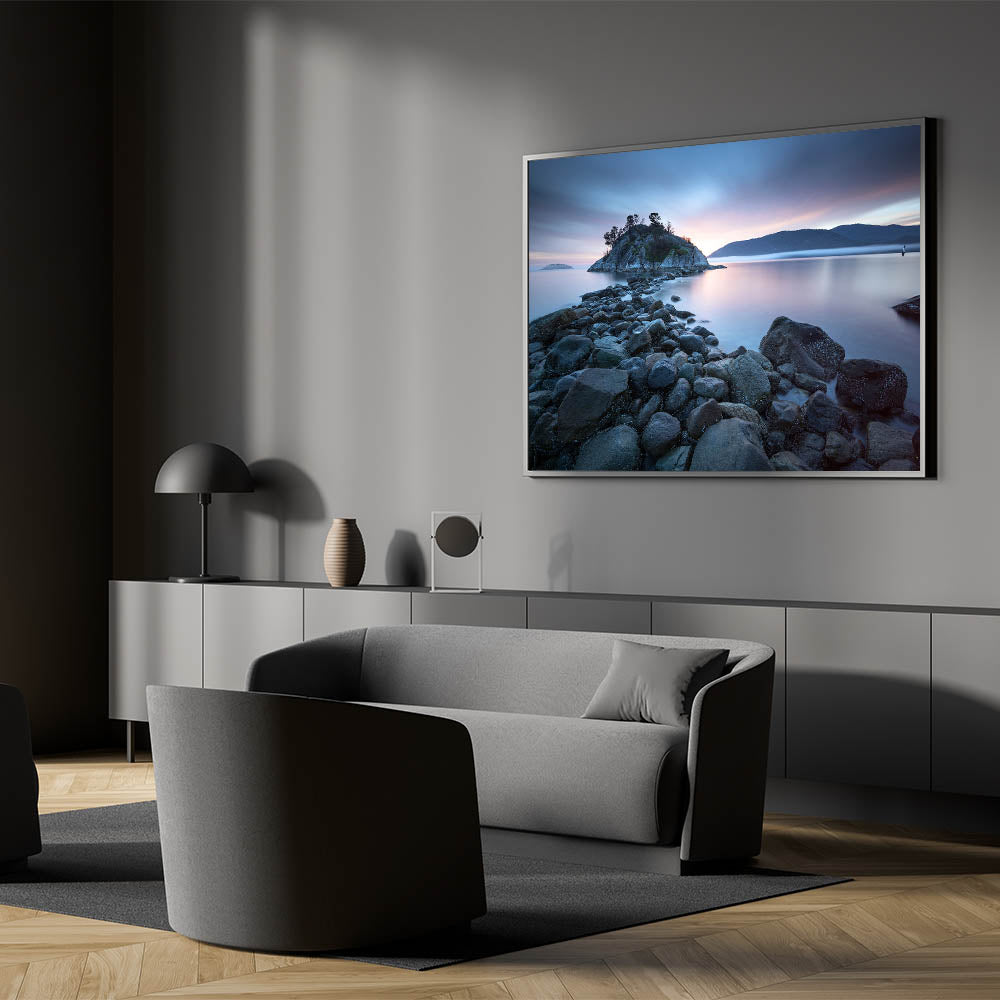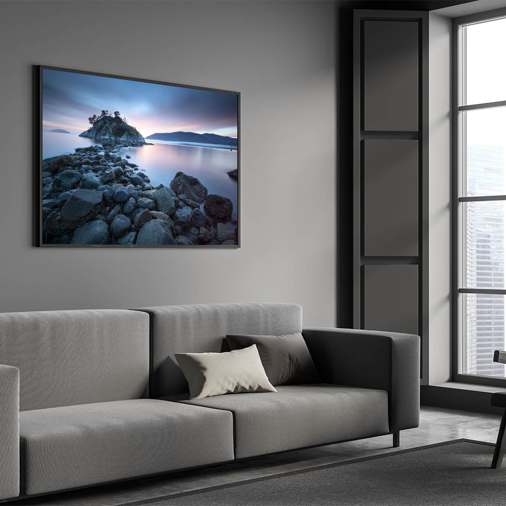 Embrace the tranquil beauty of British Columbia’s coastline with this captivating wall art. Featuring a rocky shoreline leading to a serene island bathed in the soft glow of a setting sun, this piece embodies the peacefulness of the Pacific Northwest. The calm waters, muted sky, and distant mountains create a soothing scene, making it a perfect addition to any room that seeks to capture the essence of nature’s quiet moments.