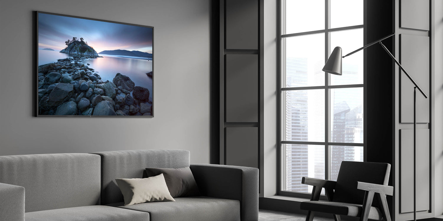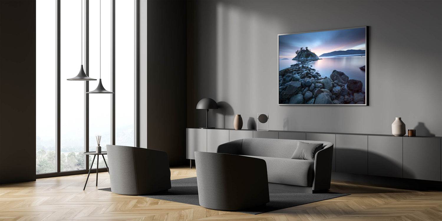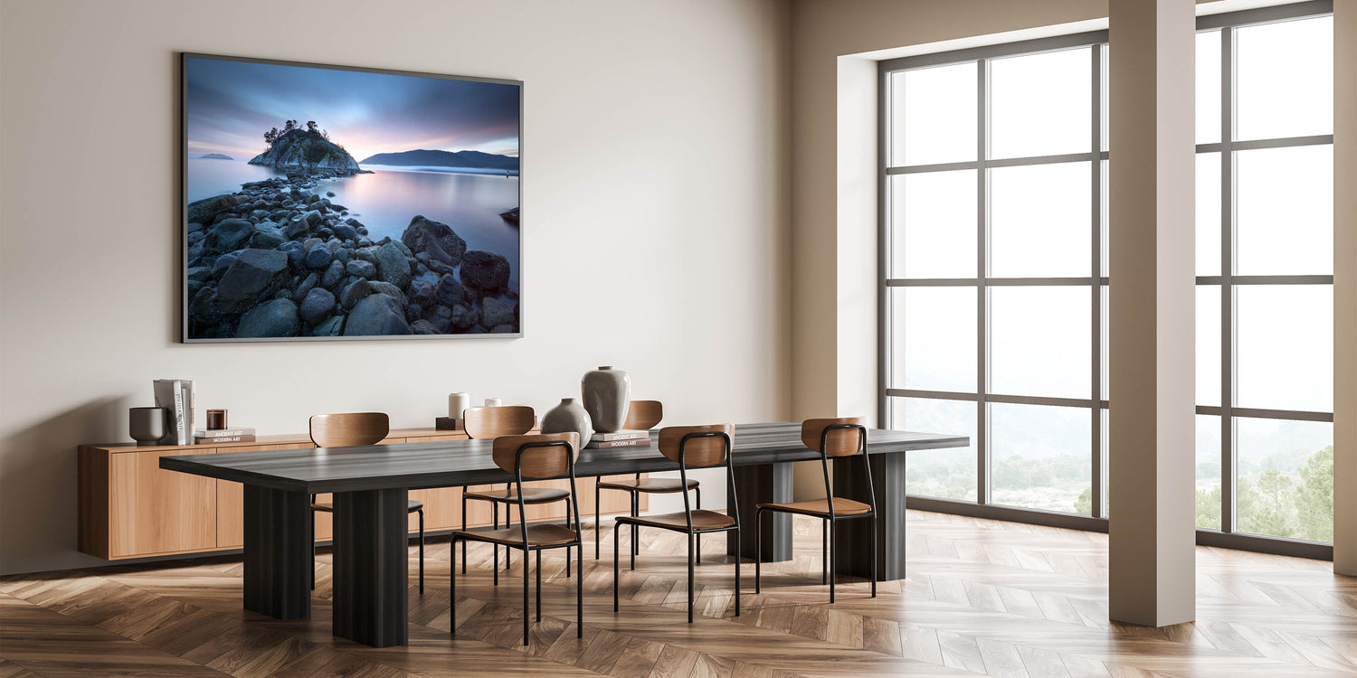 Embrace the tranquil beauty of British Columbia’s coastline with this captivating wall art. Featuring a rocky shoreline leading to a serene island bathed in the soft glow of a setting sun, this piece embodies the peacefulness of the Pacific Northwest. The calm waters, muted sky, and distant mountains create a soothing scene, making it a perfect addition to any room that seeks to capture the essence of nature’s quiet moments.